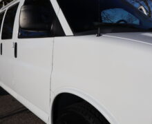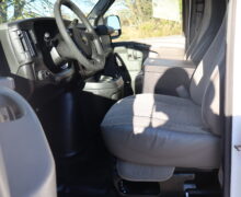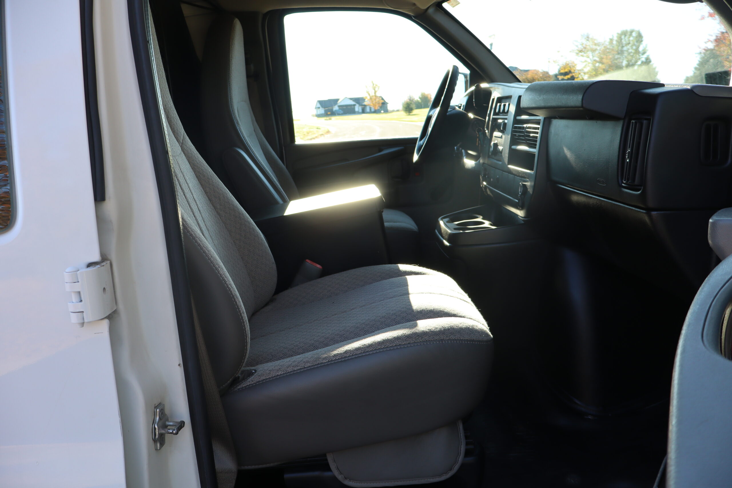 Exterior is Summit White, Interior is Very Dark Gray, bucket seats in front, traction control, air conditioning, AM/FM stereo, driver’s information center, automatic head lamps, compass/temperature/mileage display and hinged side door.