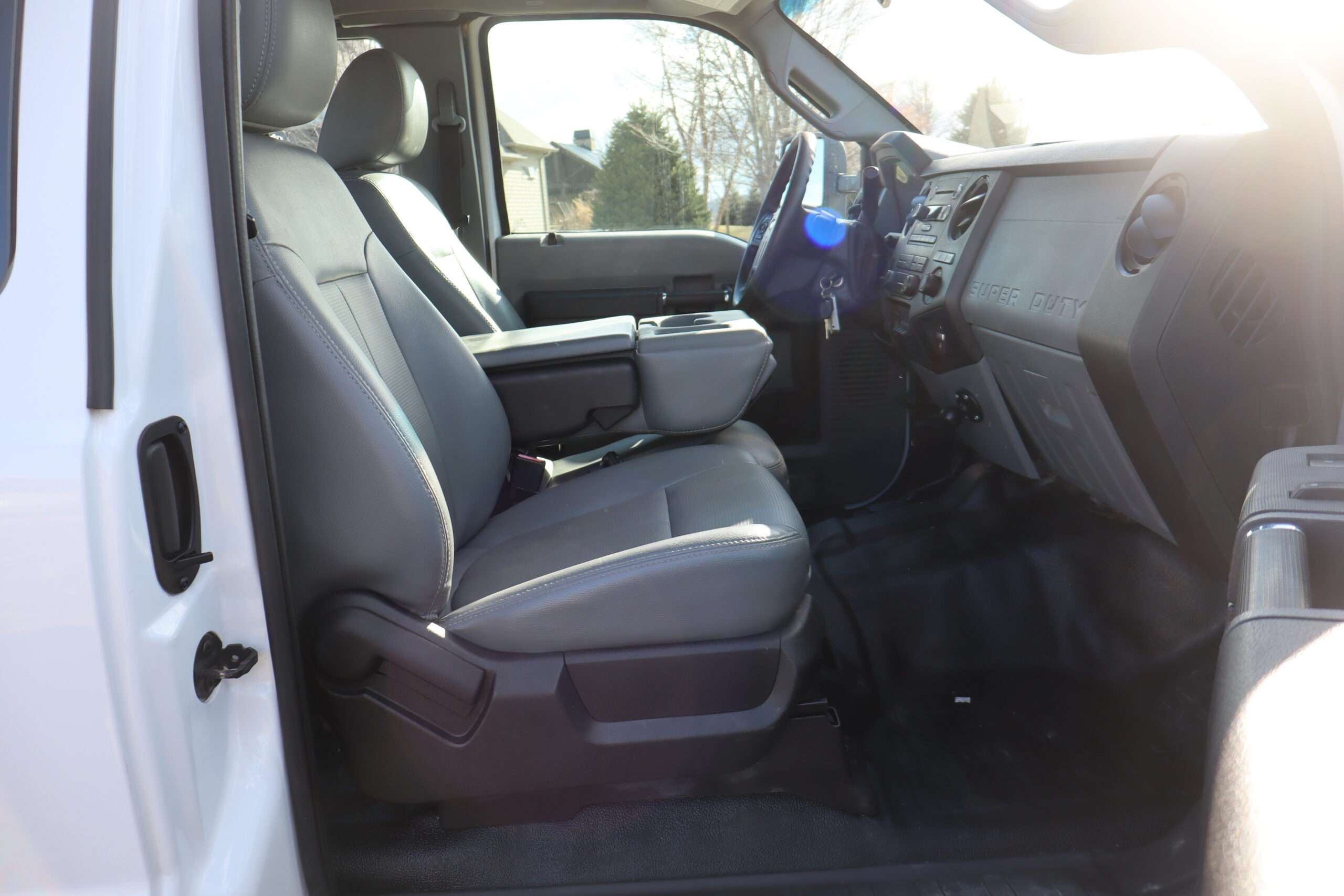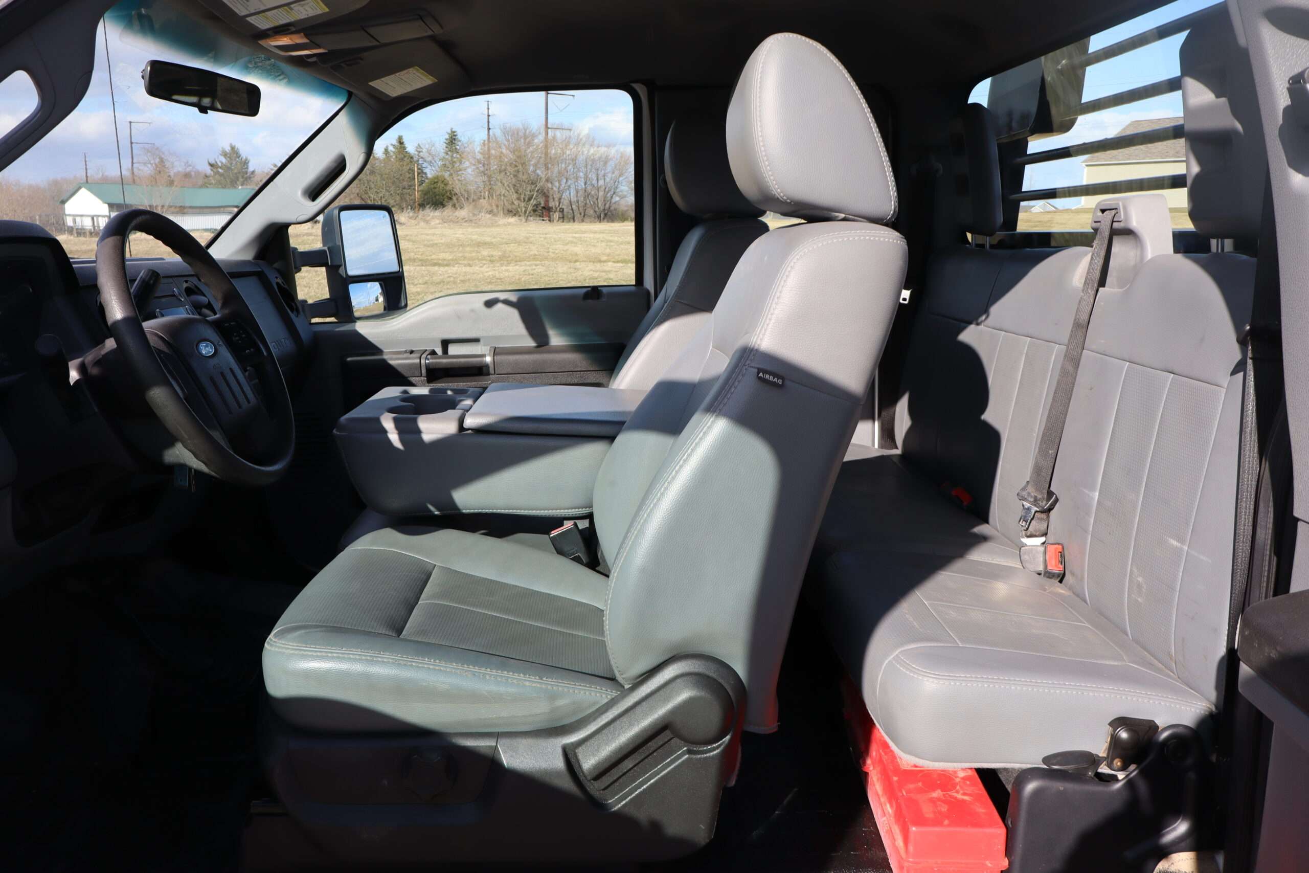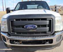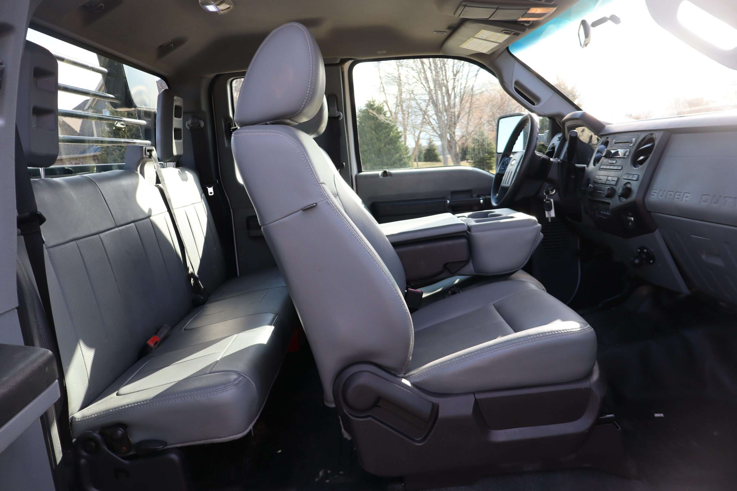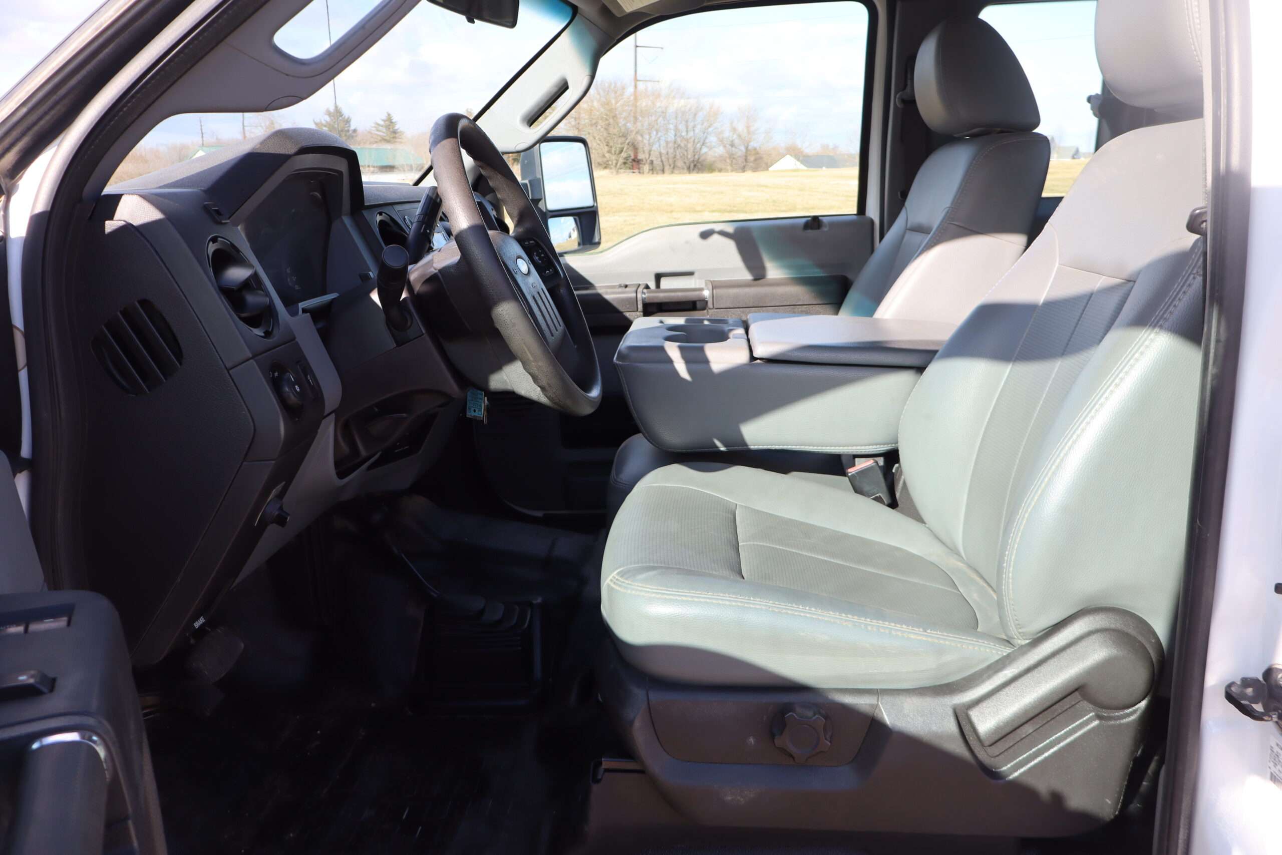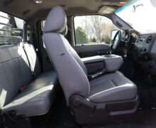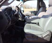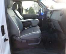Exterior is Oxford White, Interior is Heavy Duty Gray vinyl, 40/20/40 seats with folding center console and storage compartment, 60/40 rear folding bench, power windows and power door locks, tilt and telescoping wheel, cruise control, air conditioning, AM/FM stereo, CD player, MP3 player, SYNC, multi-function steering wheel controls, compass/temperature/mileage display in dash, remote entry, traction control, up-fitter switches, side air bags, power/heated tow mirrors with manual telescoping and marker lights, cab clearance lights, day/night rear view mirror, dual power point, extra heavy duty front suspension, transmission take off prep, tow package with receiver and trailer wiring and factory electronic brake controller.