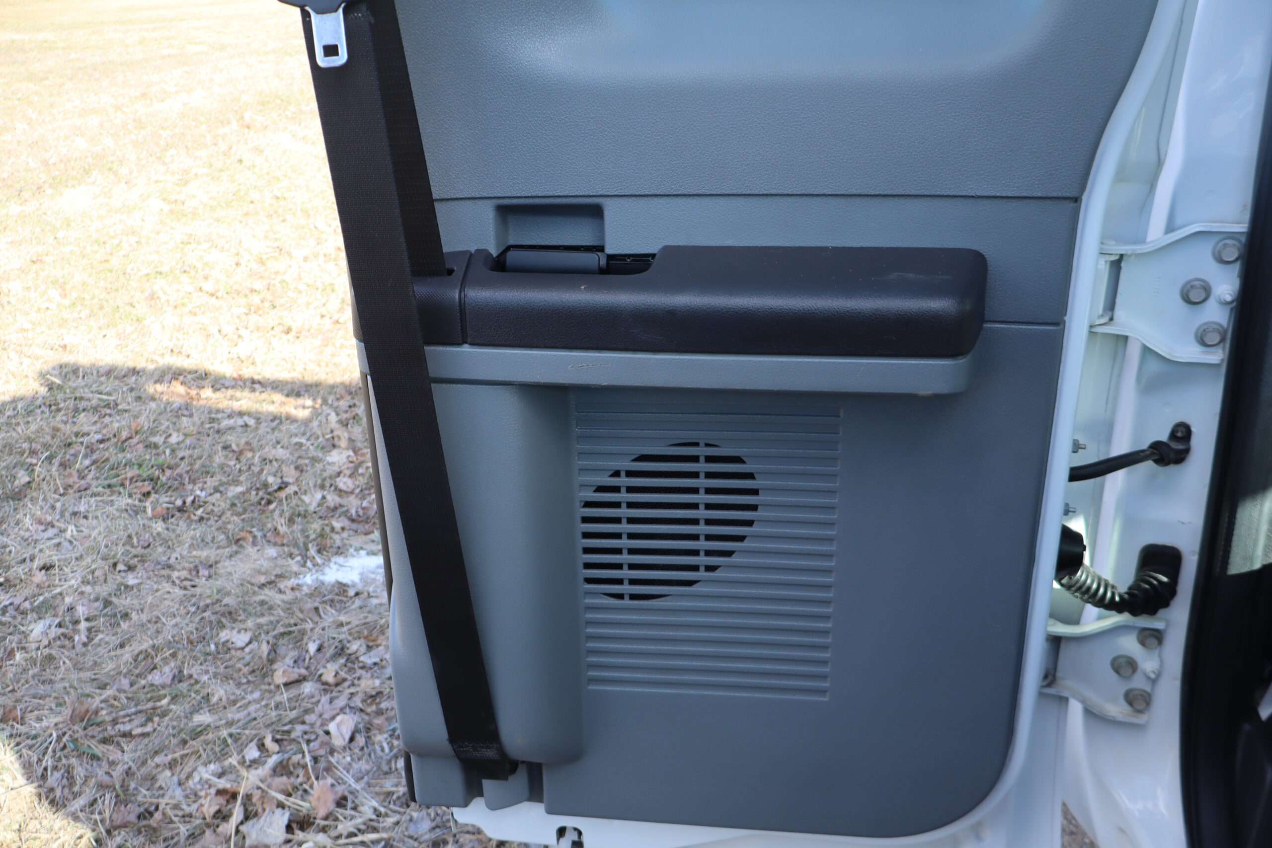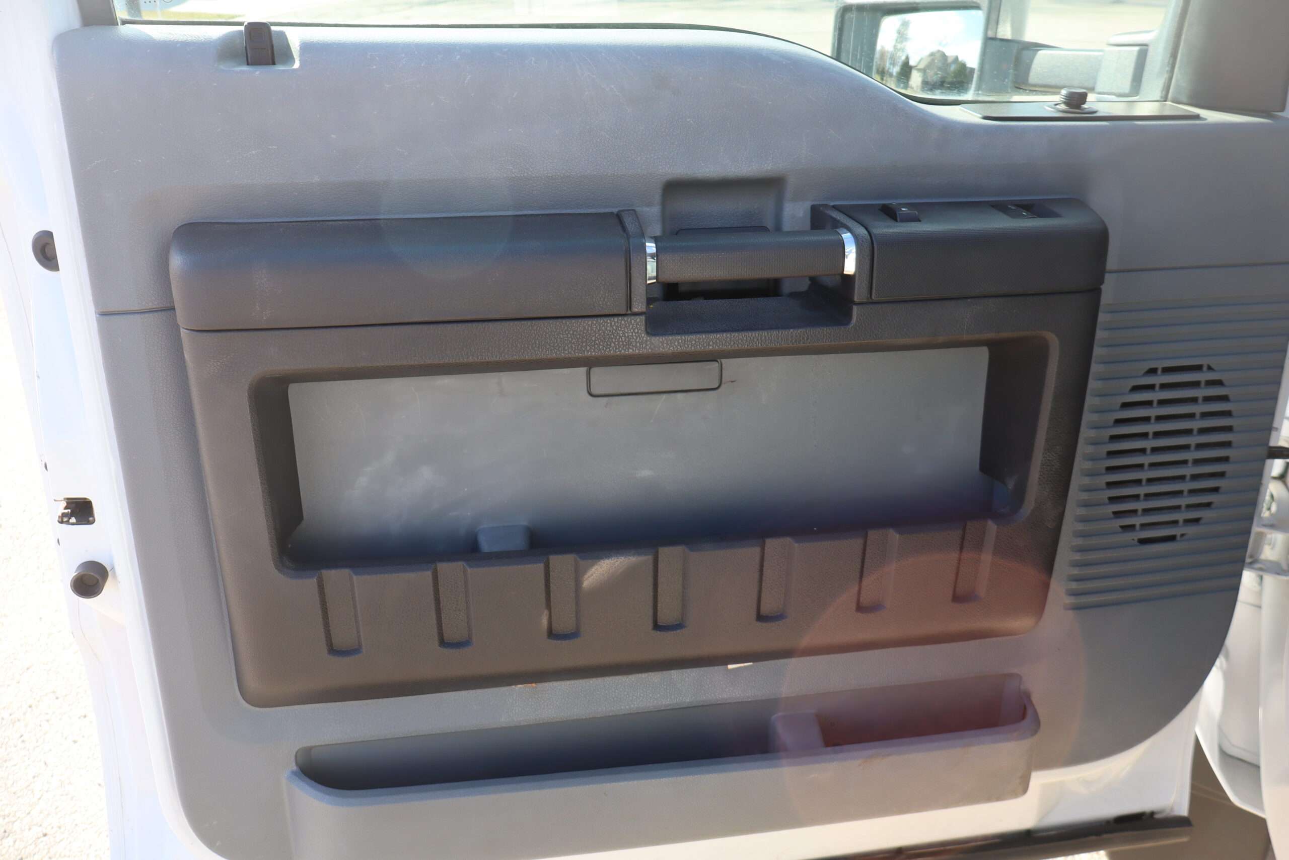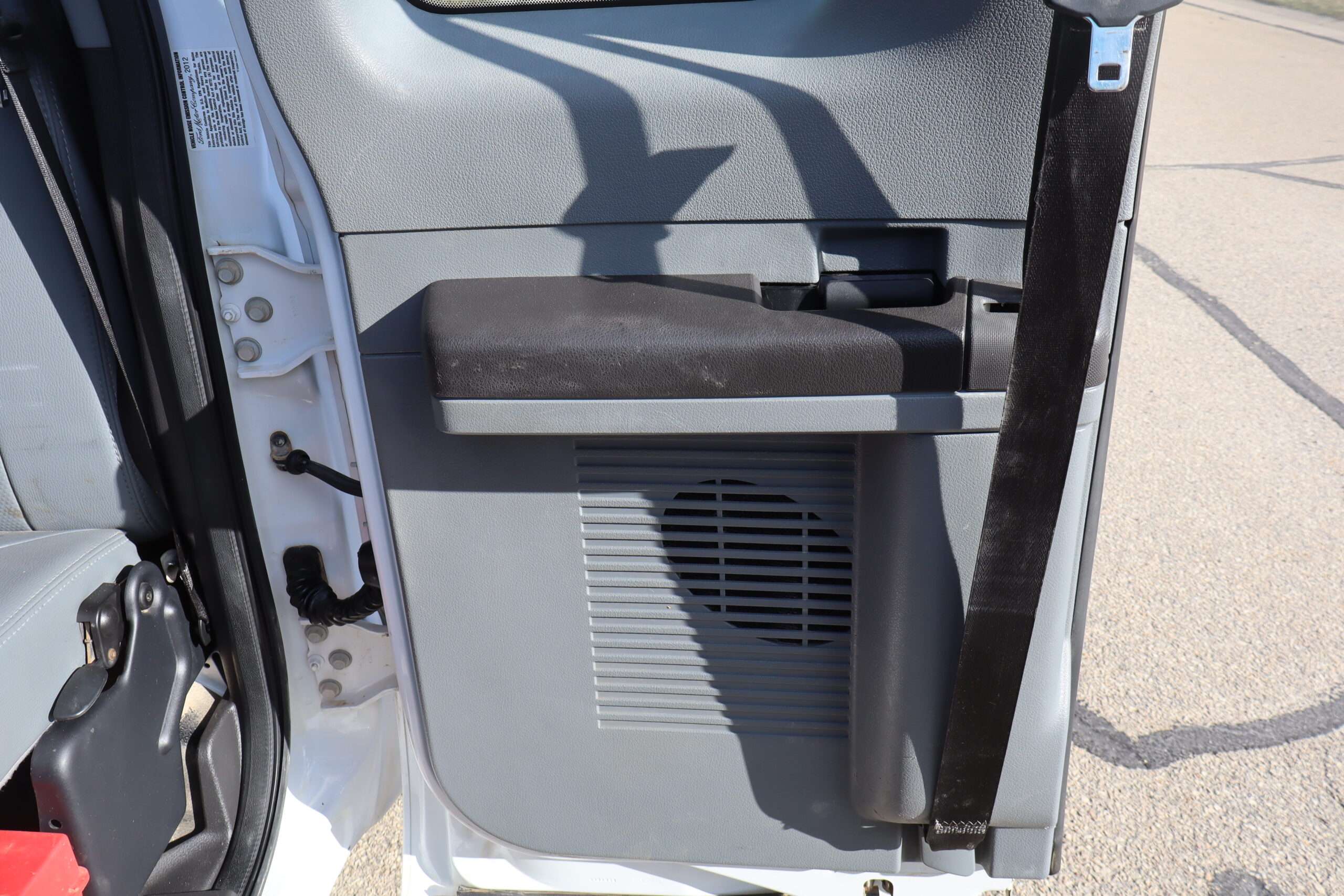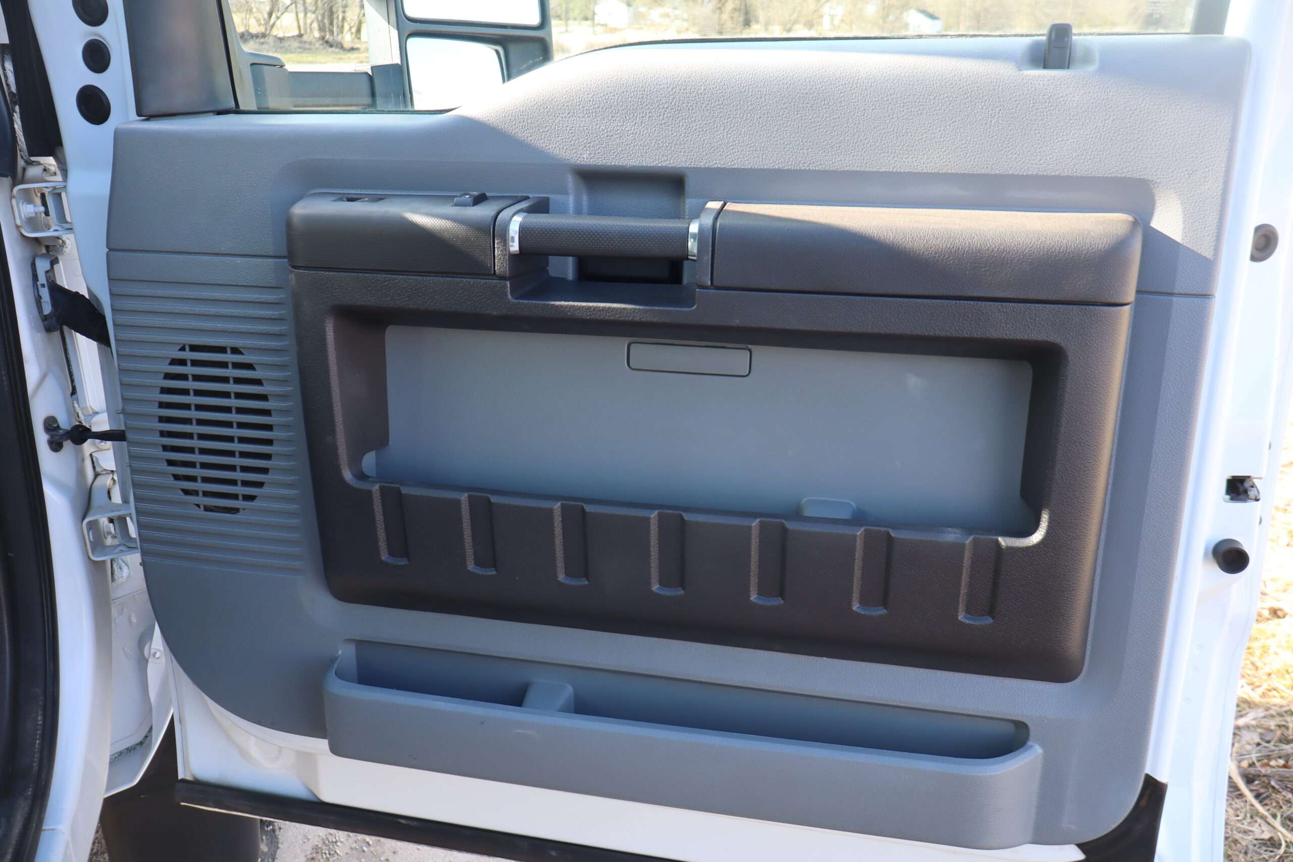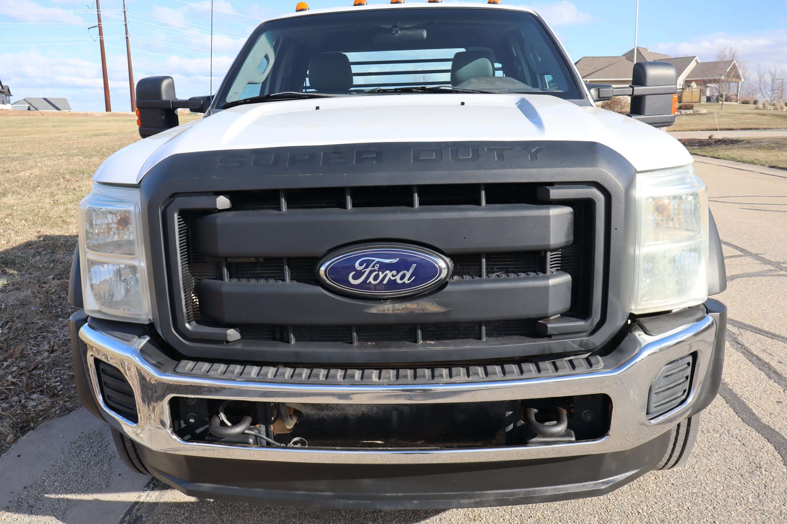 Exterior is Oxford White, Interior is Heavy Duty Gray vinyl, 40/20/40 seats with folding center console and storage compartment, 60/40 rear folding bench, power windows and power door locks, tilt and telescoping wheel, cruise control, air conditioning, AM/FM stereo, CD player, MP3 player, SYNC, multi-function steering wheel controls, compass/temperature/mileage display in dash, remote entry, traction control, up-fitter switches, side air bags, power/heated tow mirrors with manual telescoping and marker lights, cab clearance lights, day/night rear view mirror, dual power point, extra heavy duty front suspension, transmission take off prep, tow package with receiver and trailer wiring and factory electronic brake controller.