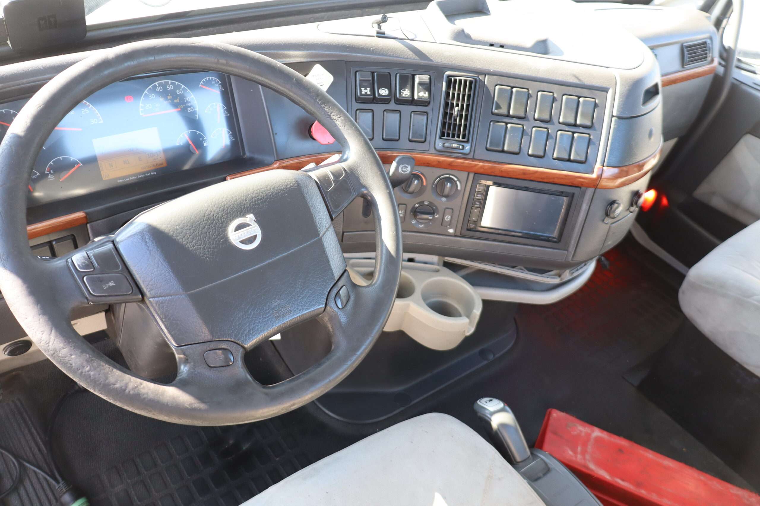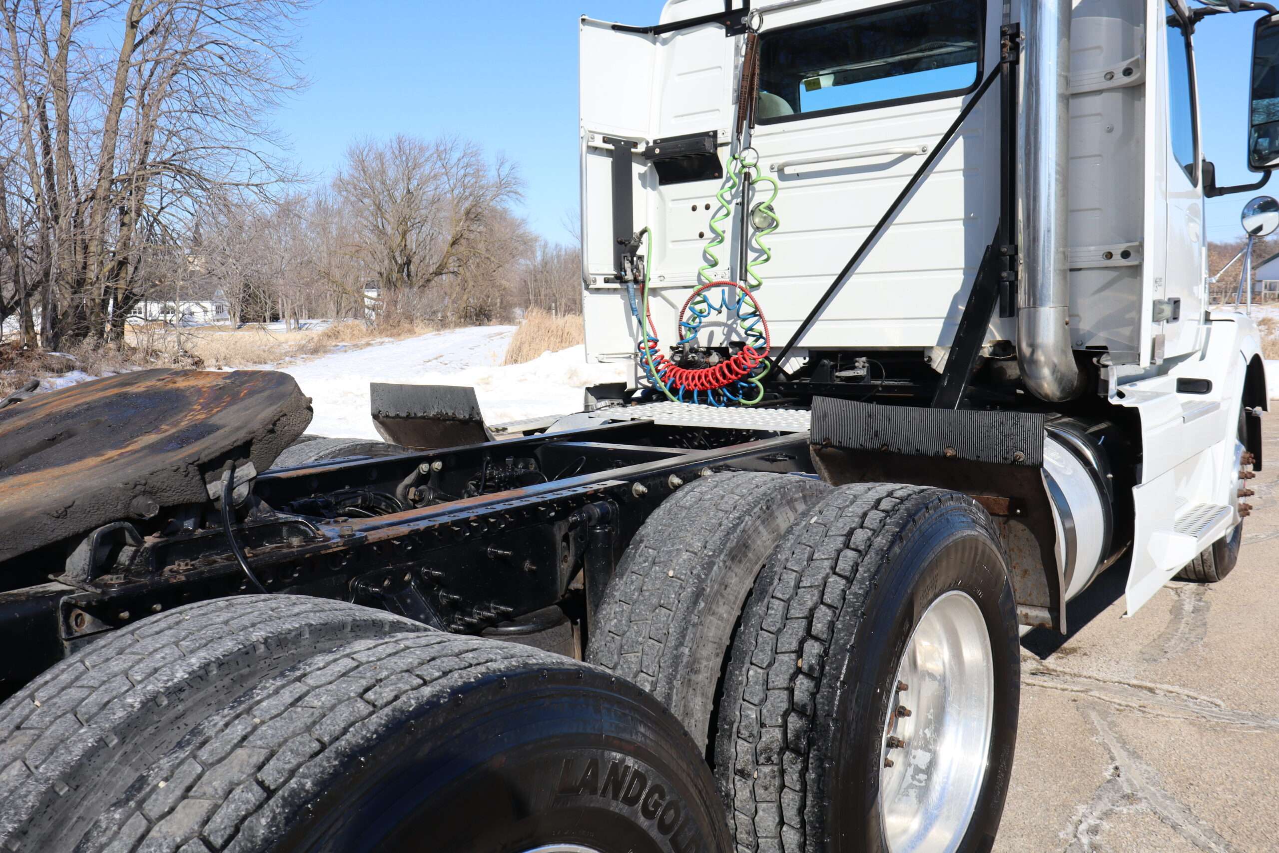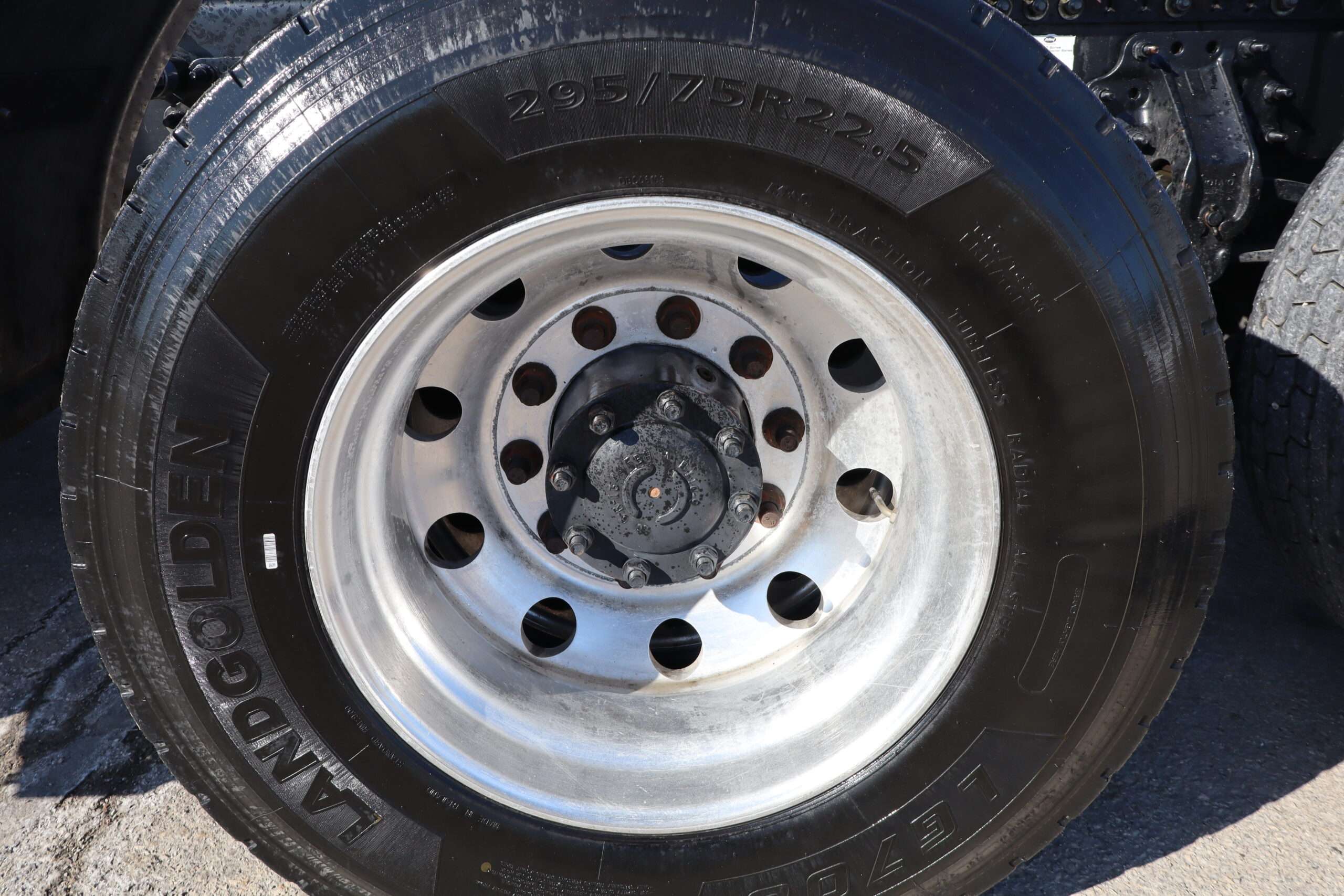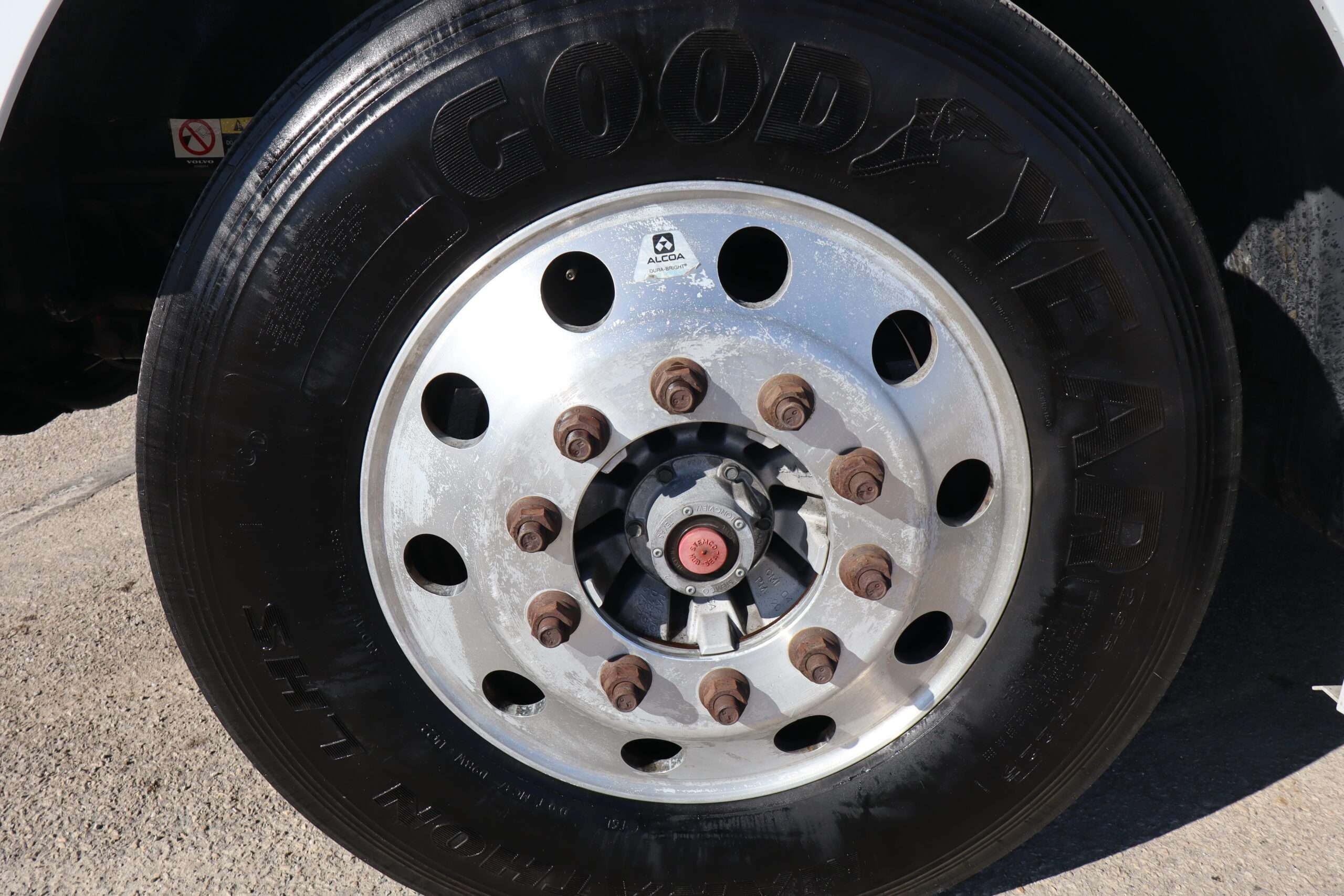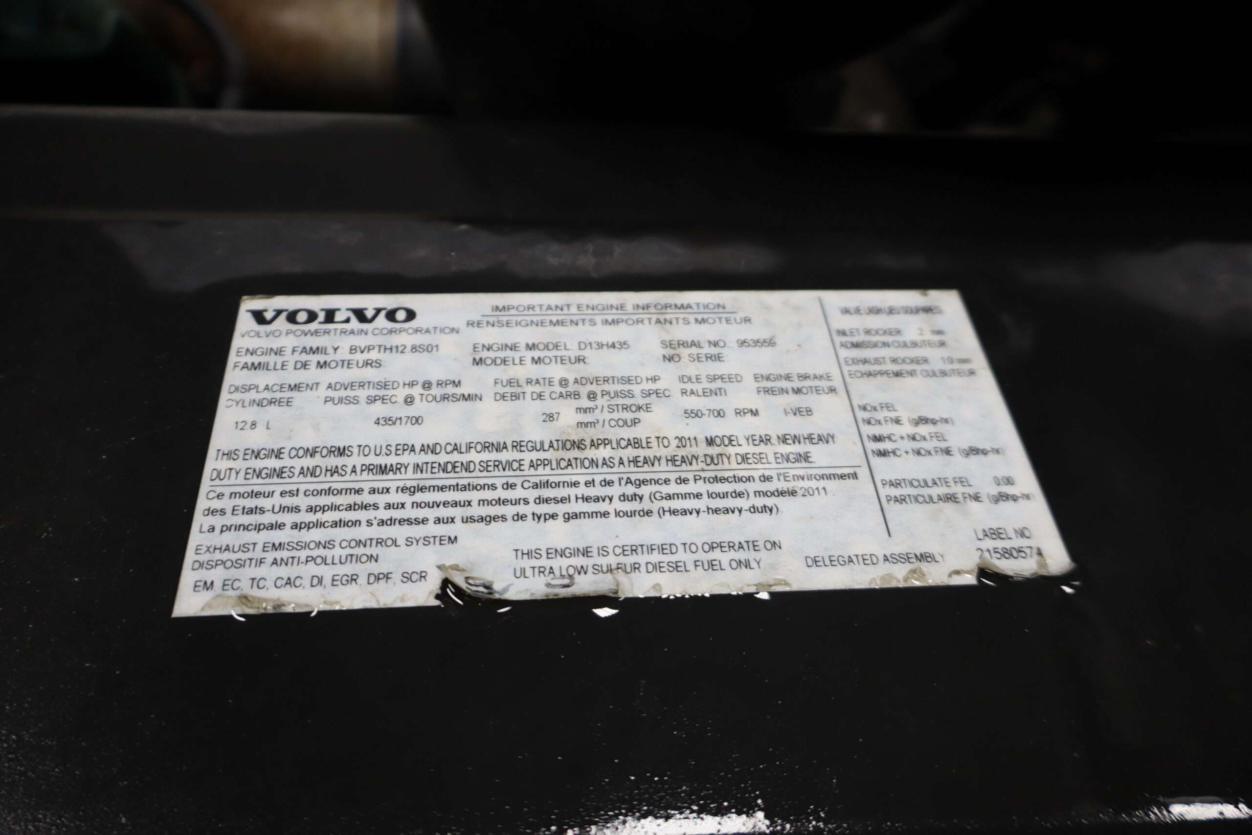 Motor is Volvo D13 (435hp), I shift 12-speed automatic transmission, hand trailer brake, locking diff with 3.42 gears, 22.5 Alcoa polished aluminum wheels, 295/75R22.5 tires.