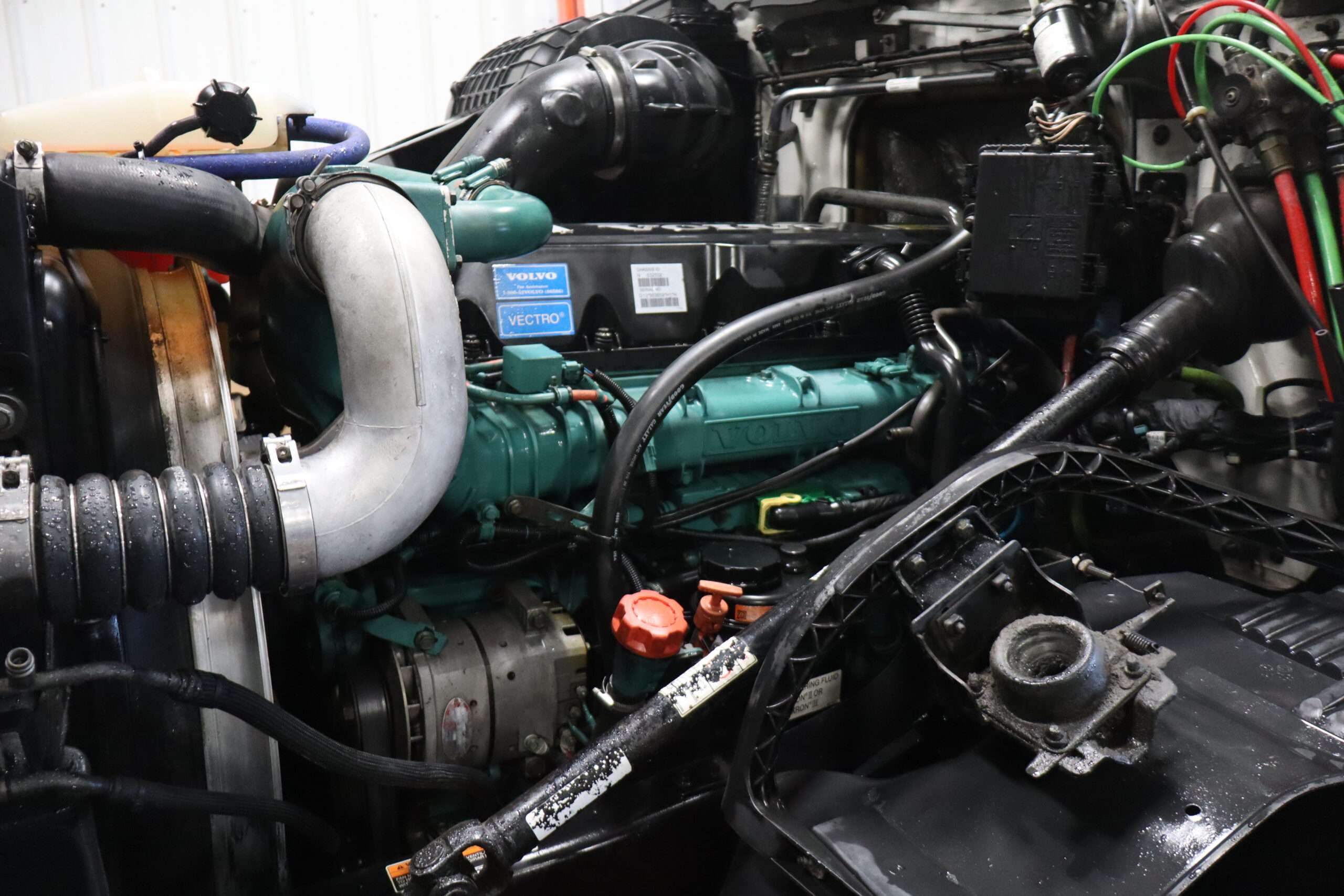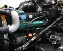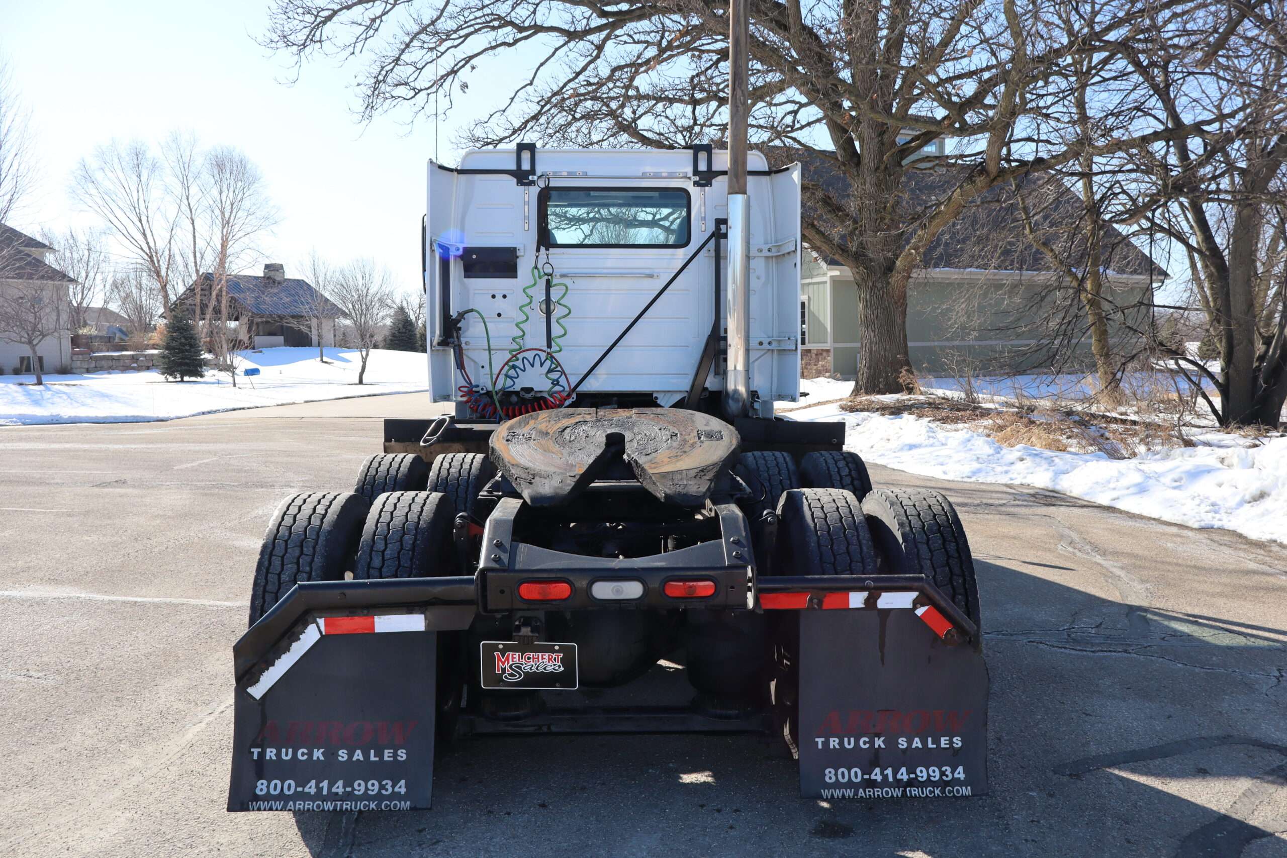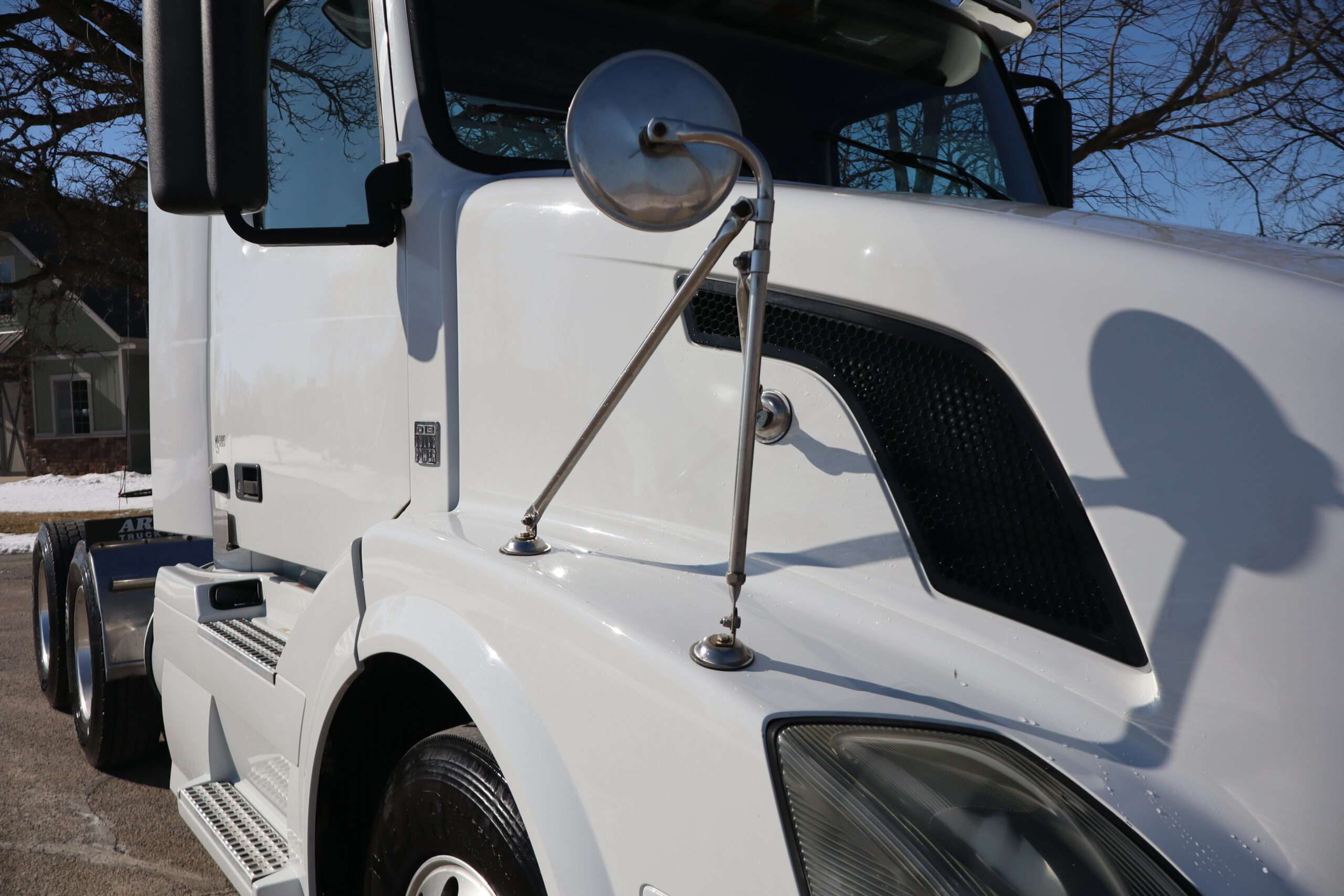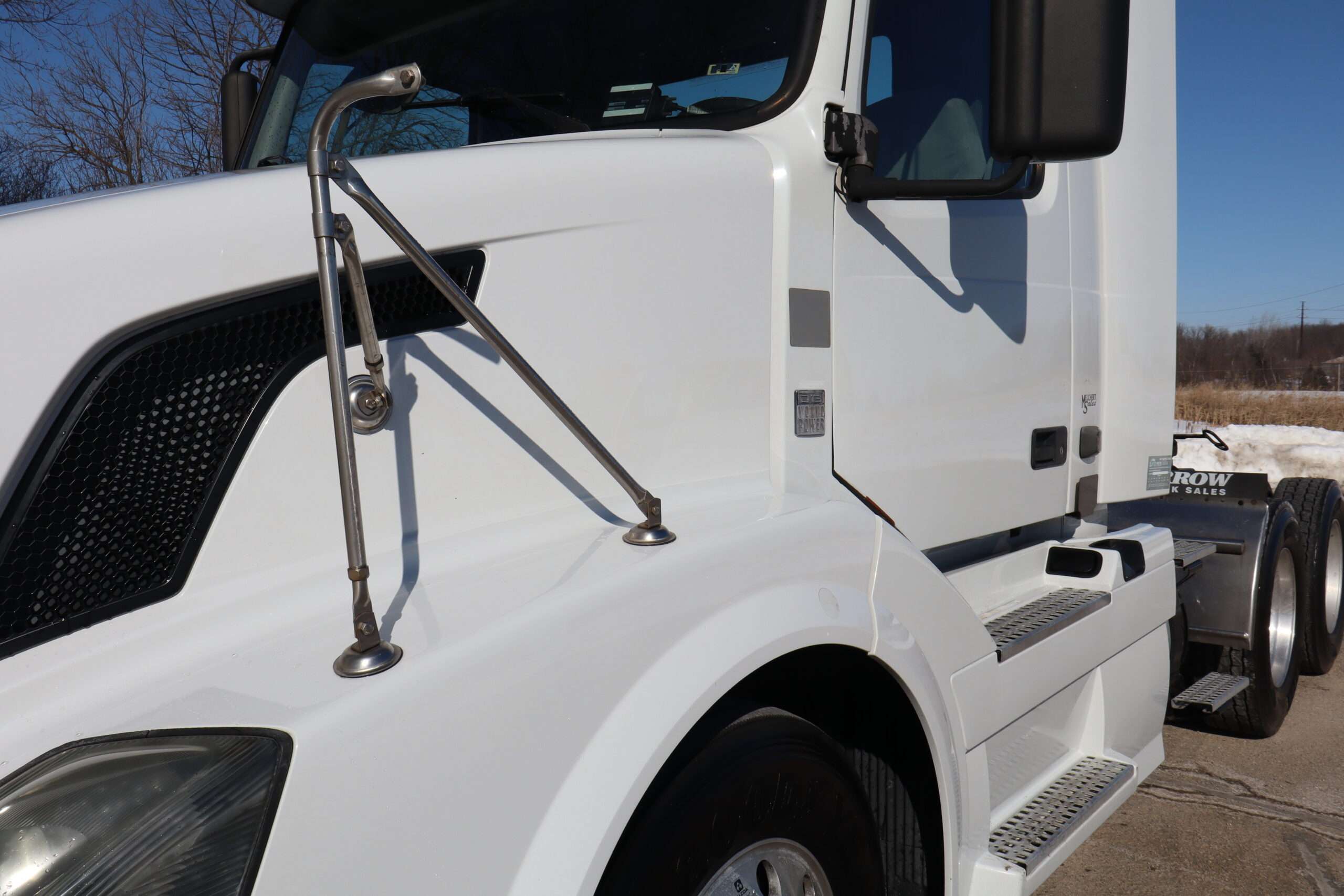 Motor is Volvo D13 (435hp), I shift 12-speed automatic transmission, hand trailer brake, locking diff with 3.42 gears, 22.5 Alcoa polished aluminum wheels, 295/75R22.5 tires.