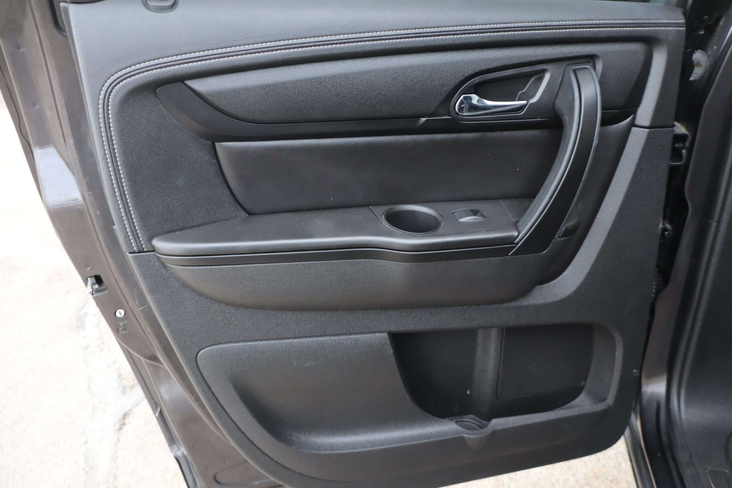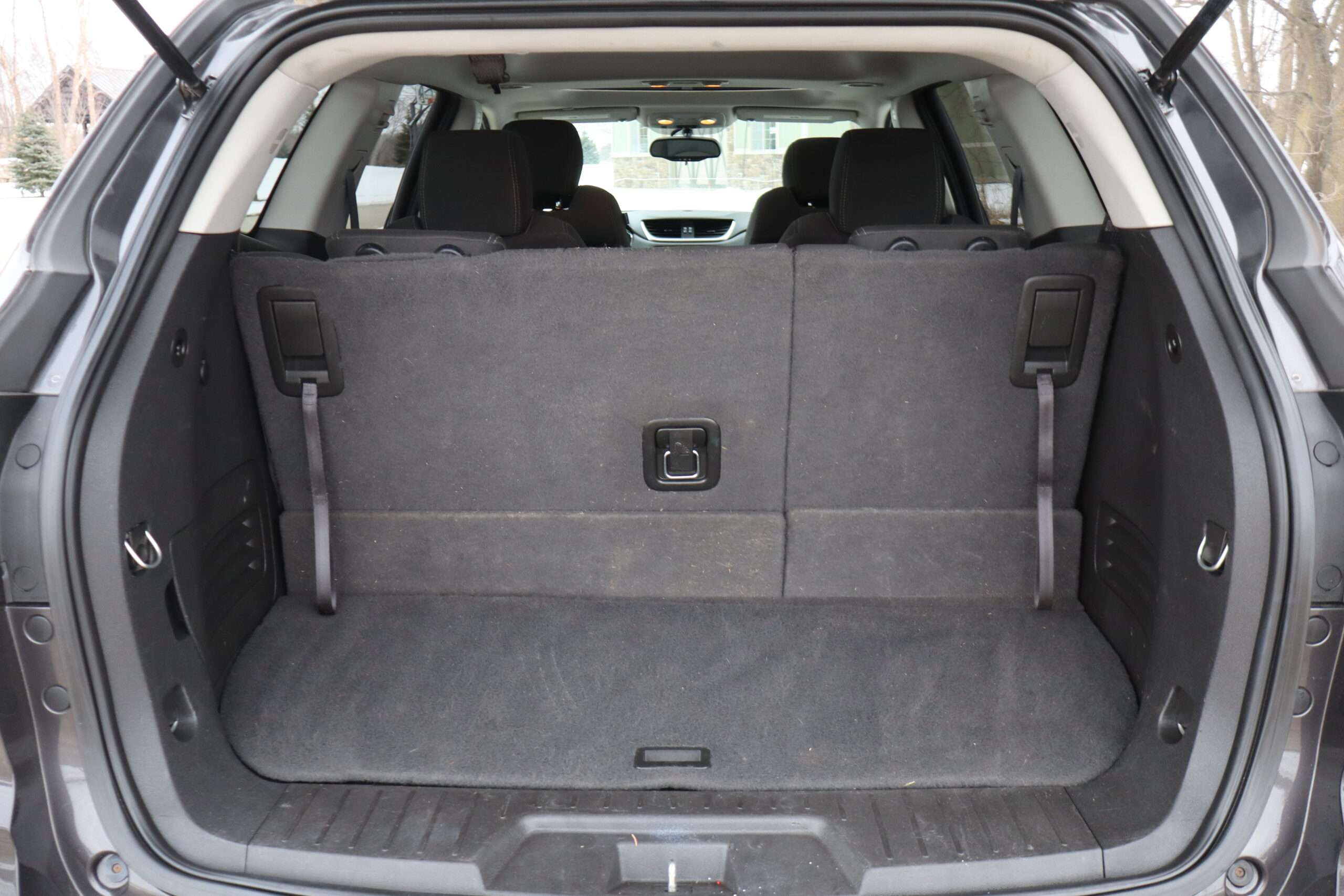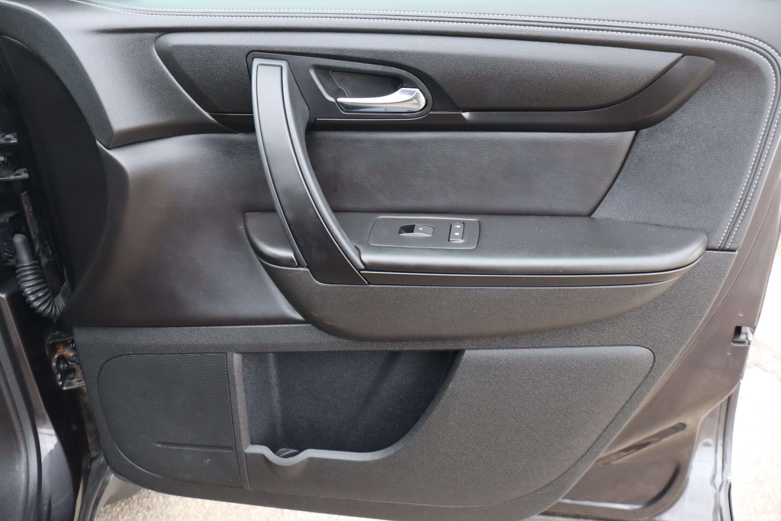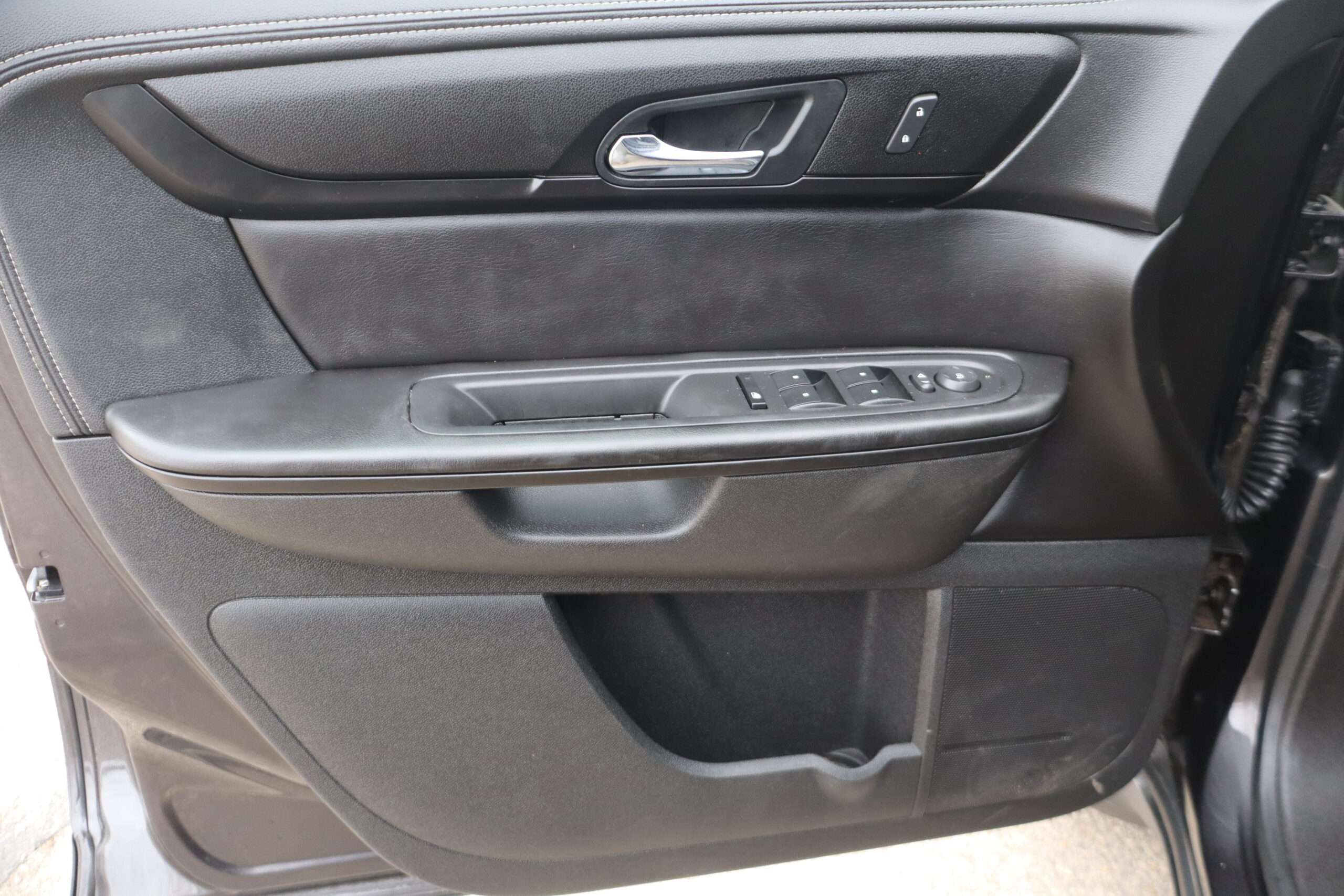 Exterior is Iridium Metallic, Interior is Black cloth, heated bucket seats in front with center console, 8-way power driver’s seat with power lumbar, traction control, 2nd row is quad seating, folding split 3rd row, power windows and power door locks, tilt and telescoping wheel, cruise control, air conditioning, electric rear window defrost, 7″ color My Link touch screen, AM/FM stereo, CD player, MP3 player, XM satellite radio ready, back up camera, parking assist, OnStar, multi-function steering wheel controls, power point, compass/temperature/mileage display, day/night rear view mirror, driver’s information center, universal garage door, power/heated outside mirrors with blinkers, fog lights, dark tinted glass, remote entry, remote start, side air bags, tow package with receiver.