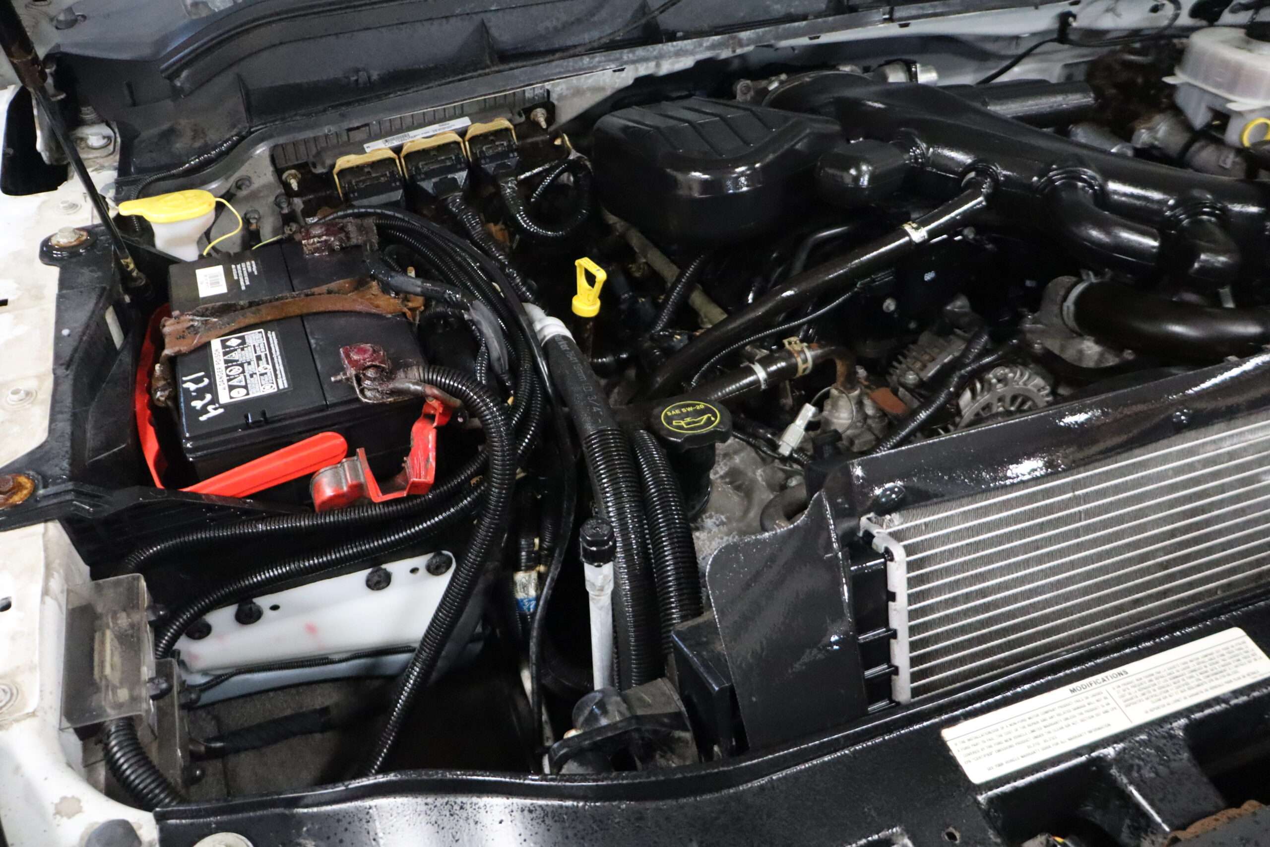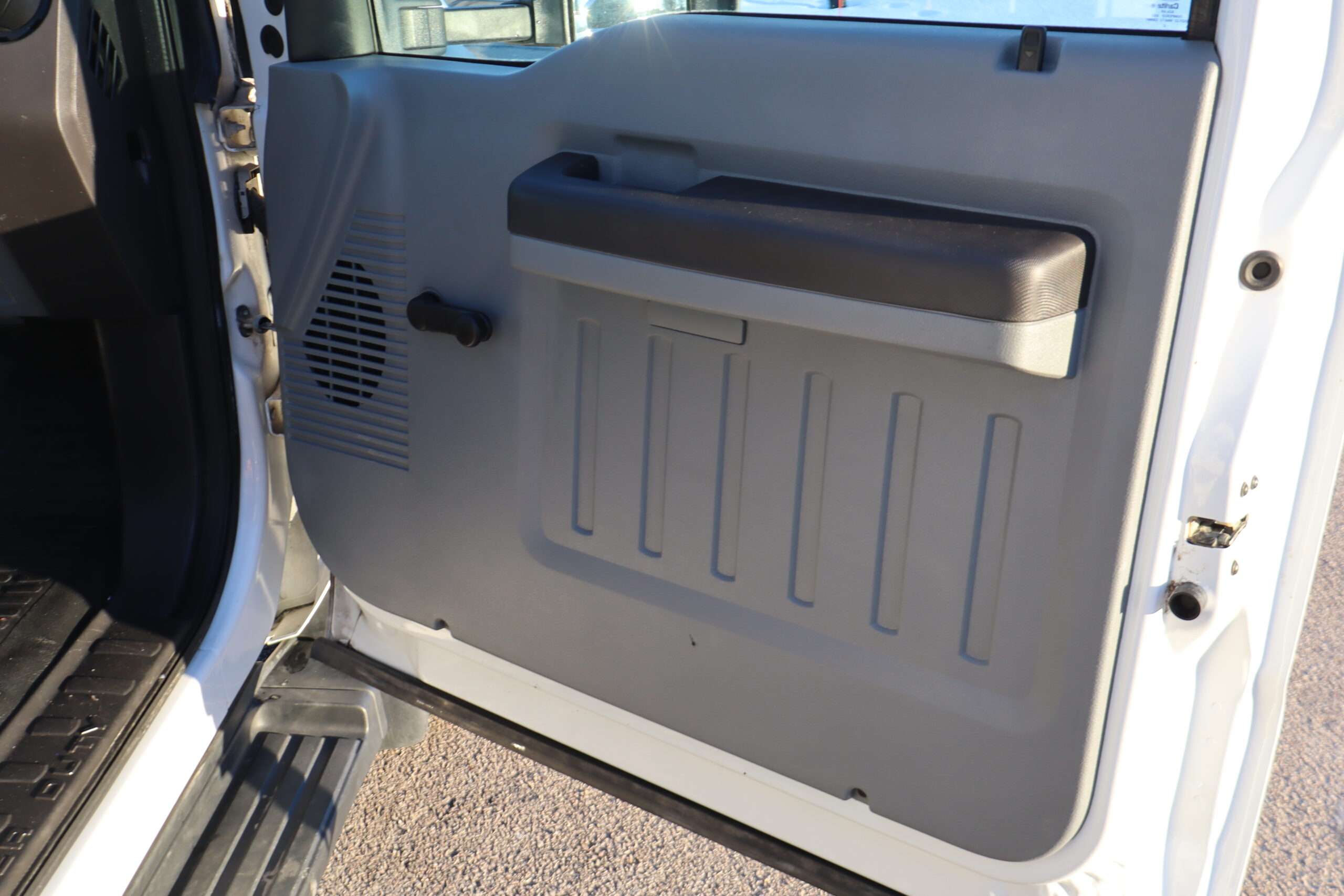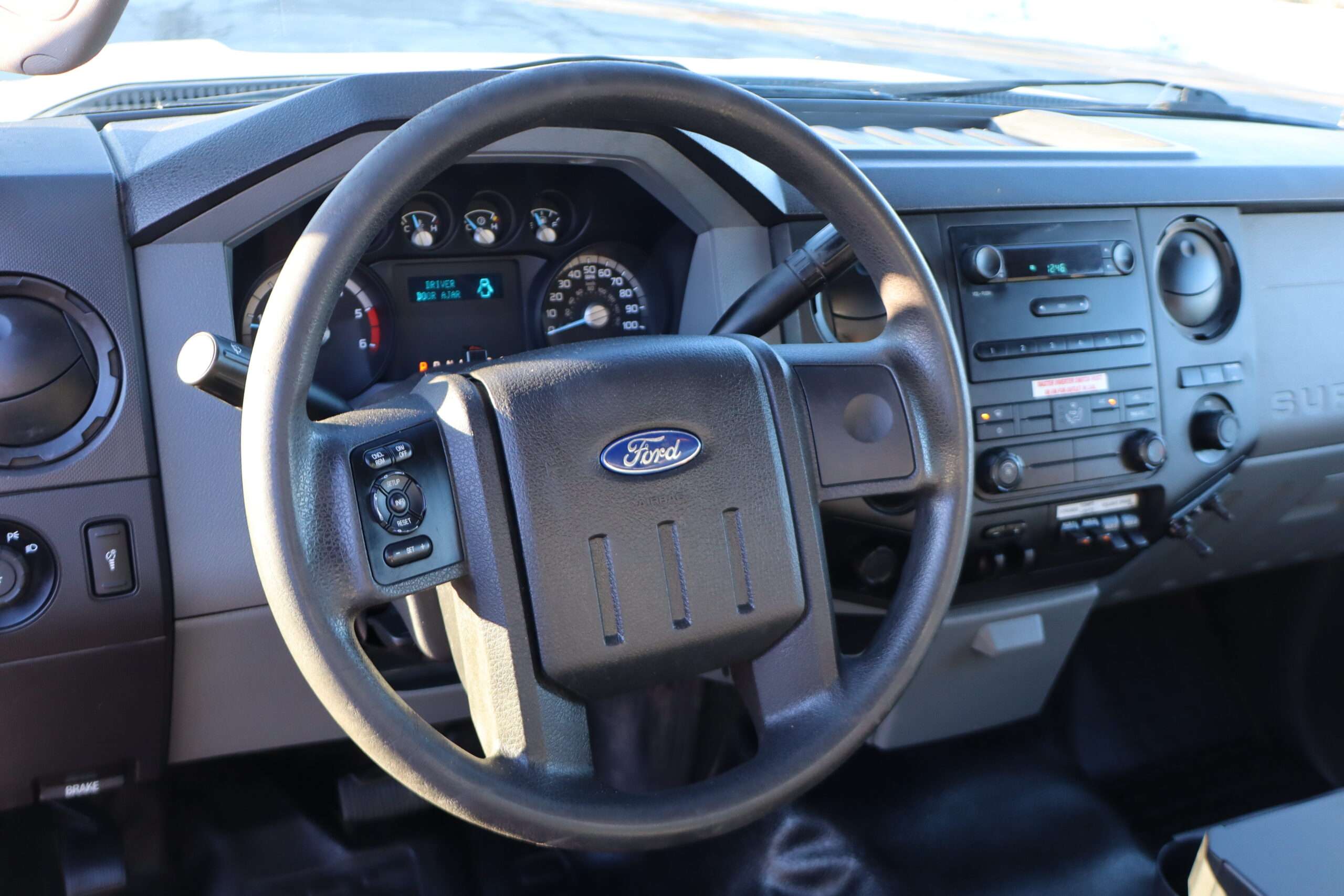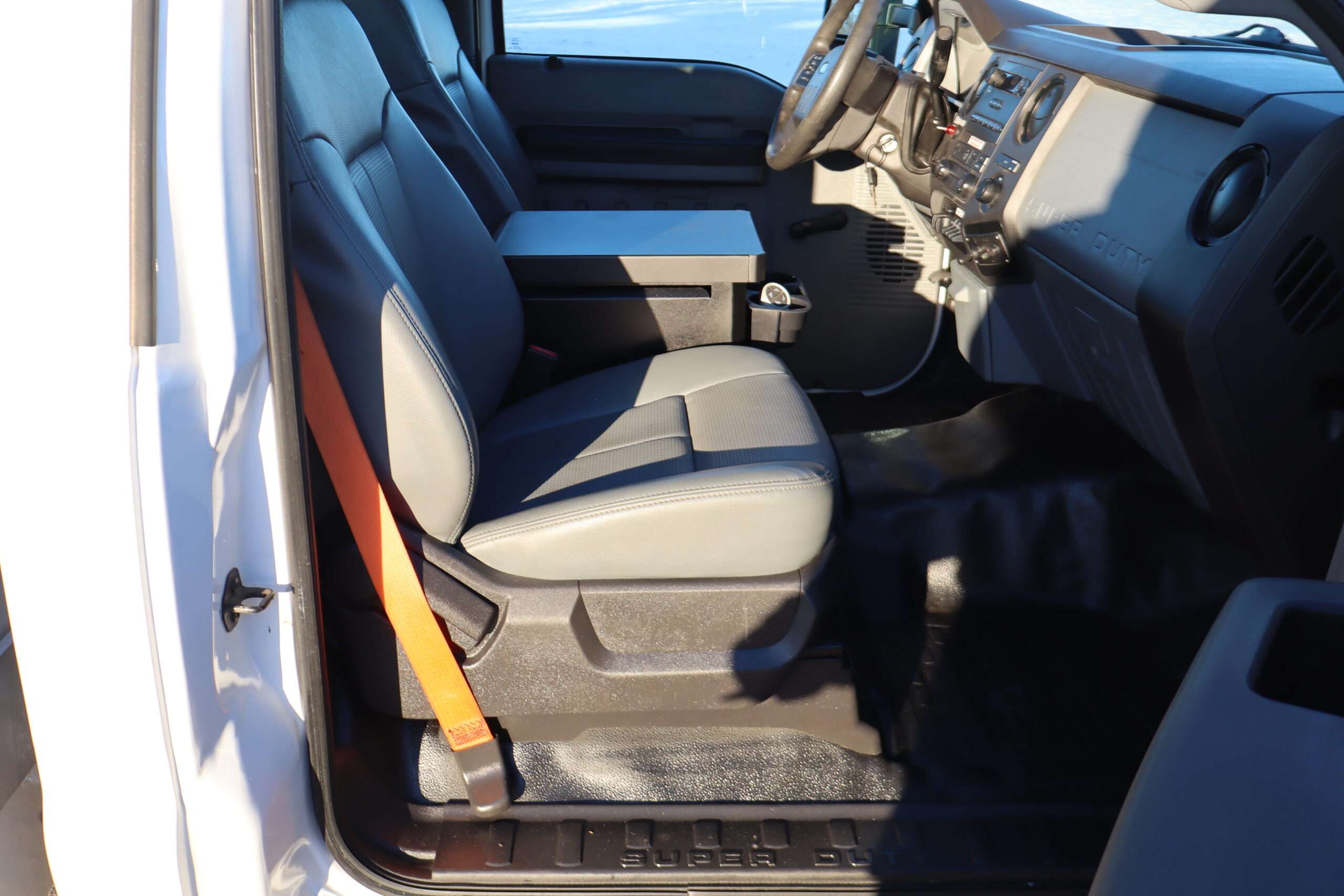 Exterior is Bright White, Interior is Dark Slate/Medium Earth Gray heavy duty seats with center console and storage compartments in front, tilt wheel, cruise control, air conditioning, AM/FM stereo, compass/temperature/mileage display in dash, side air bags, extendable tow mirrors, dual power point, up-fitter switches, day/night rear view mirror, automatic headlights, cab clearance lights, snow package, tow package with receiver, trailer wiring, factory electronic brake controller and black molded step boards.