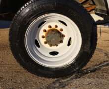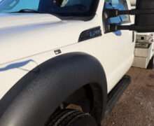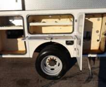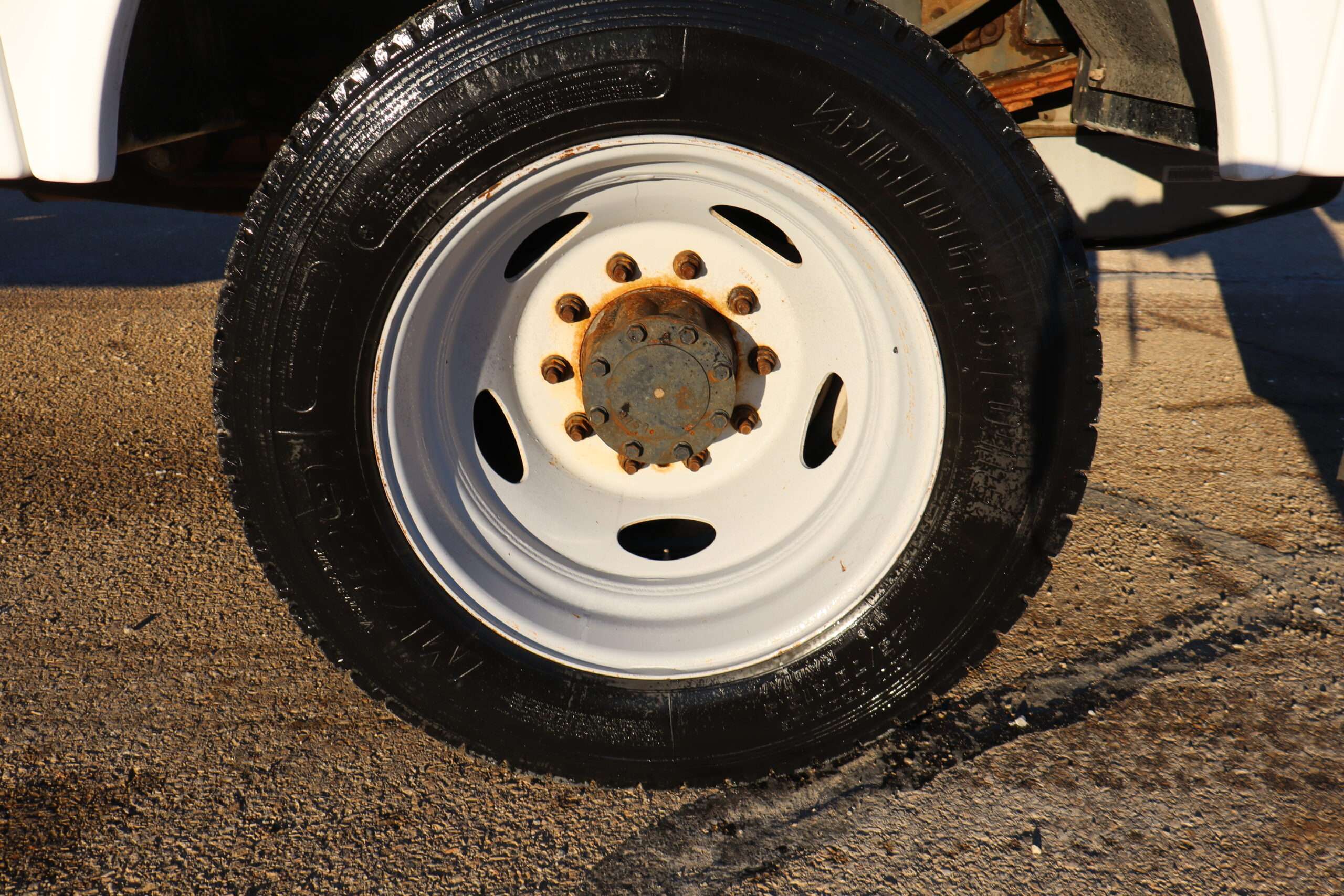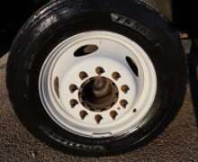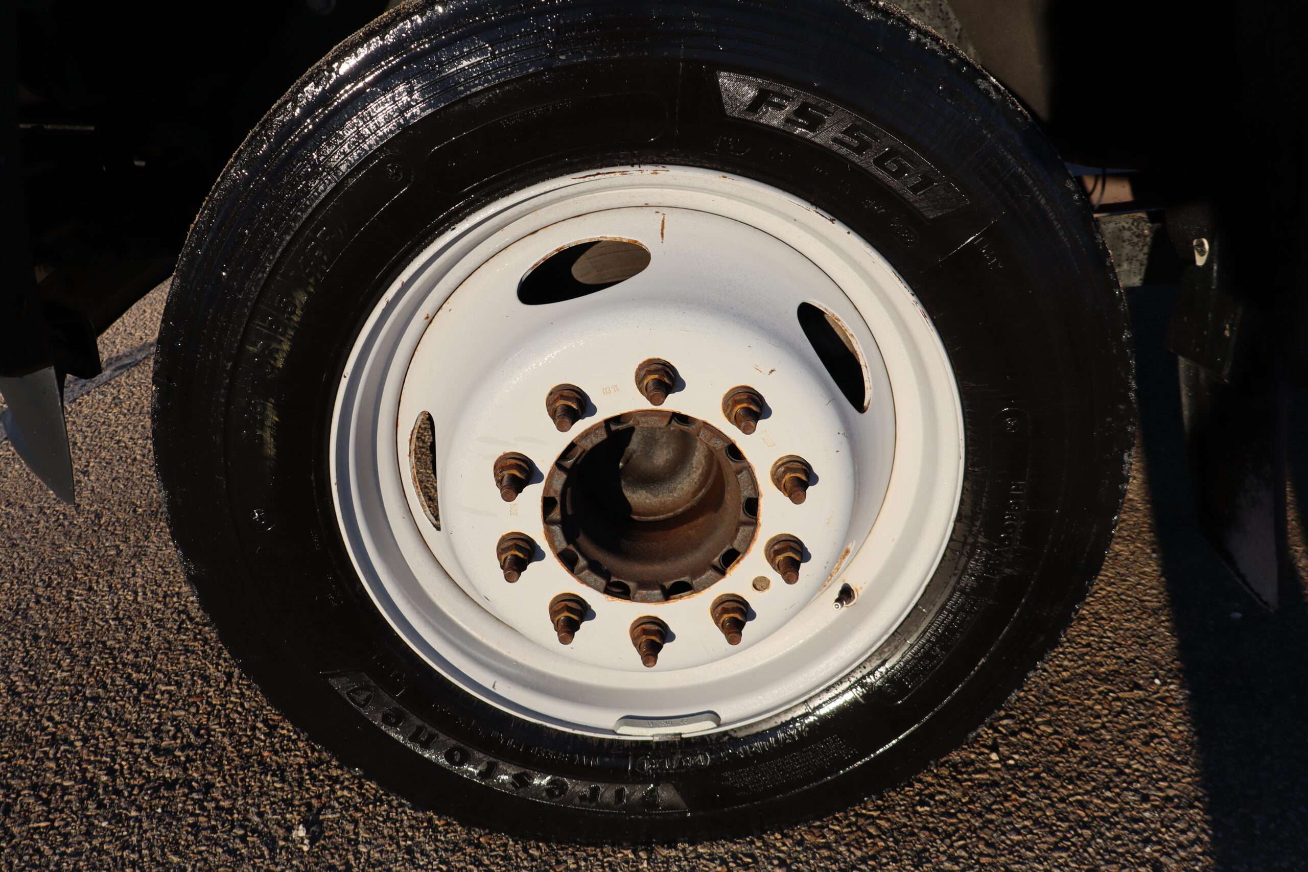 Motor is a 6.8L V10 gas engine, 5-speed automatic transmission with optional tap shift, RWD, 4.88 axle ratio, 19.5″ Factory Gray Steel wheels with 225/70R19.5 Firestone Steers and Load Range G tires.