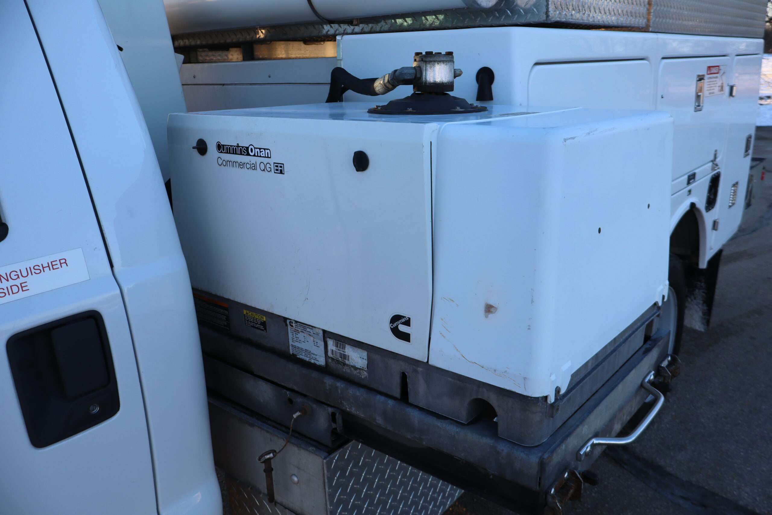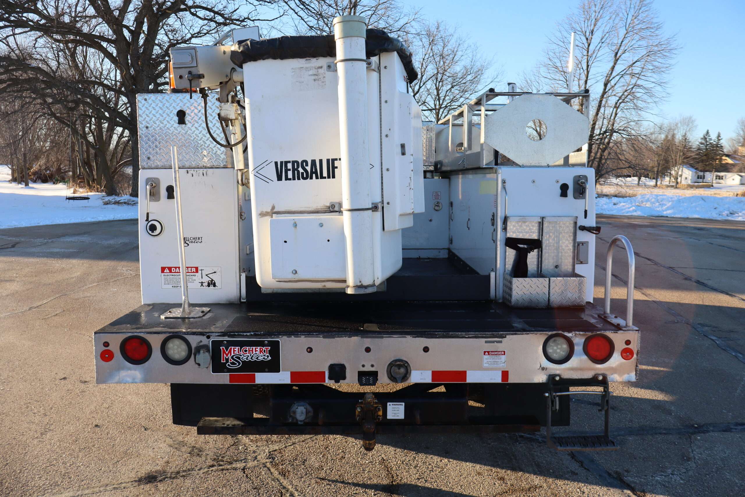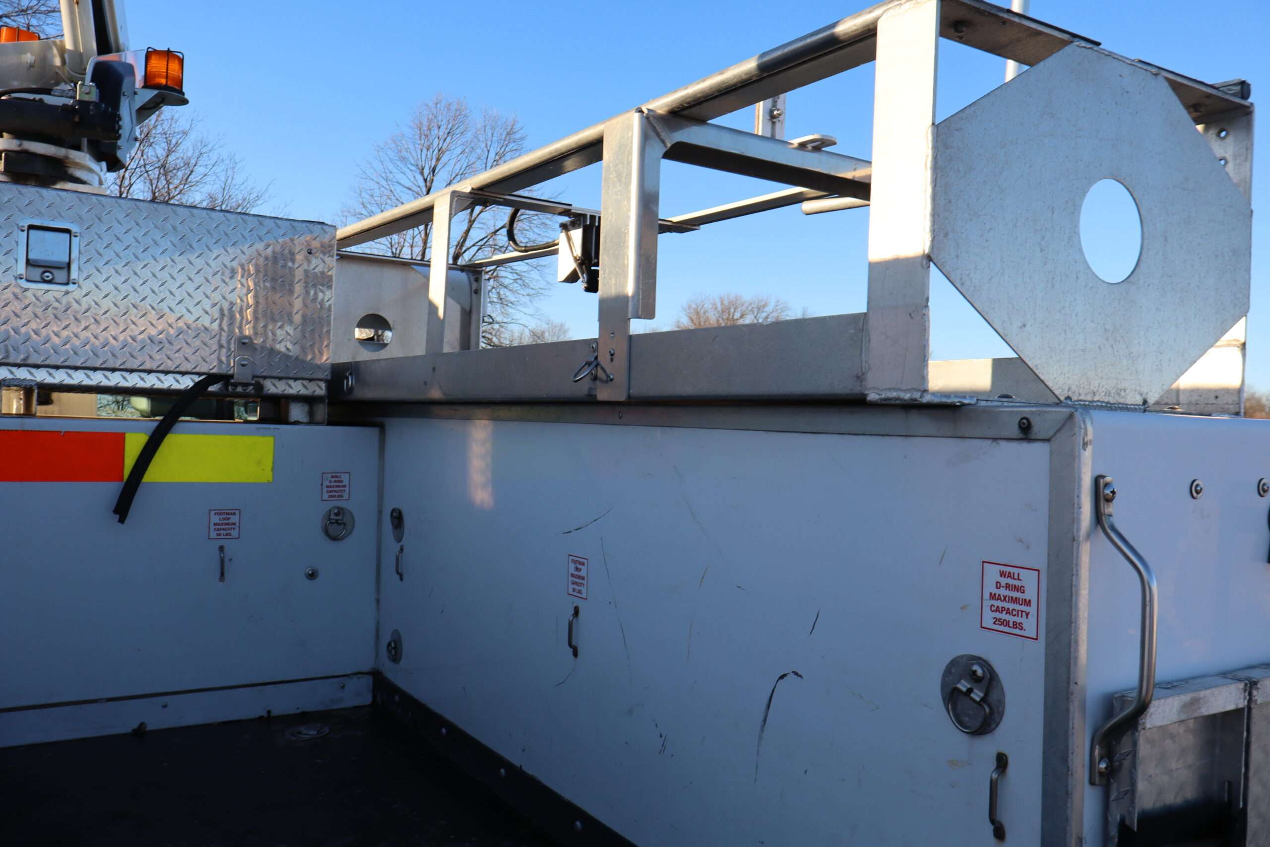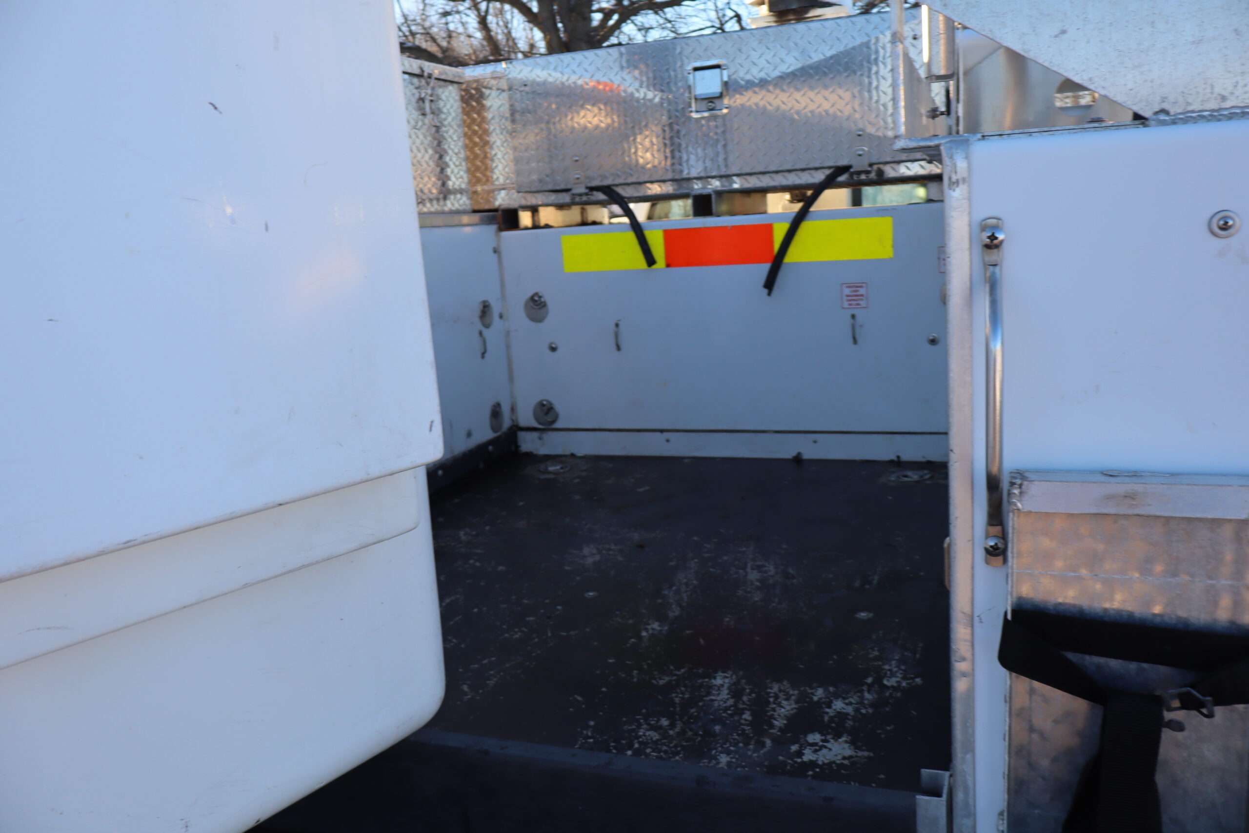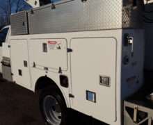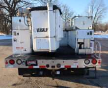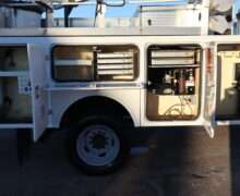 EXTRAS: 11′ long x 8′ wide with 2′ work platform, Utility/Service bed with Versalift Tel 29N-03 bucket with 29.5′ platform height 2 aluminum diamond plate, 350lb, Cummins Onan commercial QG generator, tool box and air compressor and heavy duty hitch.
