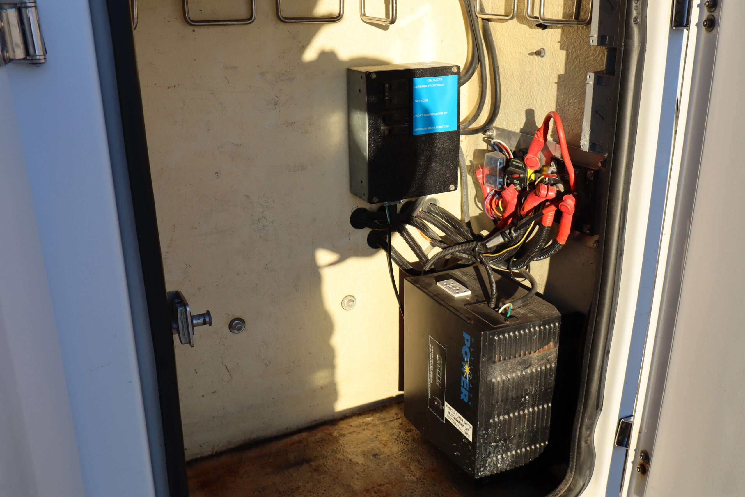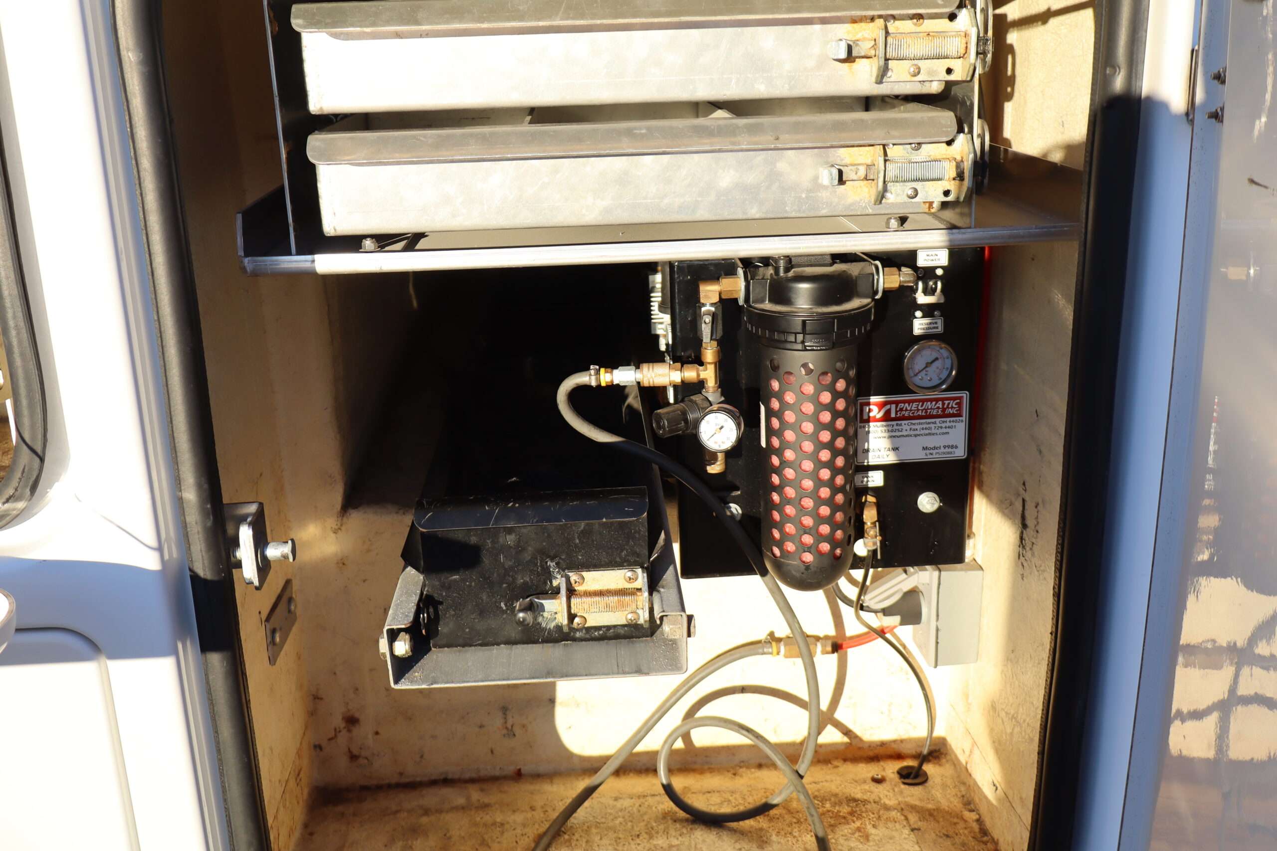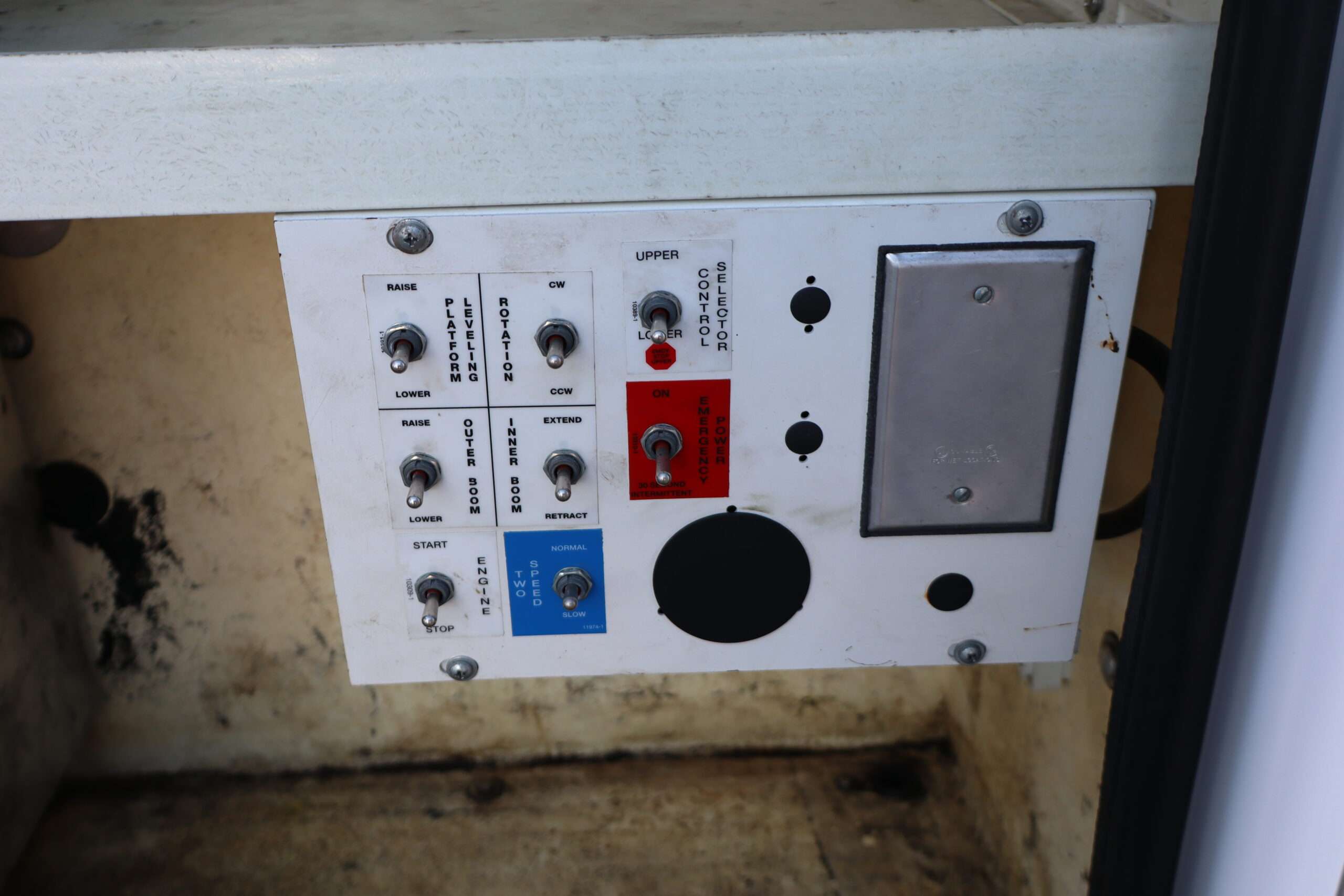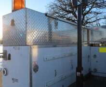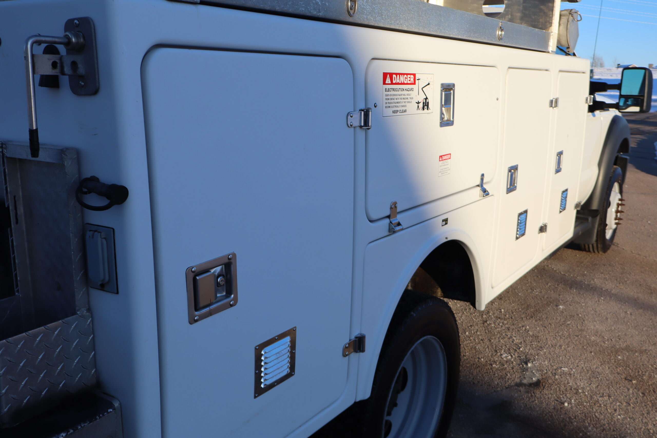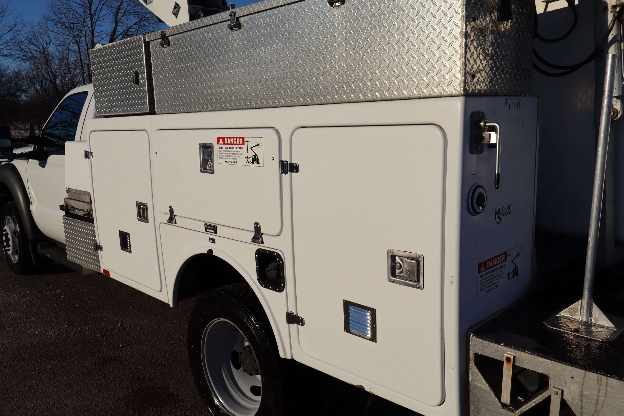 EXTRAS: 11′ long x 8′ wide with 2′ work platform, Utility/Service bed with Versalift Tel 29N-03 bucket with 29.5′ platform height 2 aluminum diamond plate, 350lb, Cummins Onan commercial QG generator, tool box and air compressor and heavy duty hitch.