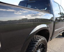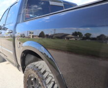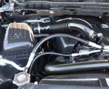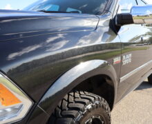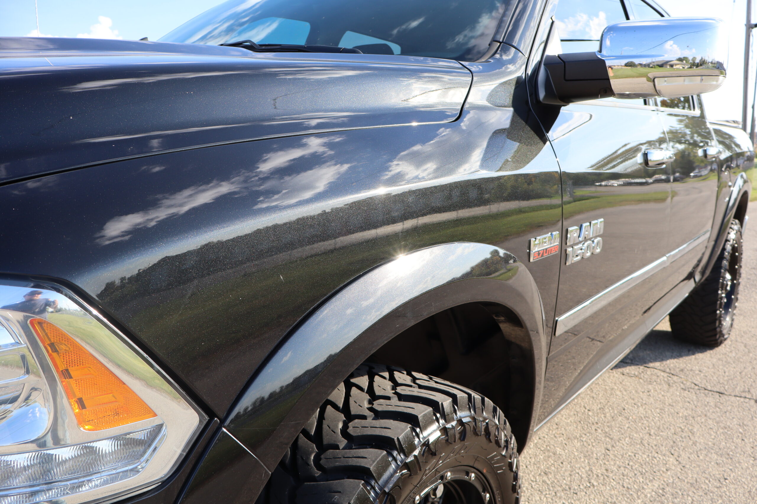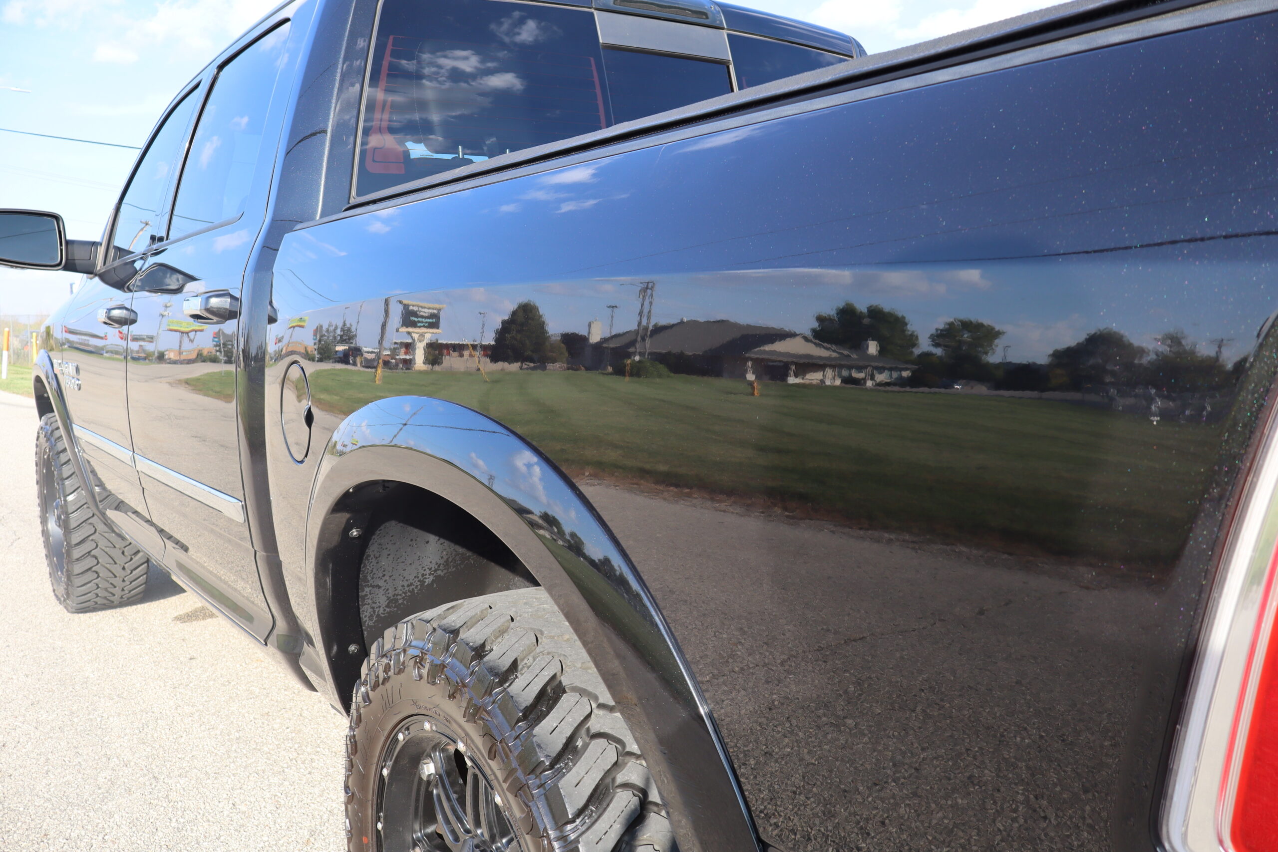 Motor is a 5.7L Hemi V8 gas, 8-speed automatic transmission with optional tap shift, turn dial 4WD, 3.92 axle ratio, 20″ Fuel Black and Machined Alloy wheels with Newer 32×12.50R20LT AT Turo Trail Blade Load Range E tires.