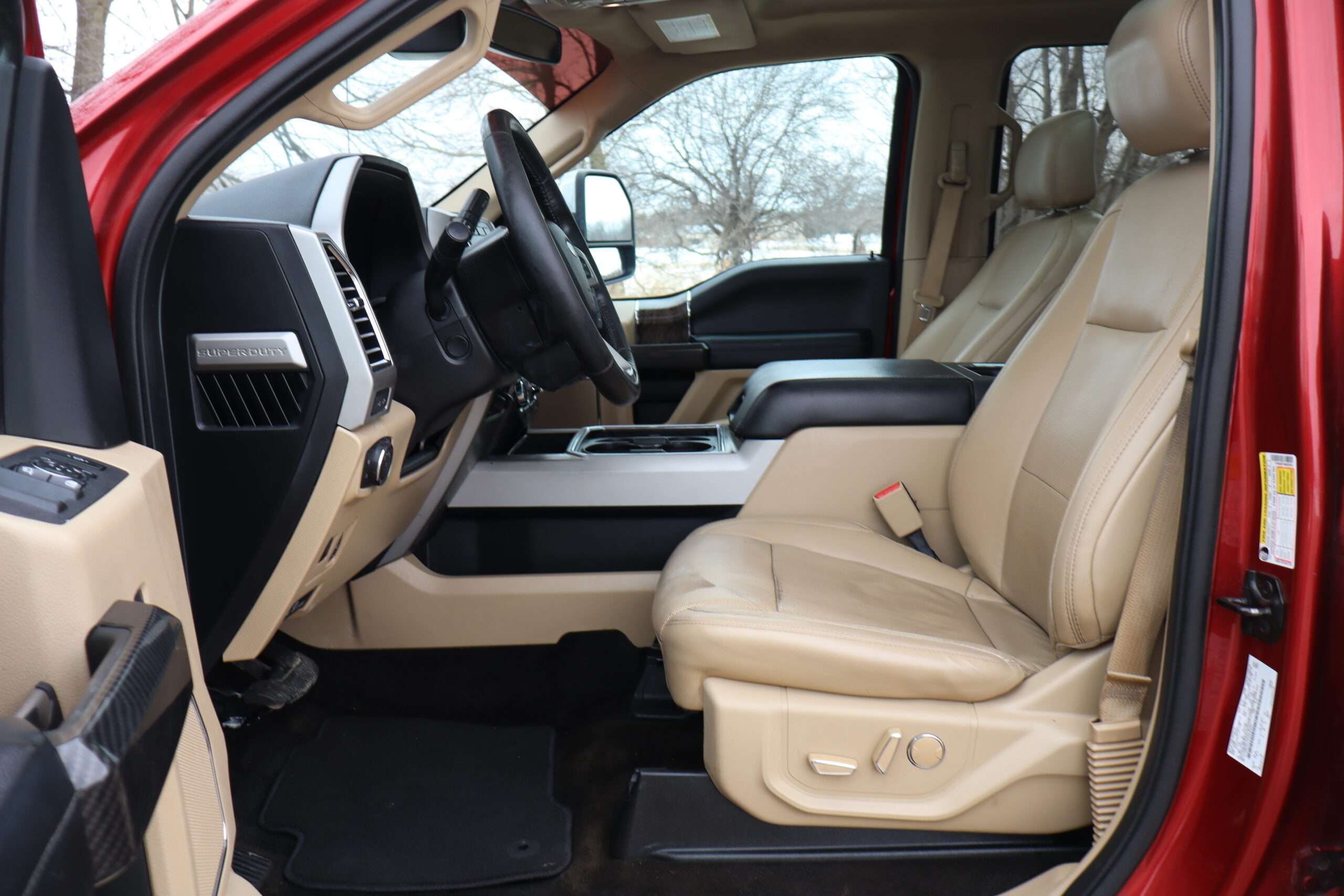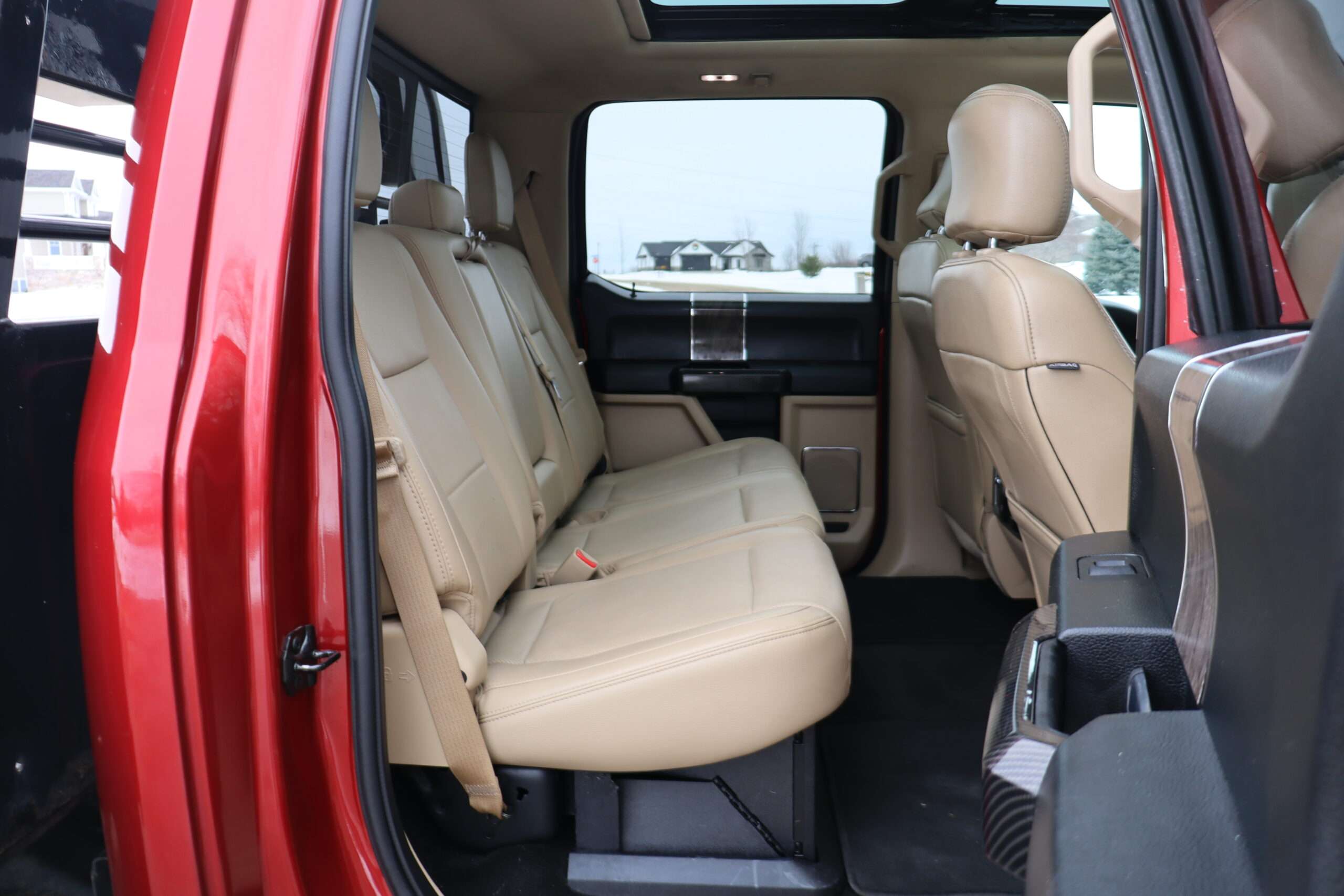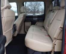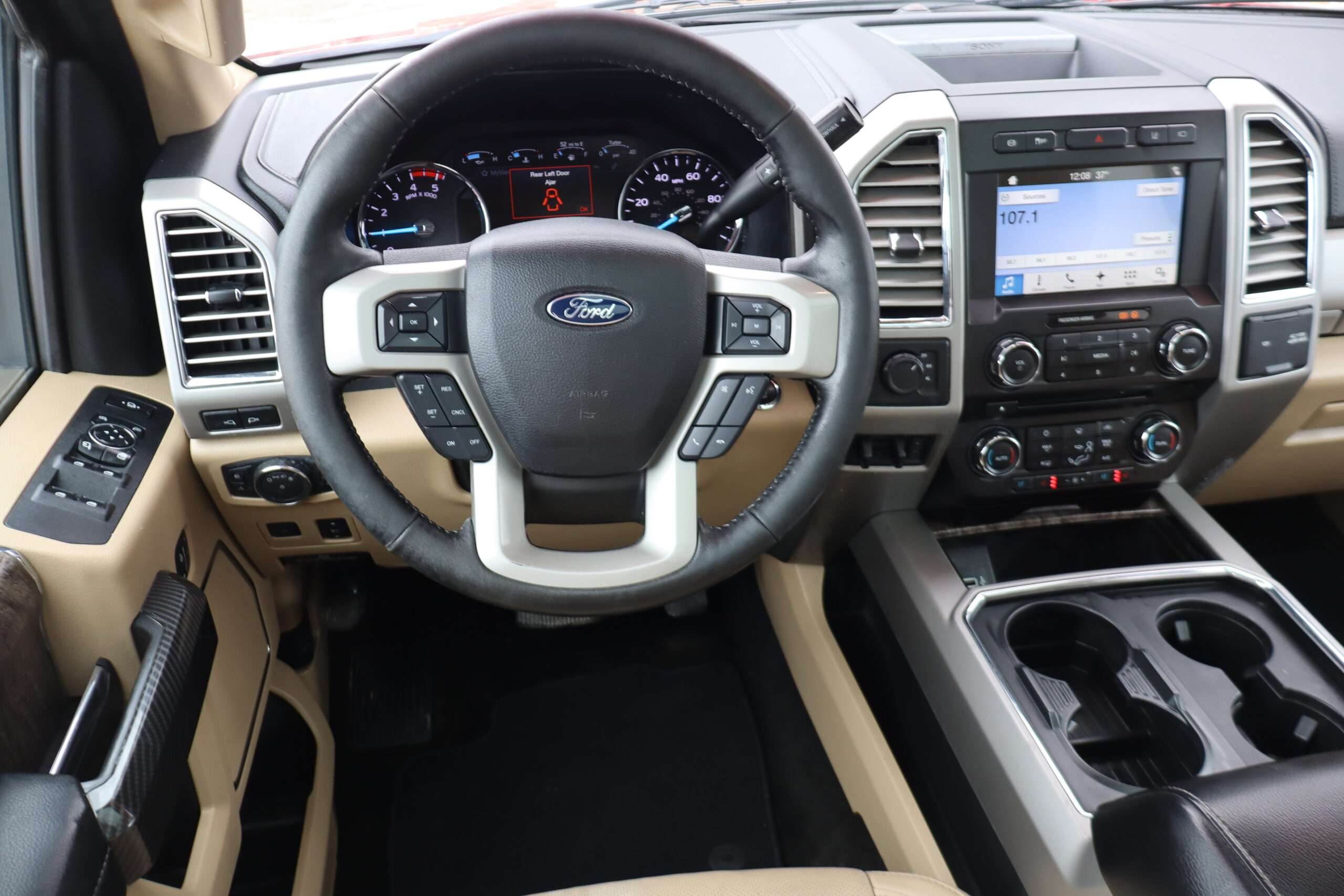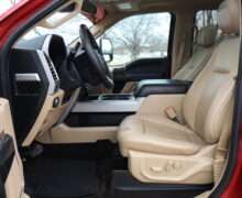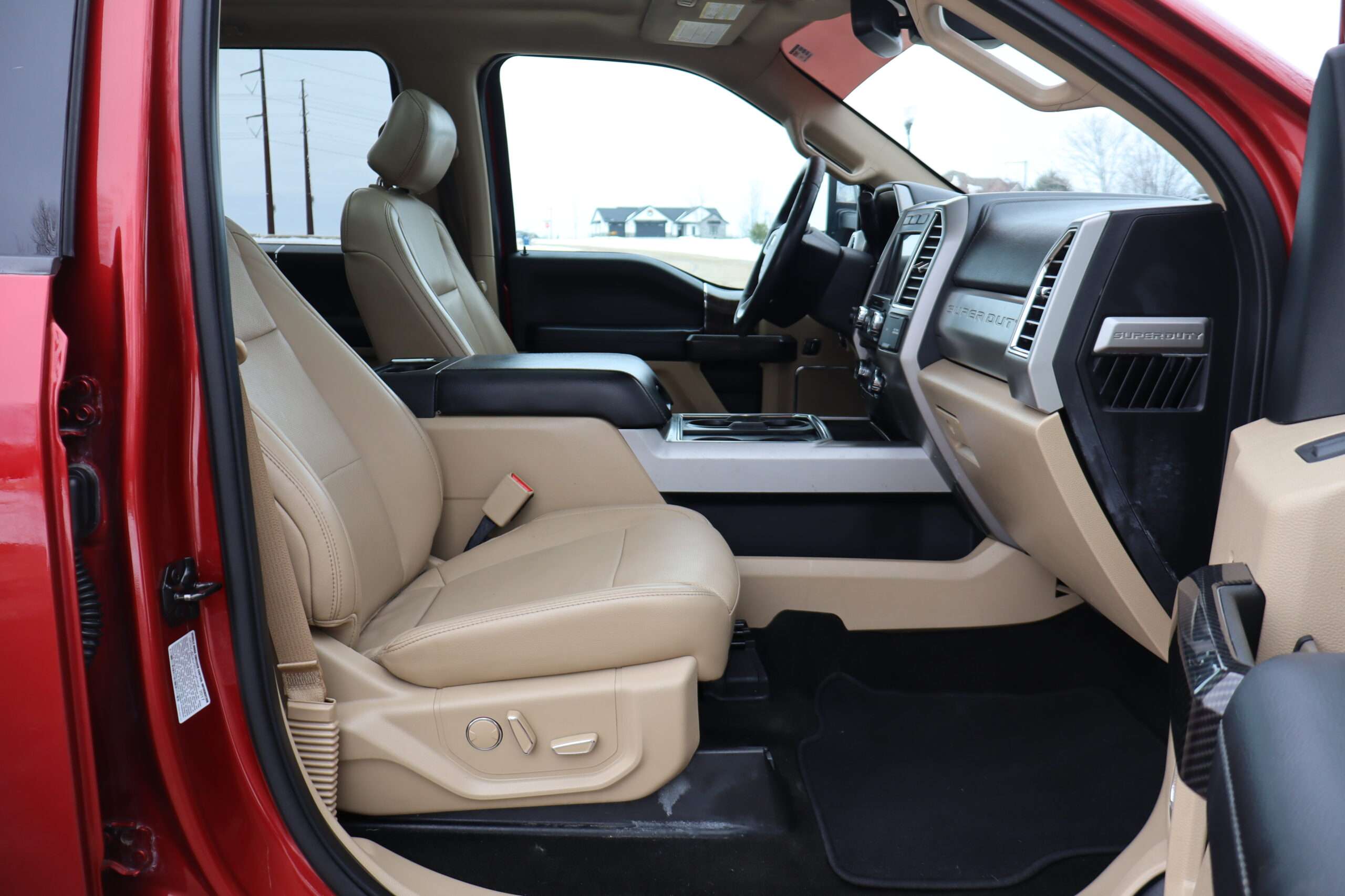 Exterior is Tow Tone Ruby Red Metallic and Caribou, Interior is Camel Leather, dual heated and cooled 10-way power bucket seats in front with hard center console, 60/40 heated rear folding bench with under seat collapsible storage, memory driver’s seat, adaptive steering, lane detection alert, SOS post, rear window defrost, power adjustable pedals, power windows and power door locks, power tilt and telescoping wheel, cruise control, air conditioning, electric rear window defrost, digital climate control, navigation, SYNC III with 8″ touch screen, AM/FM stereo, MP3 player, CD player, Sirius satellite radio ready, dual glove boxes, driver’s information center, Bluetooth capabilities, multi-function steering wheel controls, compass/temperature/mileage display in dash, 360 view camera, back up assist, remote entry, door code entry, remote start, traction control, hill start assist, auto dimming rear view mirror, universal garage door opener, 110v converter, roof marker lights, fog lights, side air bags, power/heated telescoping and folding mirrors with turn signals, LED spot lights, power sliding rear window, dark tinted glass, 6″ chrome step boards, tow package with receiver and trailer wiring, factory electronic brake controller and chrome package.