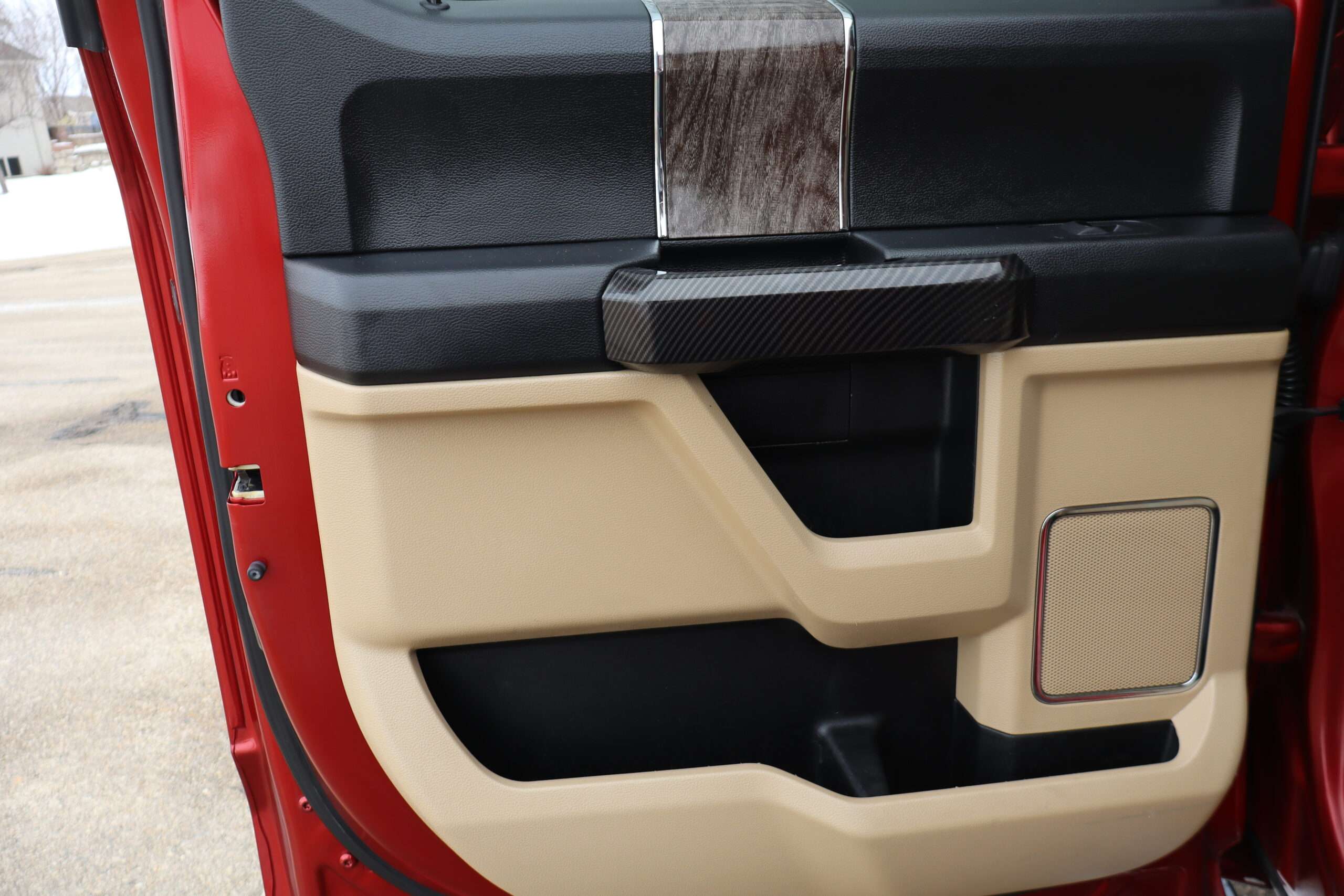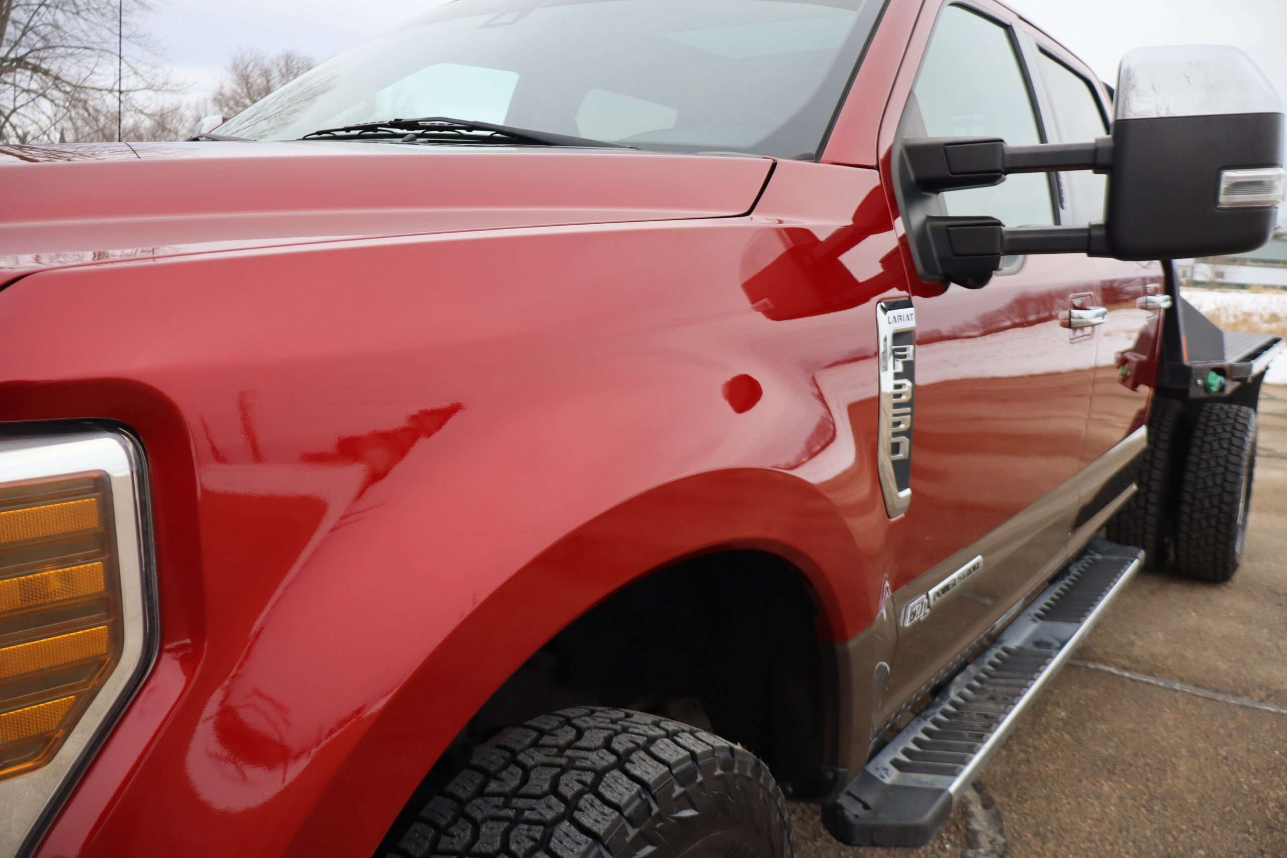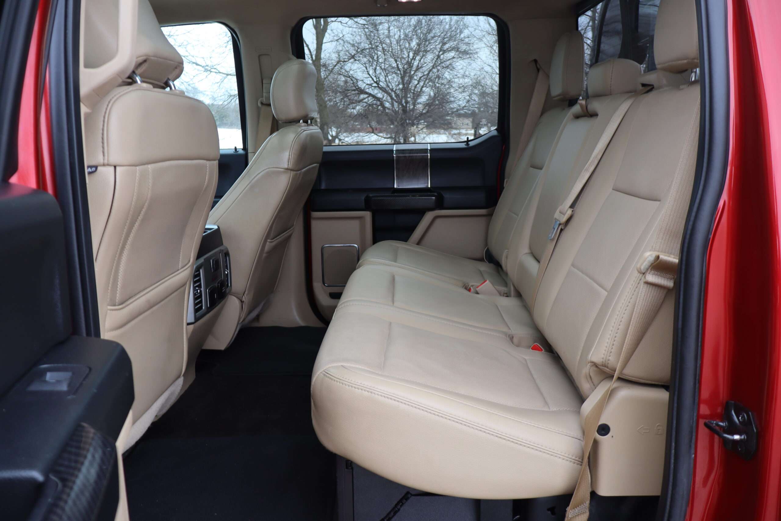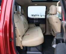 Exterior is Tow Tone Ruby Red Metallic and Caribou, Interior is Camel Leather, dual heated and cooled 10-way power bucket seats in front with hard center console, 60/40 heated rear folding bench with under seat collapsible storage, memory driver’s seat, adaptive steering, lane detection alert, SOS post, rear window defrost, power adjustable pedals, power windows and power door locks, power tilt and telescoping wheel, cruise control, air conditioning, electric rear window defrost, digital climate control, navigation, SYNC III with 8″ touch screen, AM/FM stereo, MP3 player, CD player, Sirius satellite radio ready, dual glove boxes, driver’s information center, Bluetooth capabilities, multi-function steering wheel controls, compass/temperature/mileage display in dash, 360 view camera, back up assist, remote entry, door code entry, remote start, traction control, hill start assist, auto dimming rear view mirror, universal garage door opener, 110v converter, roof marker lights, fog lights, side air bags, power/heated telescoping and folding mirrors with turn signals, LED spot lights, power sliding rear window, dark tinted glass, 6″ chrome step boards, tow package with receiver and trailer wiring, factory electronic brake controller and chrome package.