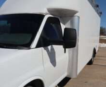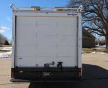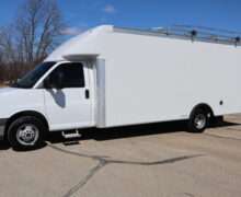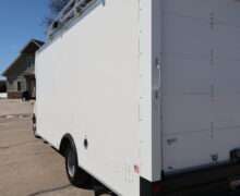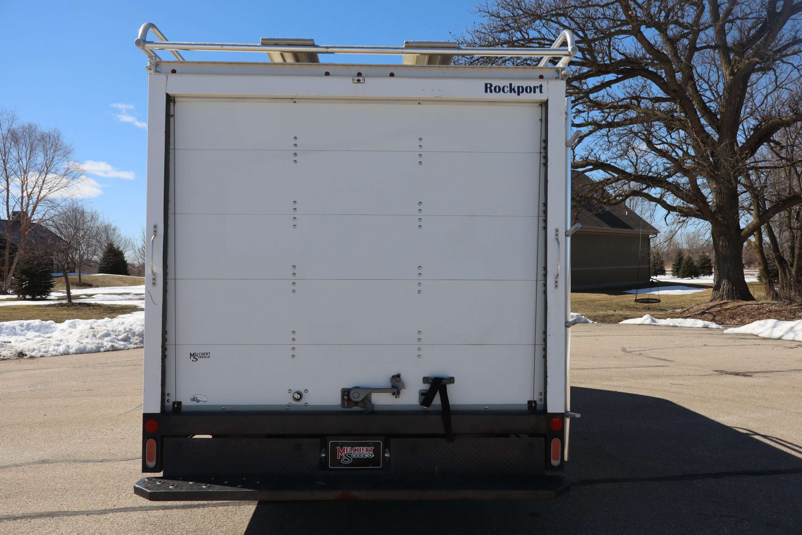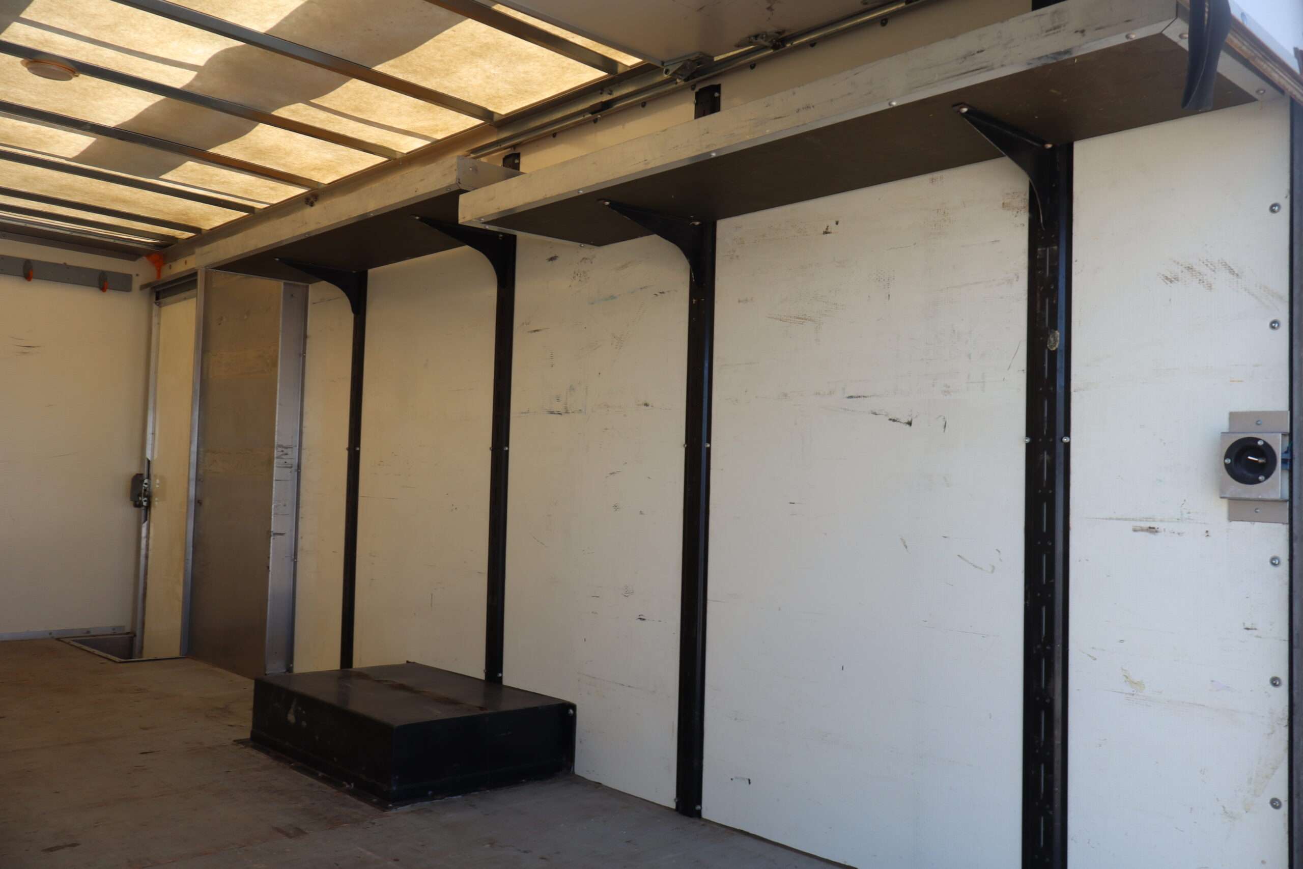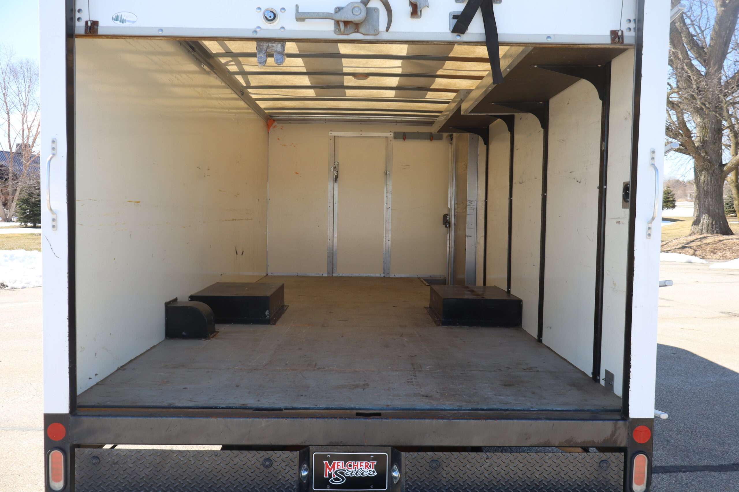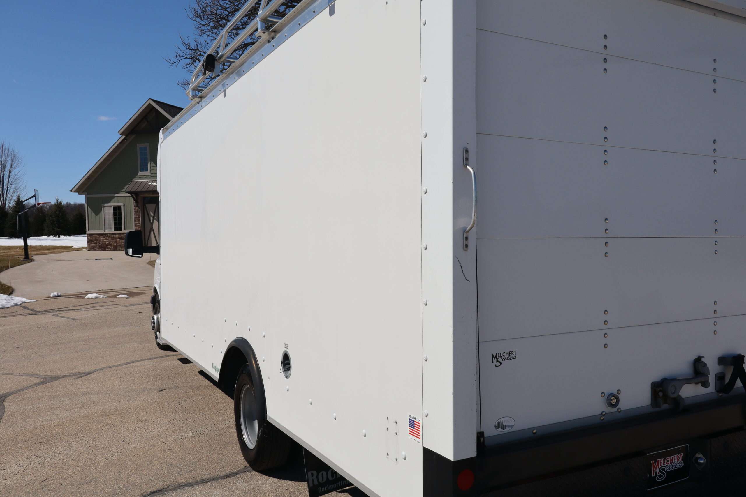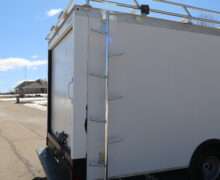 EXTRAS: Cargo Port 18’x8′ widex6′-8″ high box with roll up door and curb side door, aluminum ladder rack, heavy duty rear step and tinted windows.