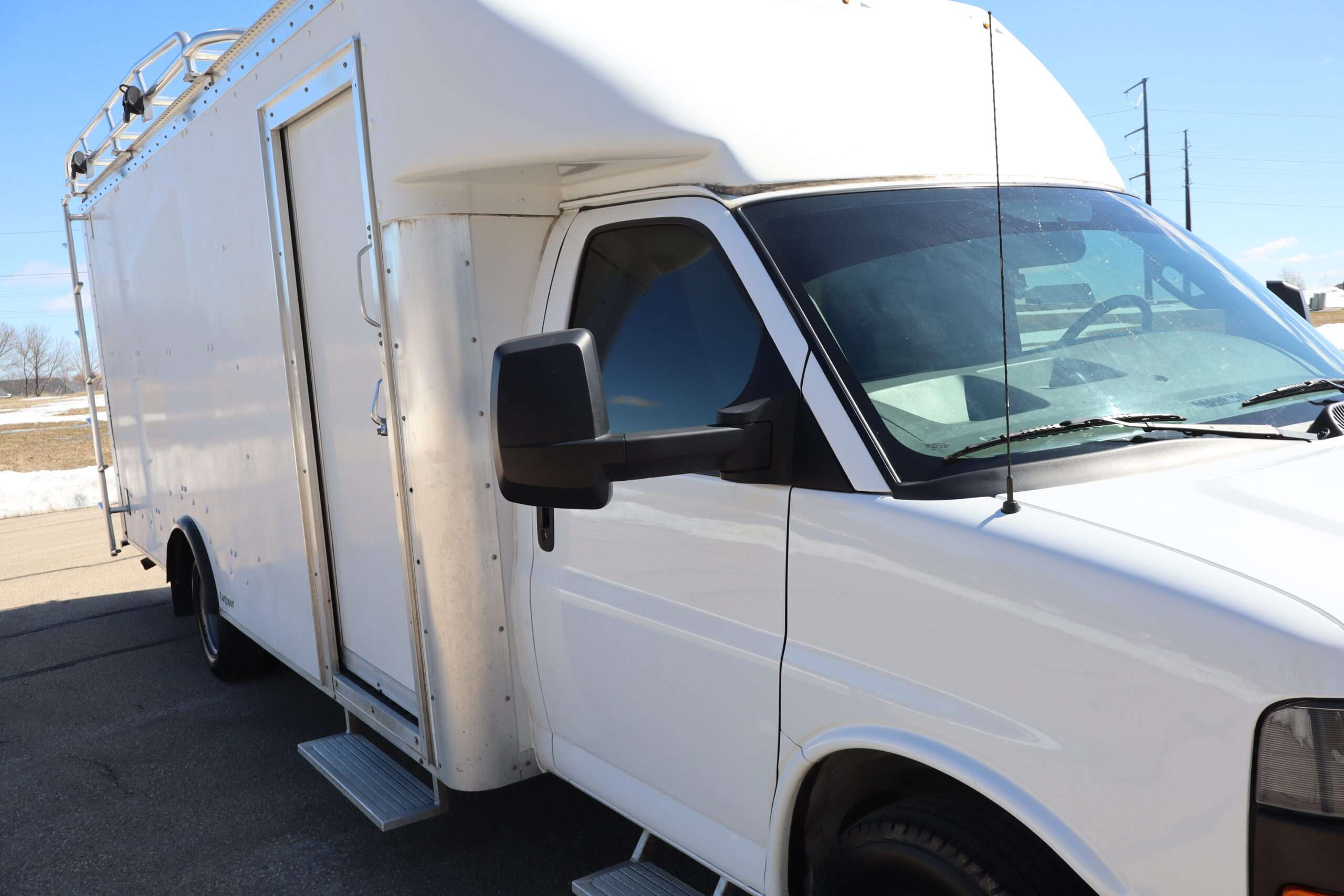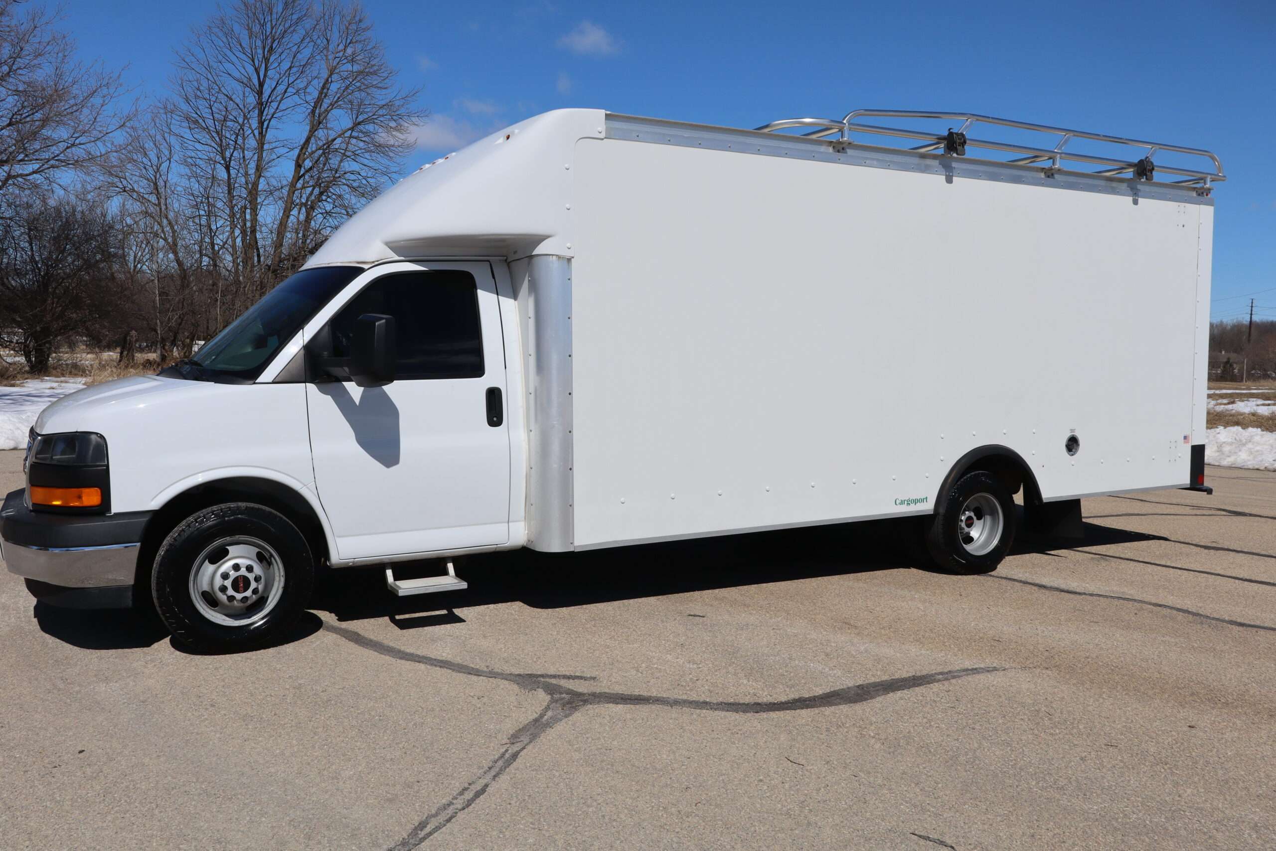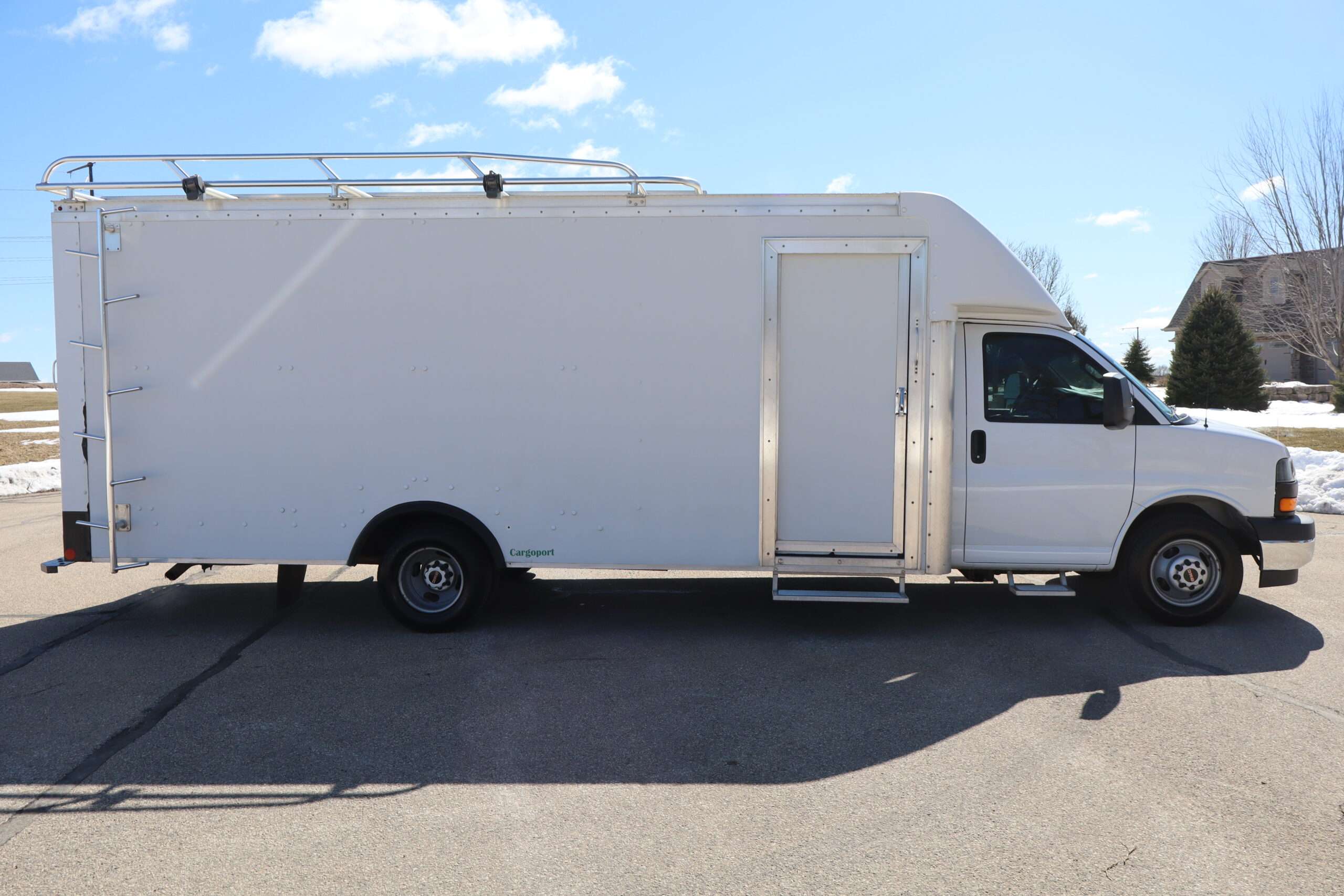 1GD37SCG5H11338052017 GMC 3500 SAVANA CUTAWAY BOX TRUCK, 6.0L GAS, AUTOMATIC TRANSMISSION, RWD, 177″ WHEEL BASE, 18’X8′ WIDE X 6′-8″ TALL WITH CURB DOOR, HEAVY DUTY STEP, ALUMINUM LADDER RACK, 16″ FACTORY WHEELS, GENERAL TIRES, SUPER CLEAN METICULOUSLY MAINTAINED 2 OWNER BOX TRUCK WITH 86,188 MILES AND A GOOD CAR FAX.