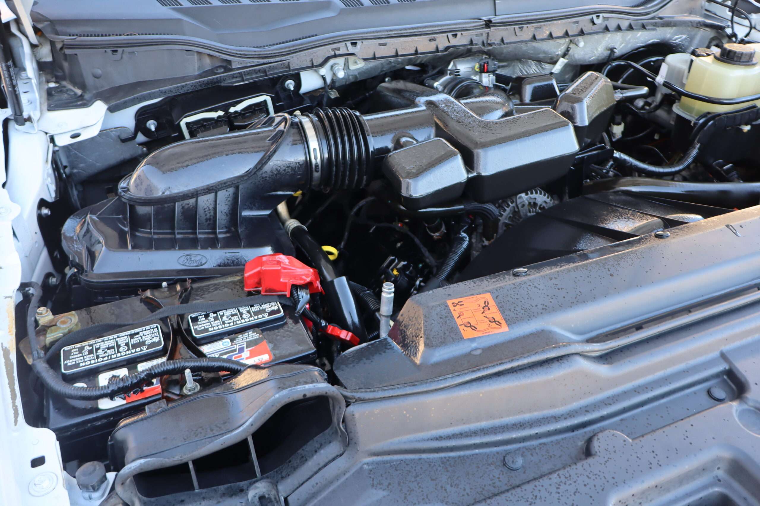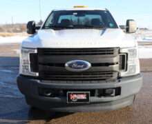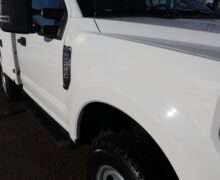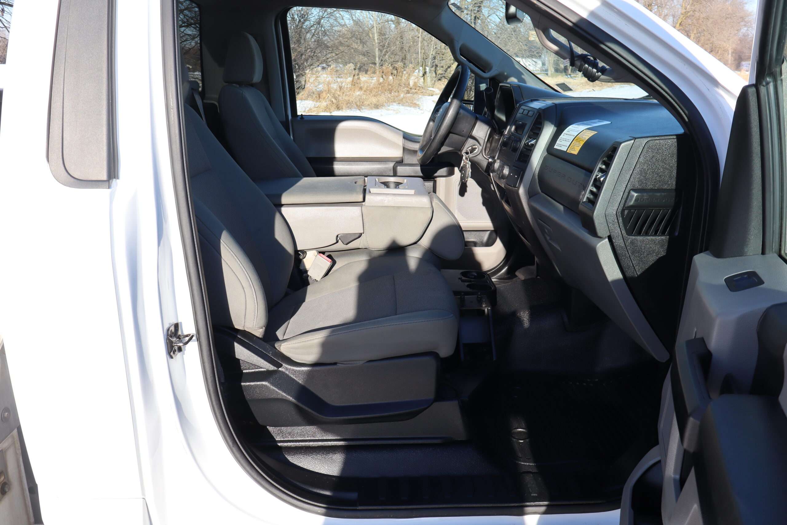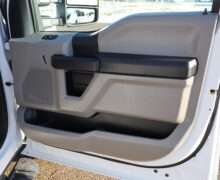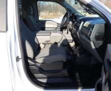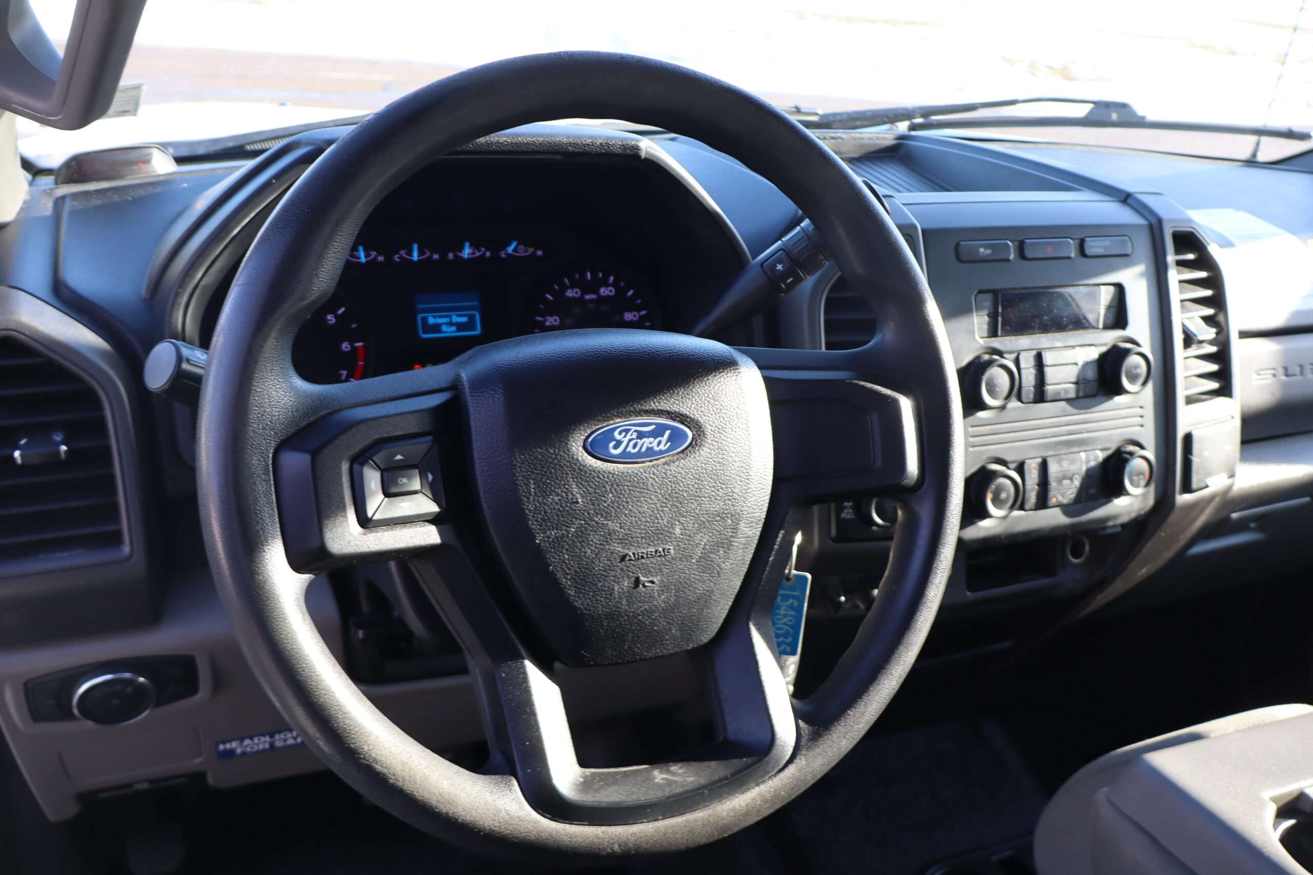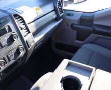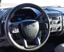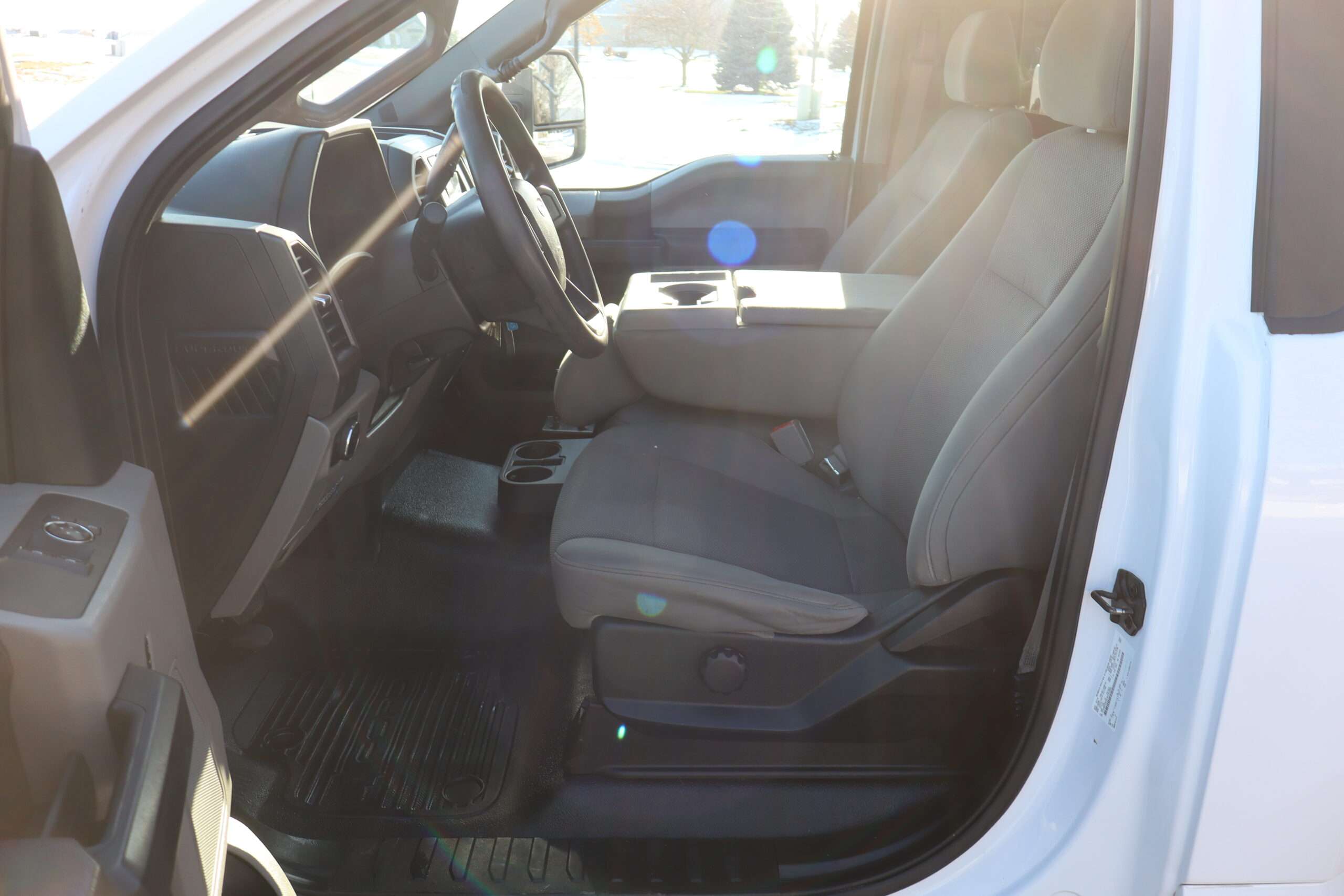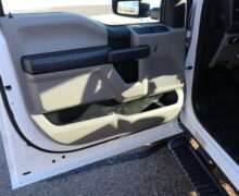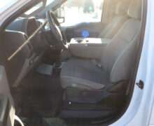 Exterior is Oxford White, Interior is Medium Earth Gray cloth, 40/20/40 seating in front with folding arm rest with built in storage compartments, traction control, power windows and power door locks, tilt and telescoping wheel, air conditioning, AM/FM stereo, dual power point, driver’s information center, compass/temperature/mileage display in dash, auto dimming rear view mirrors, automatic head lights, green tinted glass, towing package with receiver, trailer wiring and electronic brake controller, up-fitter switches and black step boards.