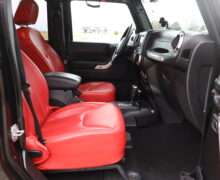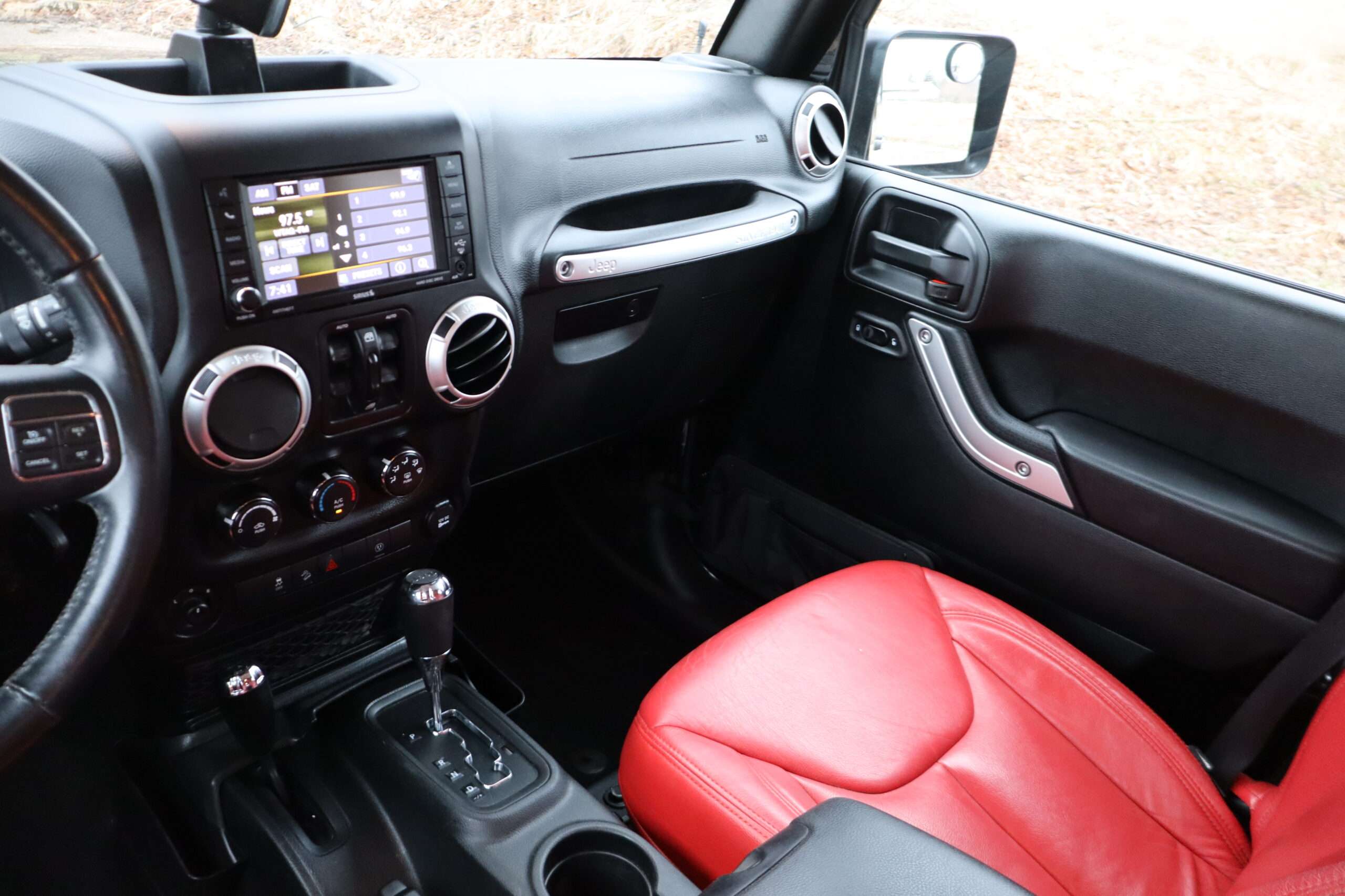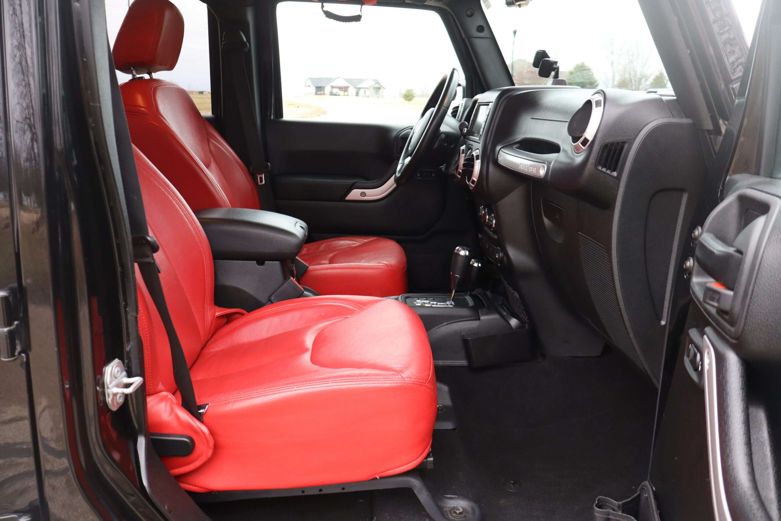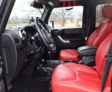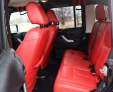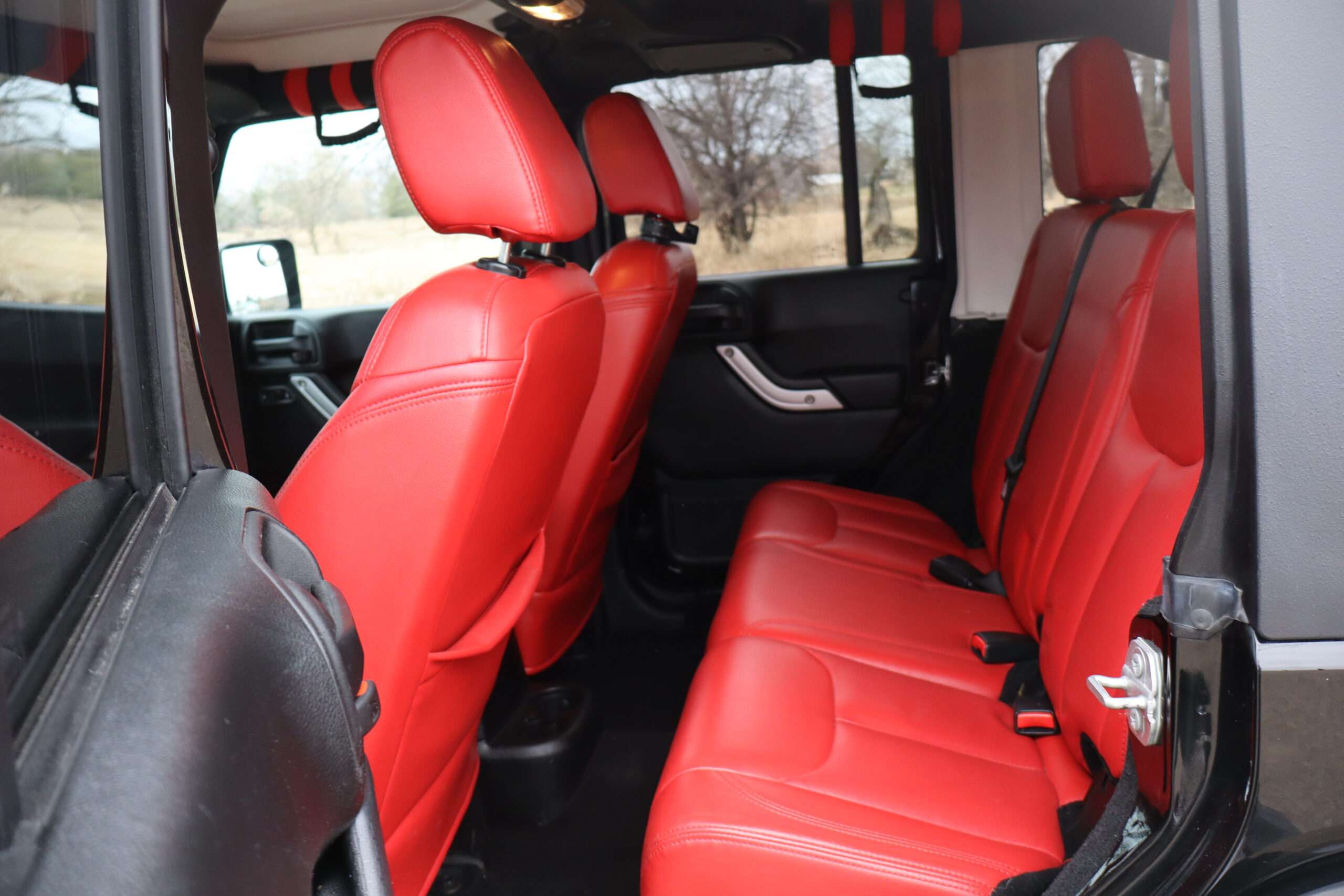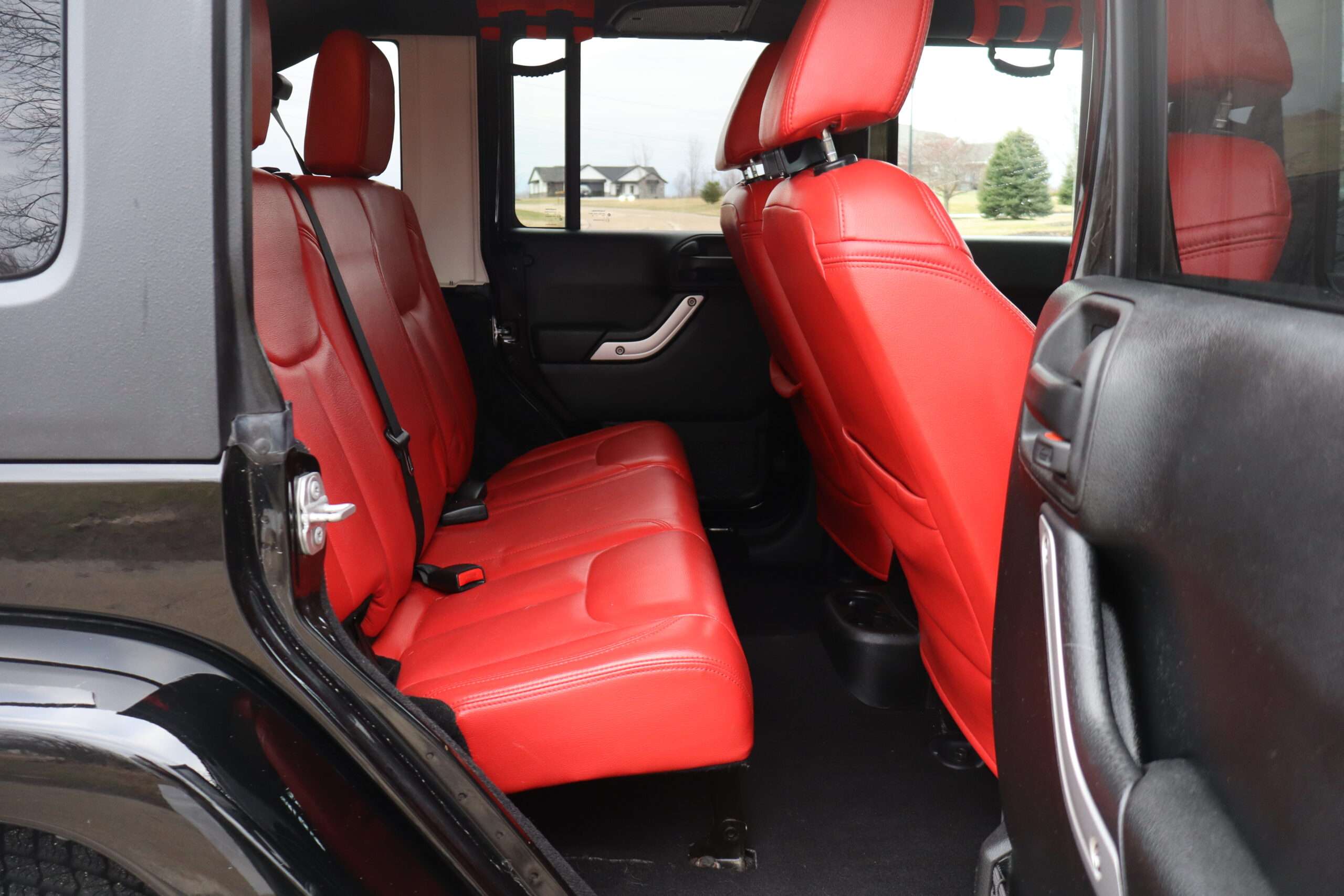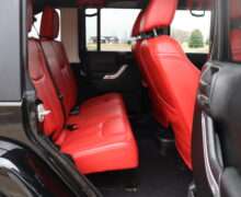 Exterior is Black Clear Coat, Interior is Red Leather, bucket seats in front with console with locking storage compartment, 60/40 folding bench in 2nd row, traction control, hill assist, tilt and telescoping wheel, power windows and power door locks, electric rear window defrost, AM/FM stereo, MP3 player, XM satellite radio ready, Bluetooth, heated/power mirrors, auto dimming rear view mirror, keyless entry, remote start, 115v converter, automatic headlights, fog lights, multi-function steering wheel, hard top, dark tinted glass, tow package with receiver, wire harness and full size spare.
