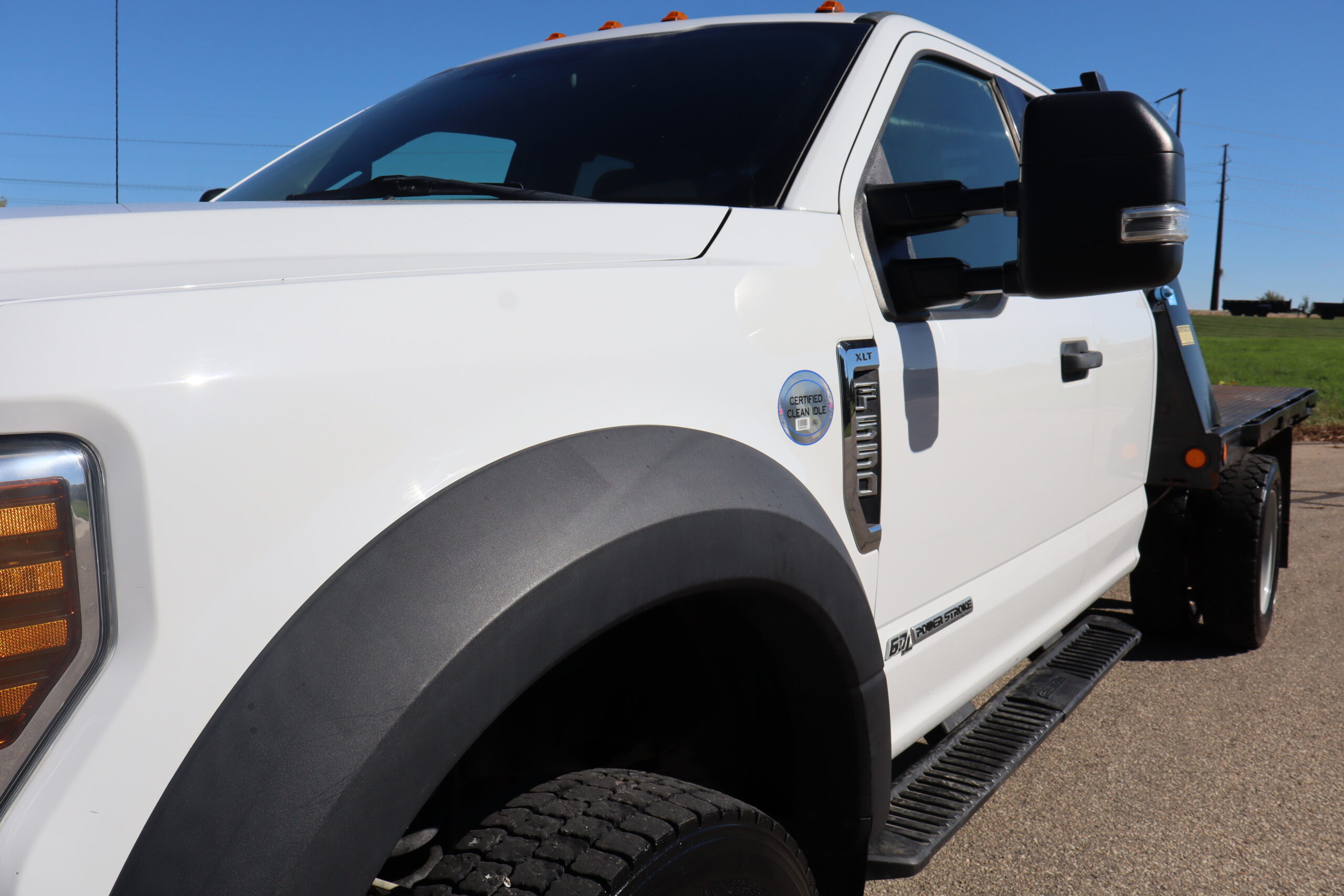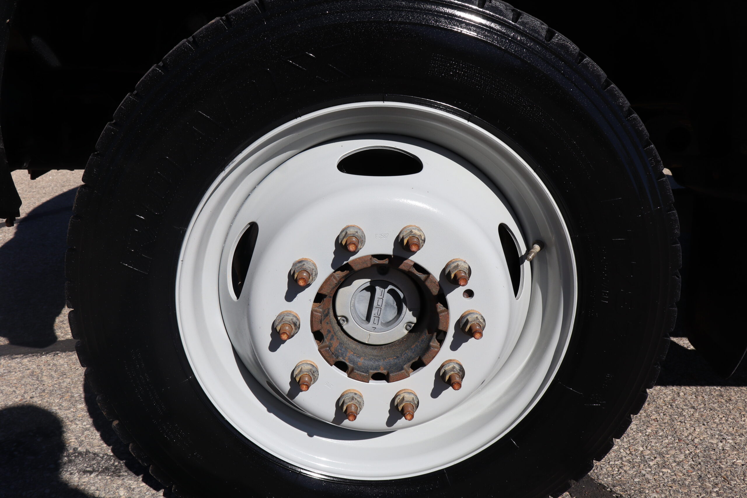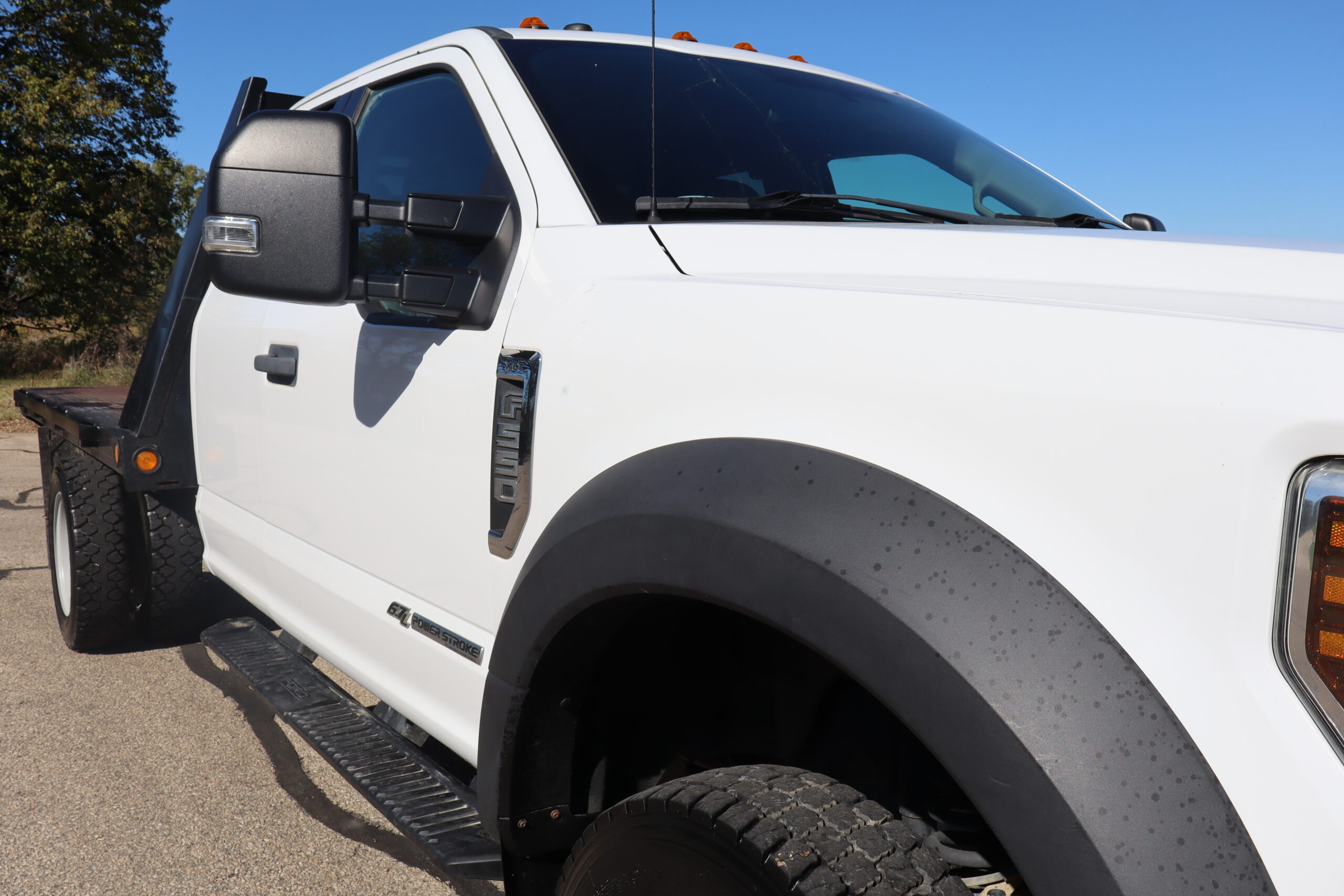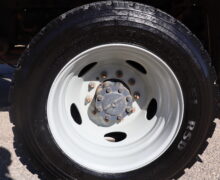 Motor is a 6.7L Power Stroke Turbo, 6-speed automatic transmission, 4WD, 4.88 axle ratio, 19.5″ Factory Gray Steel wheels with 225/70R19.5 HDR Range G tires.