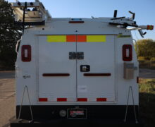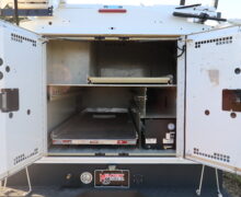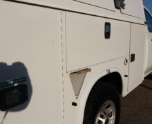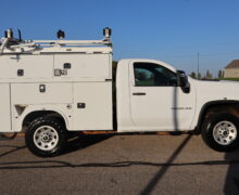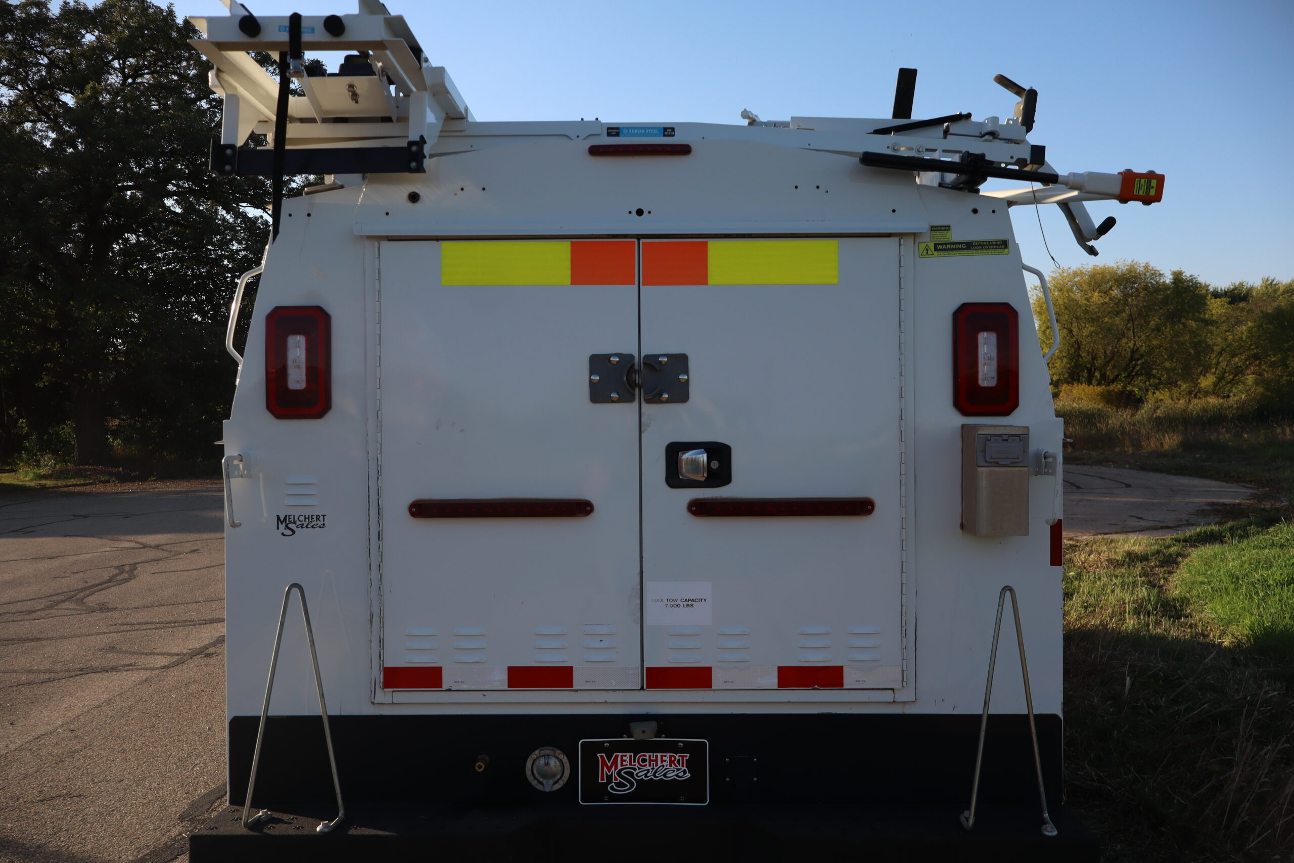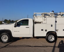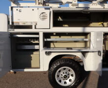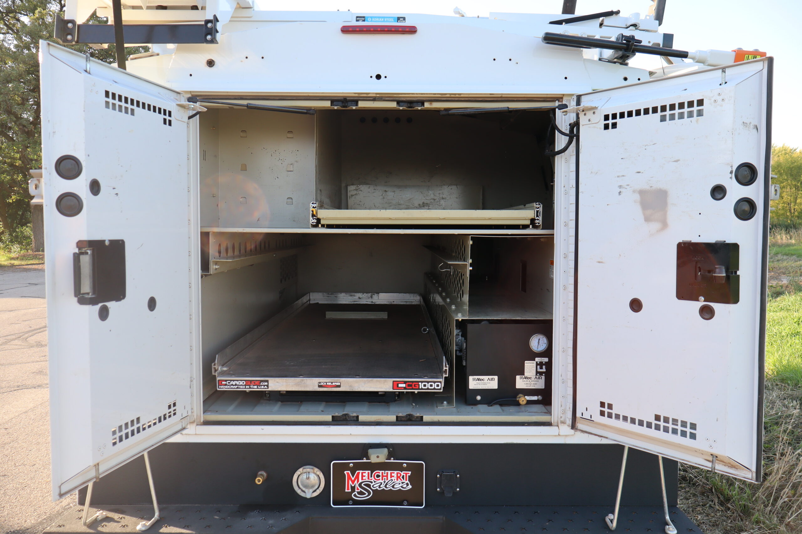 EXTRAS: Knapheide 8′-1″x6′-8″ covered Utility/Service bed with Adrian steel ladder racks, C-Cargo glide slide out storage tray, Cummins generator and Altec air compressor.