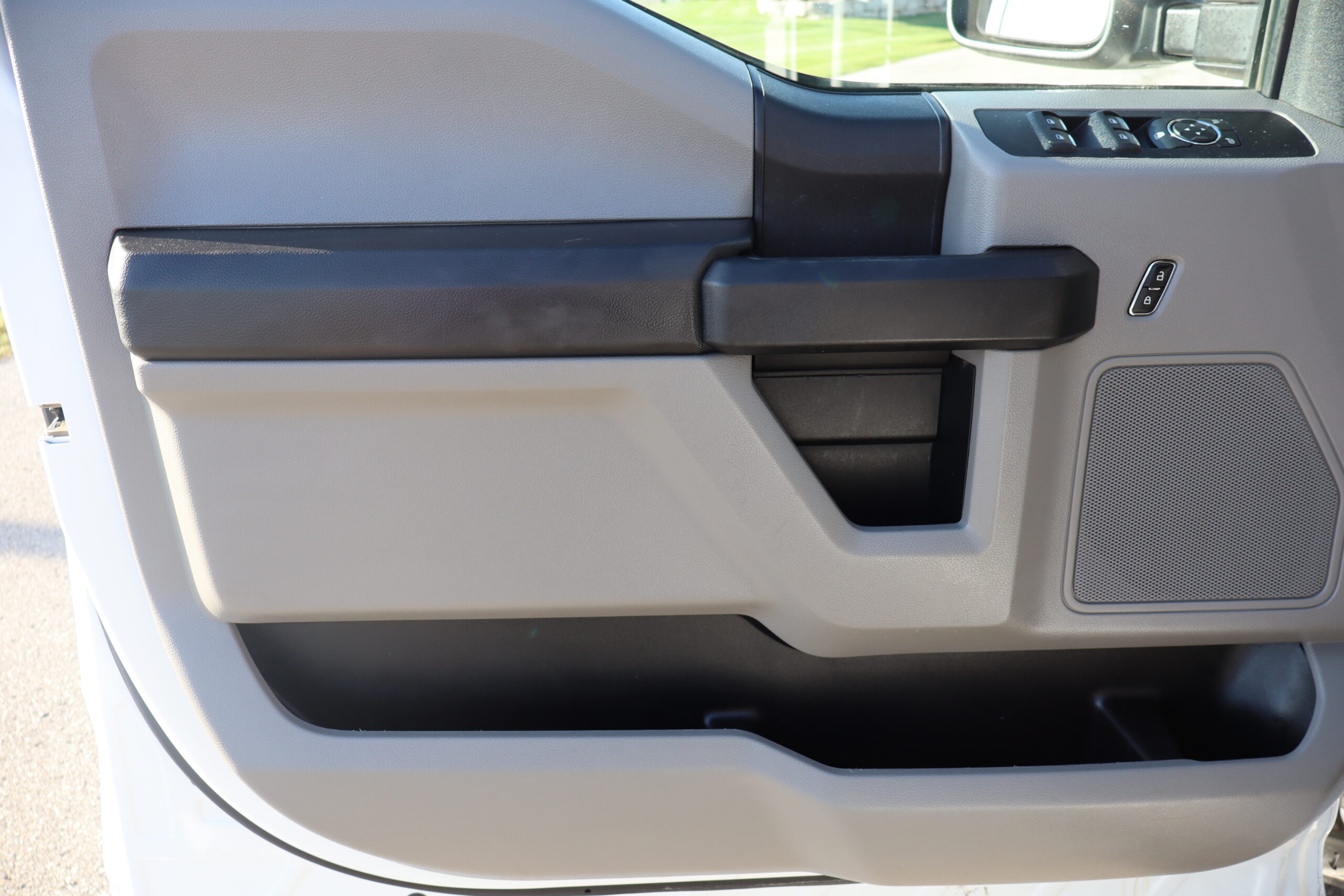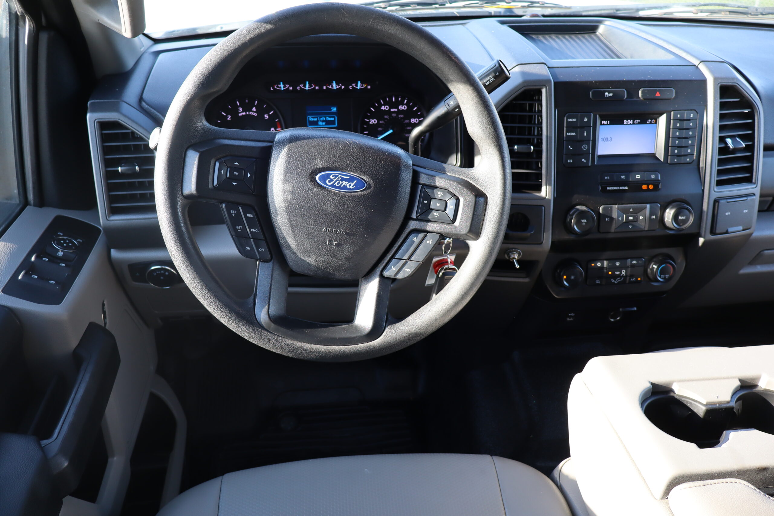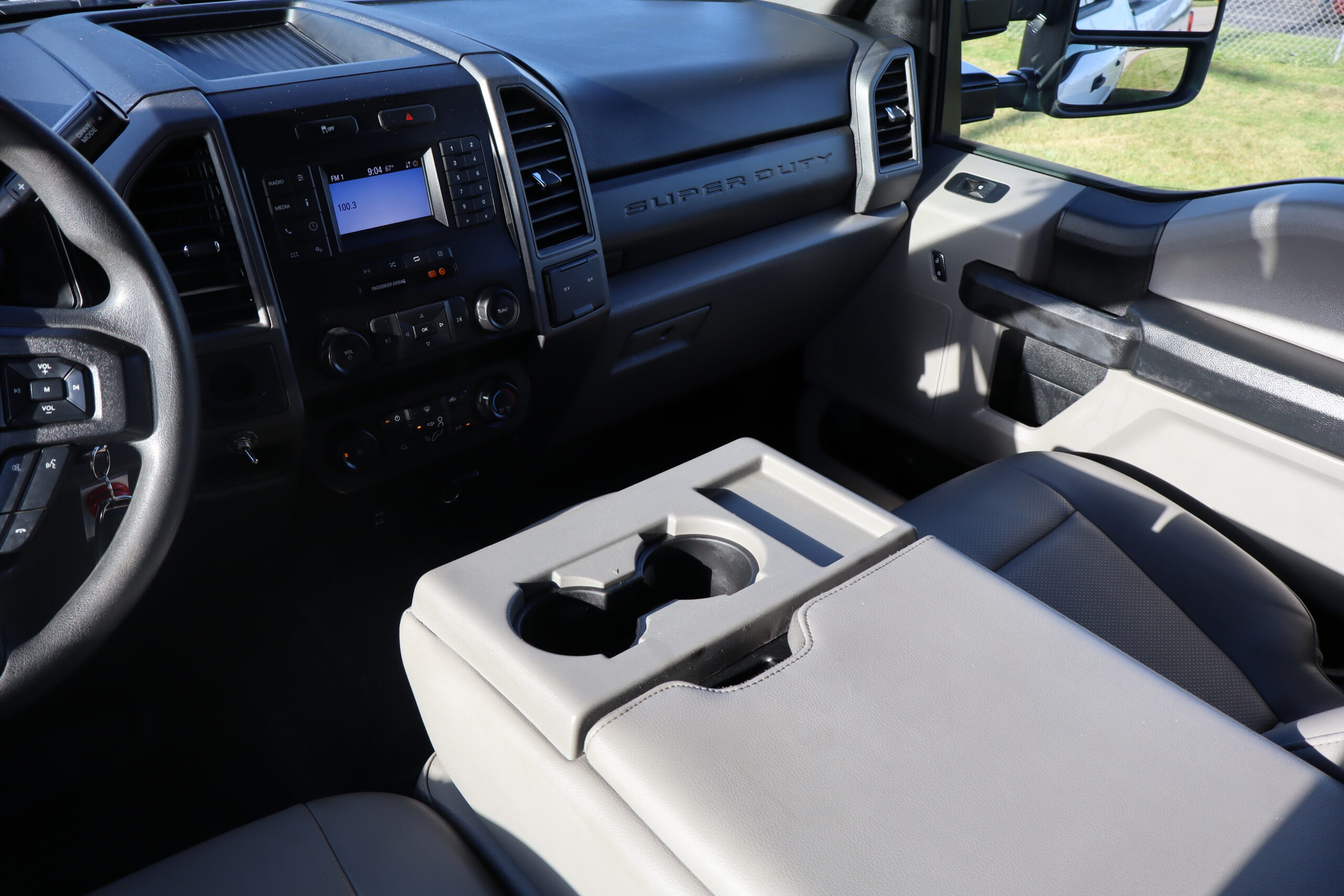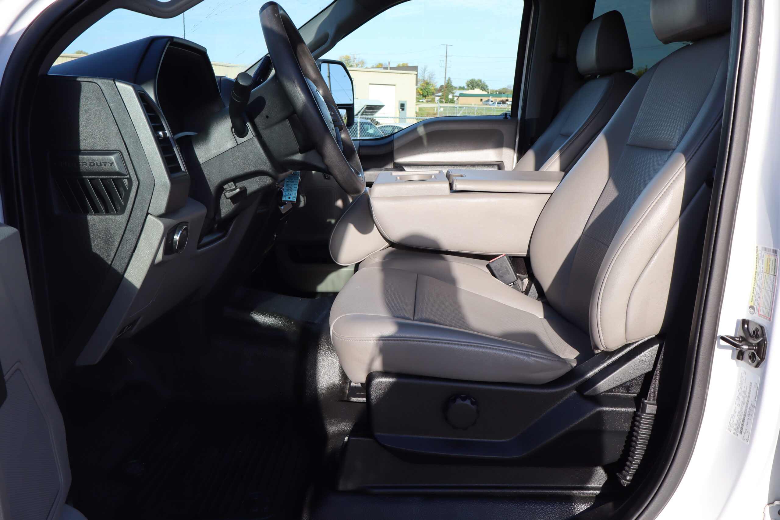 Exterior is Oxford White, Interior is Medium Earth Gray heavy duty vinyl, 40/20/40 seats in front with center console with storage compartments, 60/40 rear folding bench, power windows and power door locks, tilt and telescoping wheel, cruise control, air conditioning, AM/FM stereo, Bluetooth, dual glove boxes, driver’s information center, Ford Pass Connect, multi-function steering wheel controls, compass/temperature/mileage display in dash, day/night rear view mirror, locking tailgate, side air bags, power/heated manual telescoping and folding tow mirrors with turn signals, dark tinted windows, 10,000# GVW package, tow package, trailer wiring, multi 12v power point, black platform and trailer sway control.