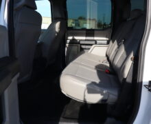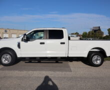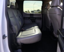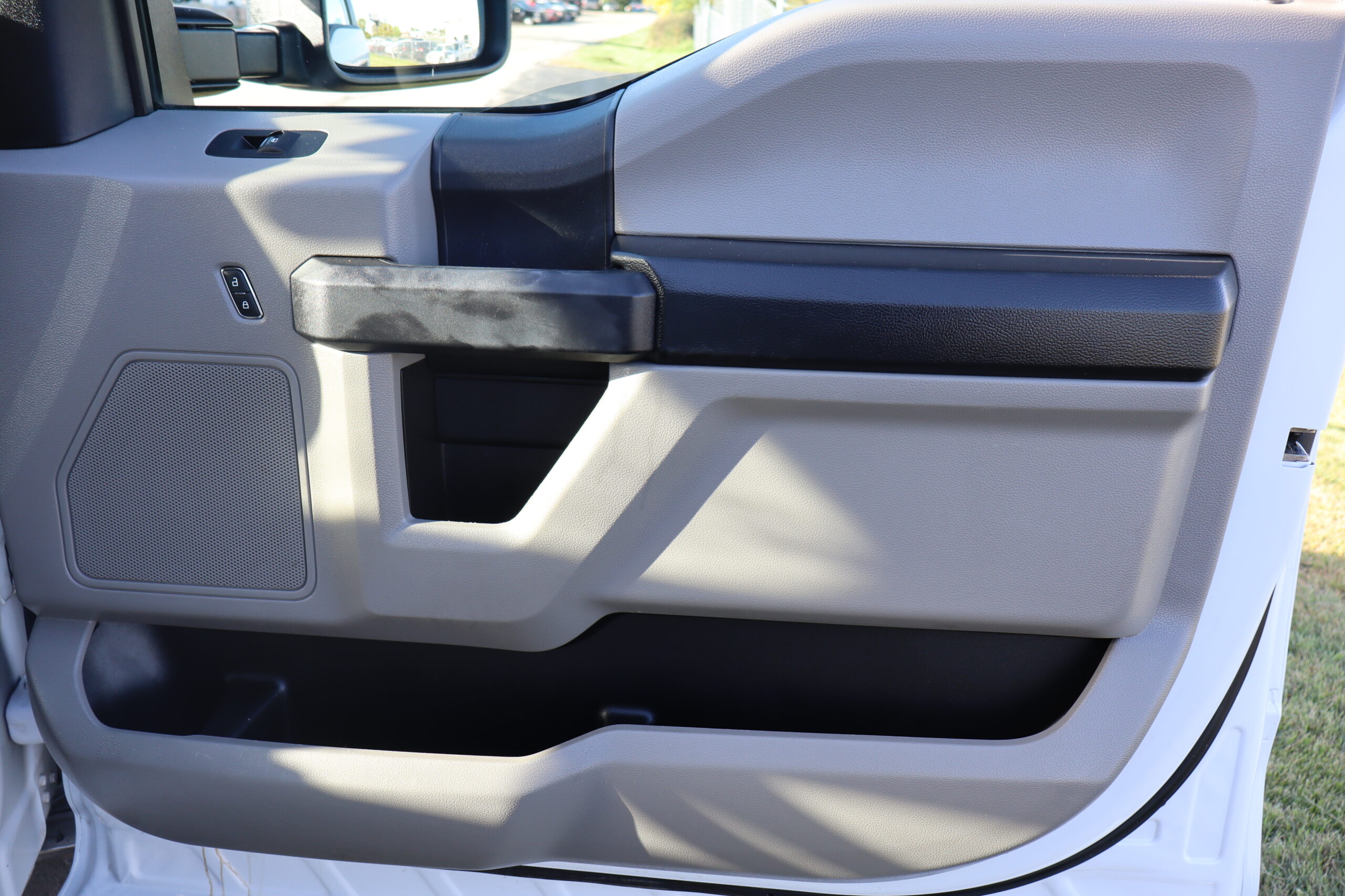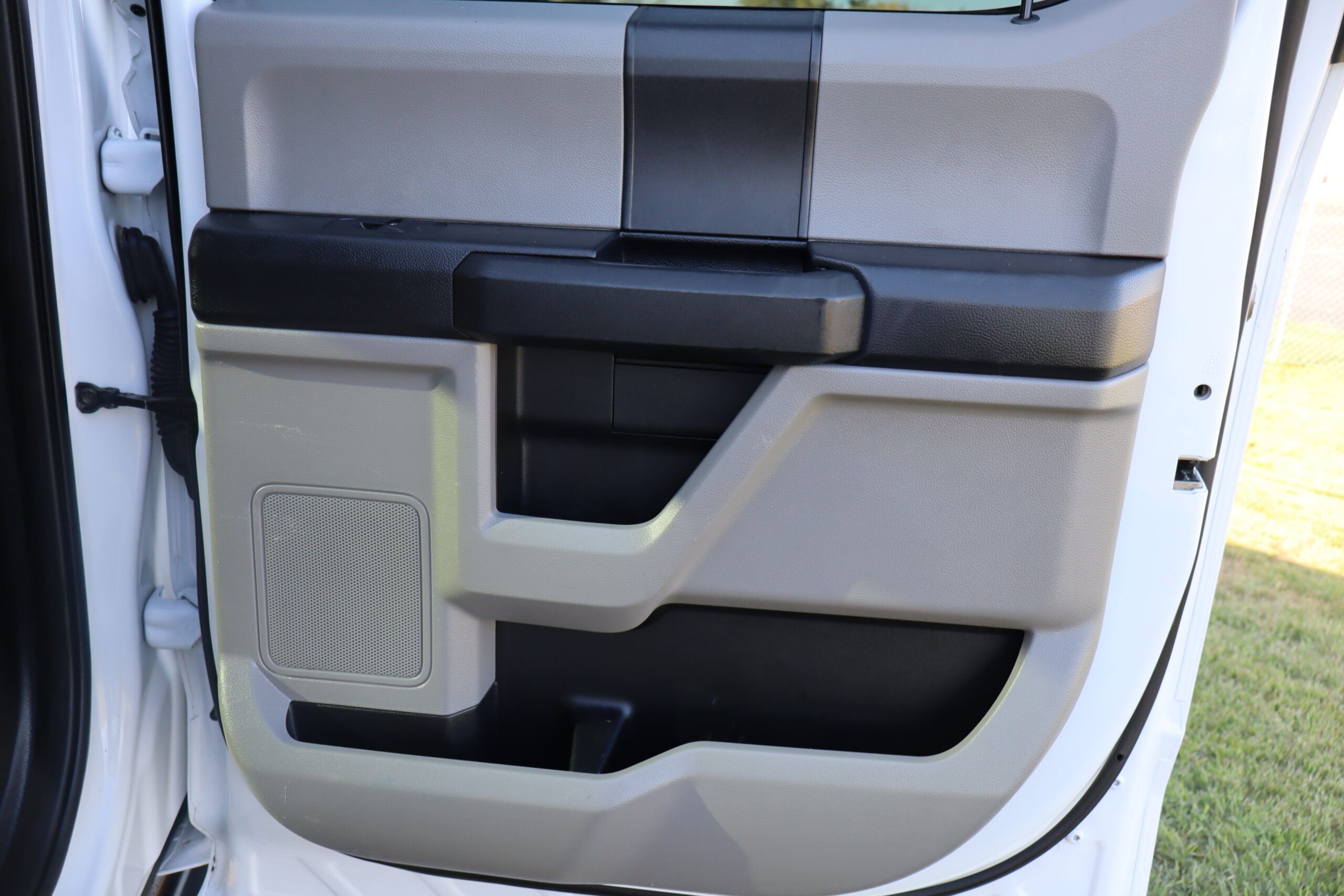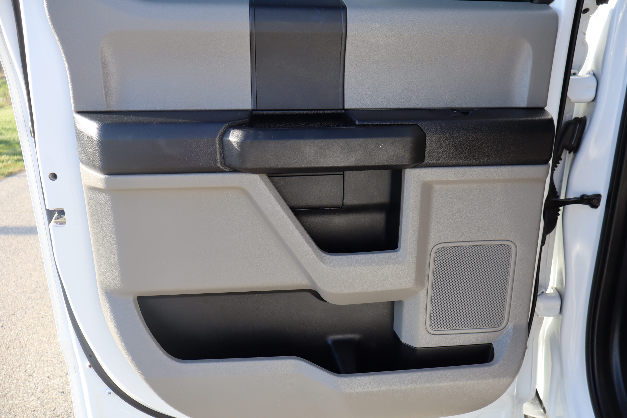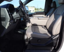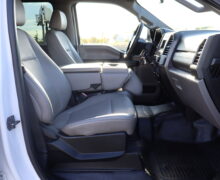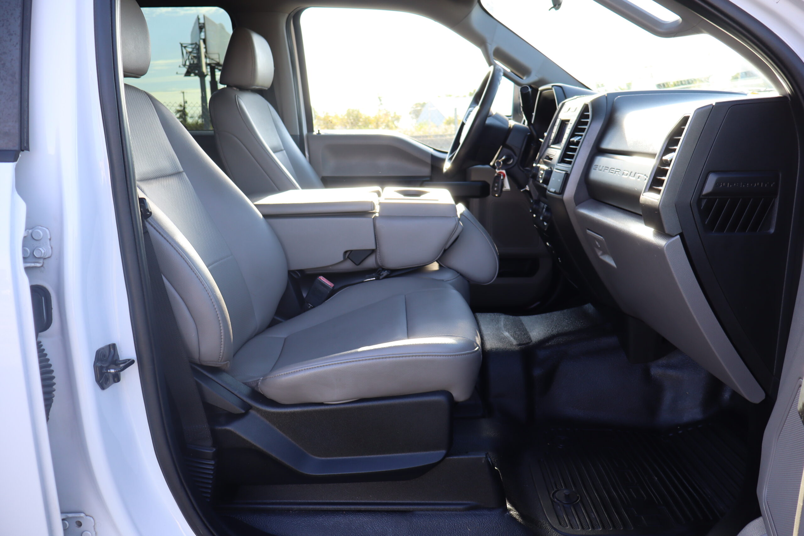 Exterior is Oxford White, Interior is Medium Earth Gray heavy duty vinyl, 40/20/40 seats in front with center console with storage compartments, 60/40 rear folding bench, power windows and power door locks, tilt and telescoping wheel, cruise control, air conditioning, AM/FM stereo, Bluetooth, dual glove boxes, driver’s information center, Ford Pass Connect, multi-function steering wheel controls, compass/temperature/mileage display in dash, day/night rear view mirror, locking tailgate, side air bags, power/heated manual telescoping and folding tow mirrors with turn signals, dark tinted windows, 10,000# GVW package, tow package, trailer wiring, multi 12v power point, black platform and trailer sway control.