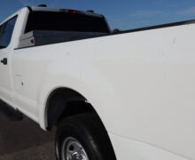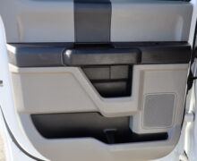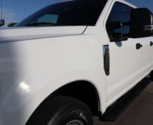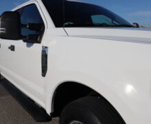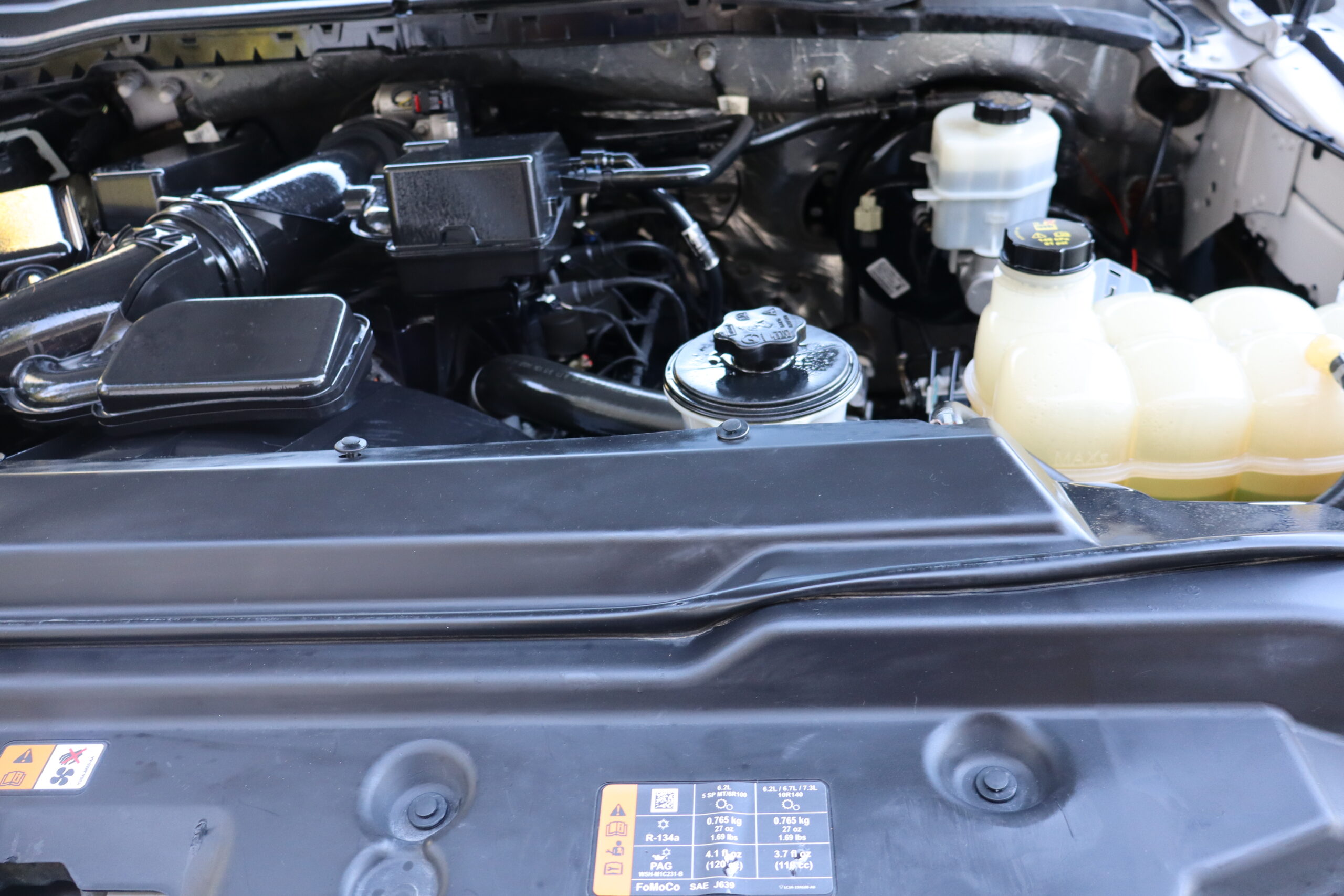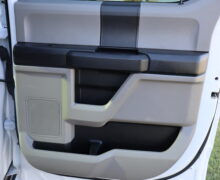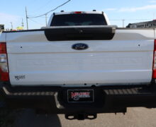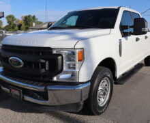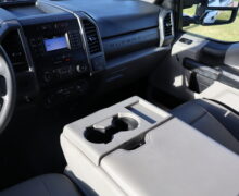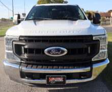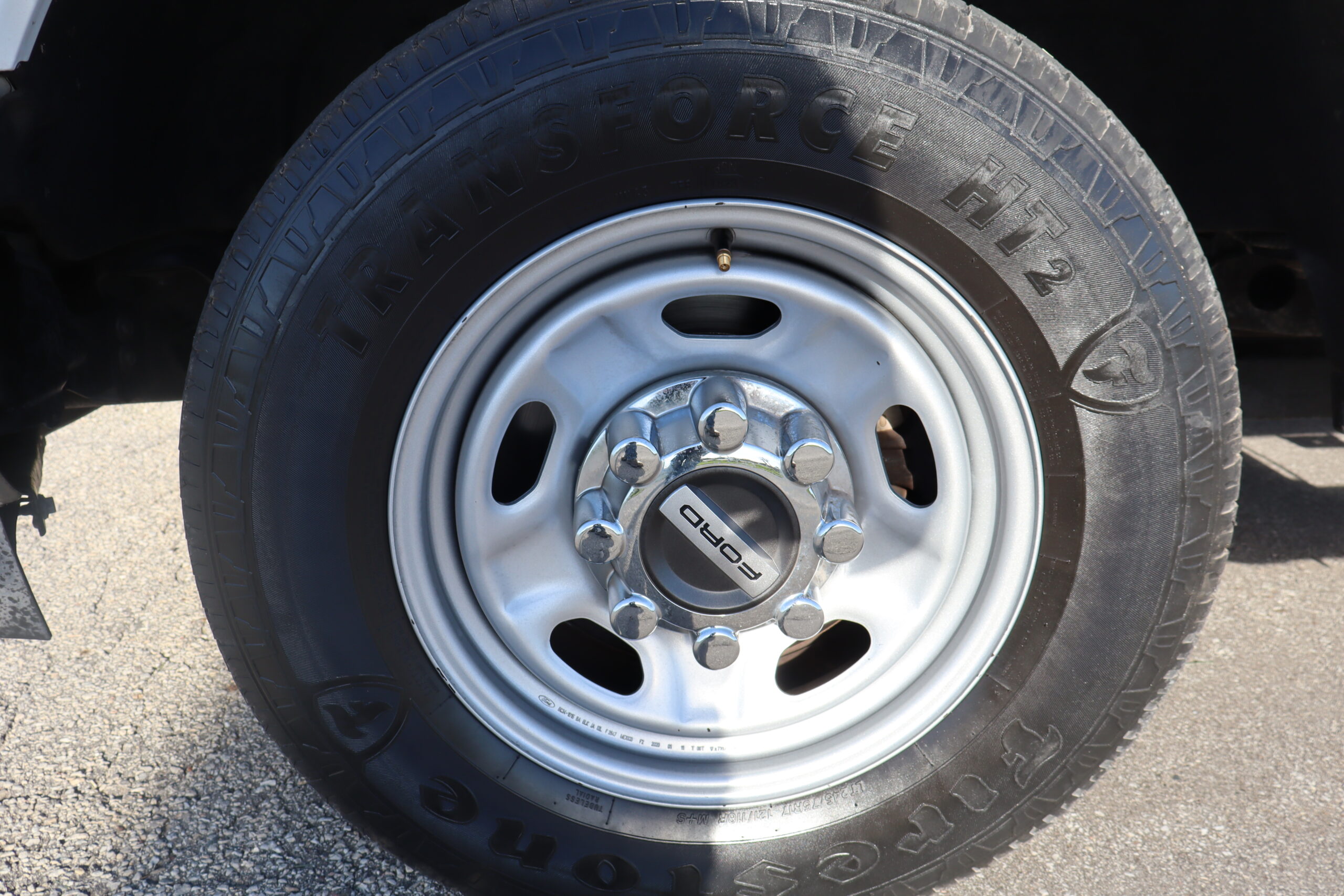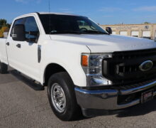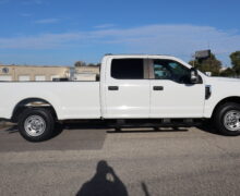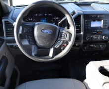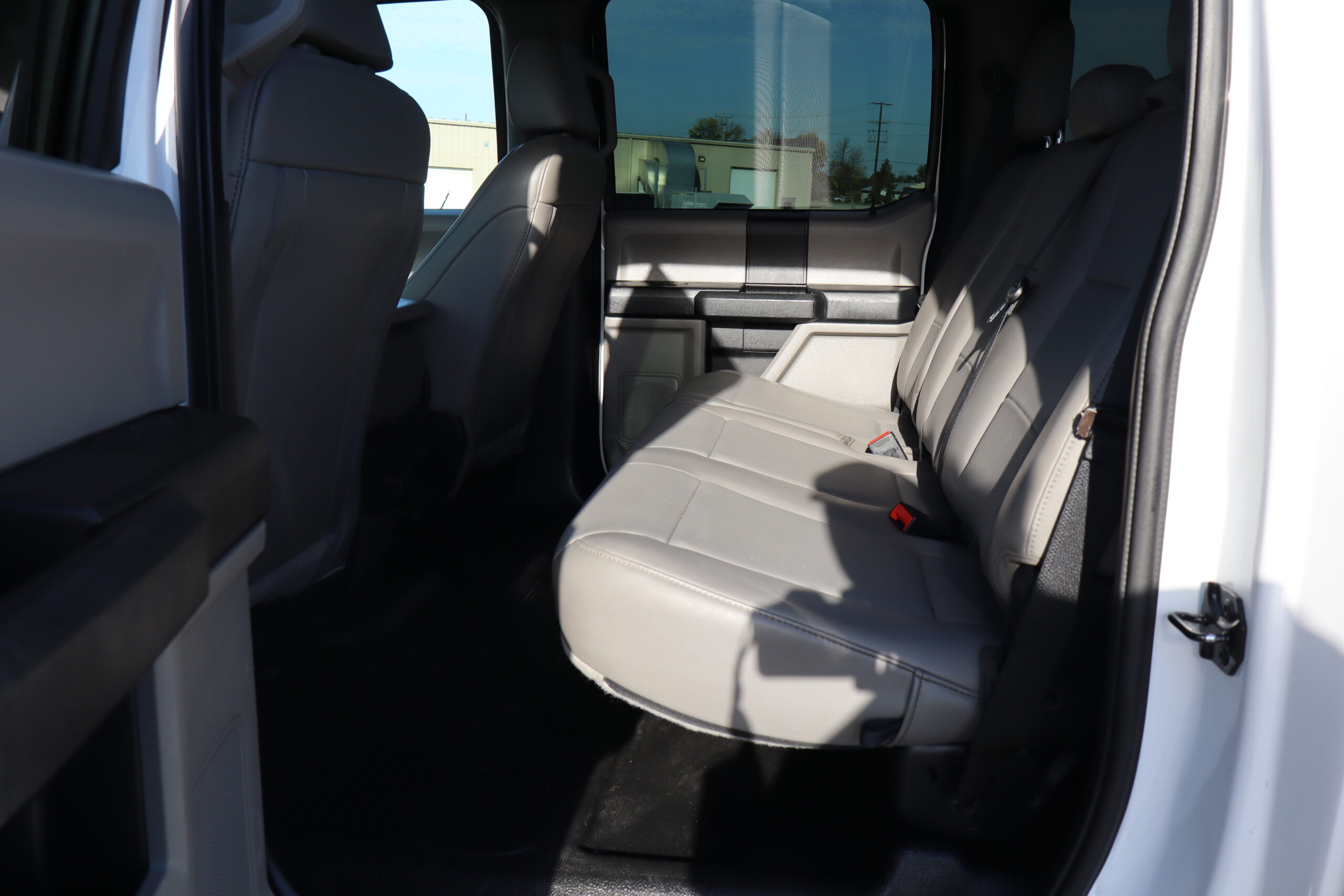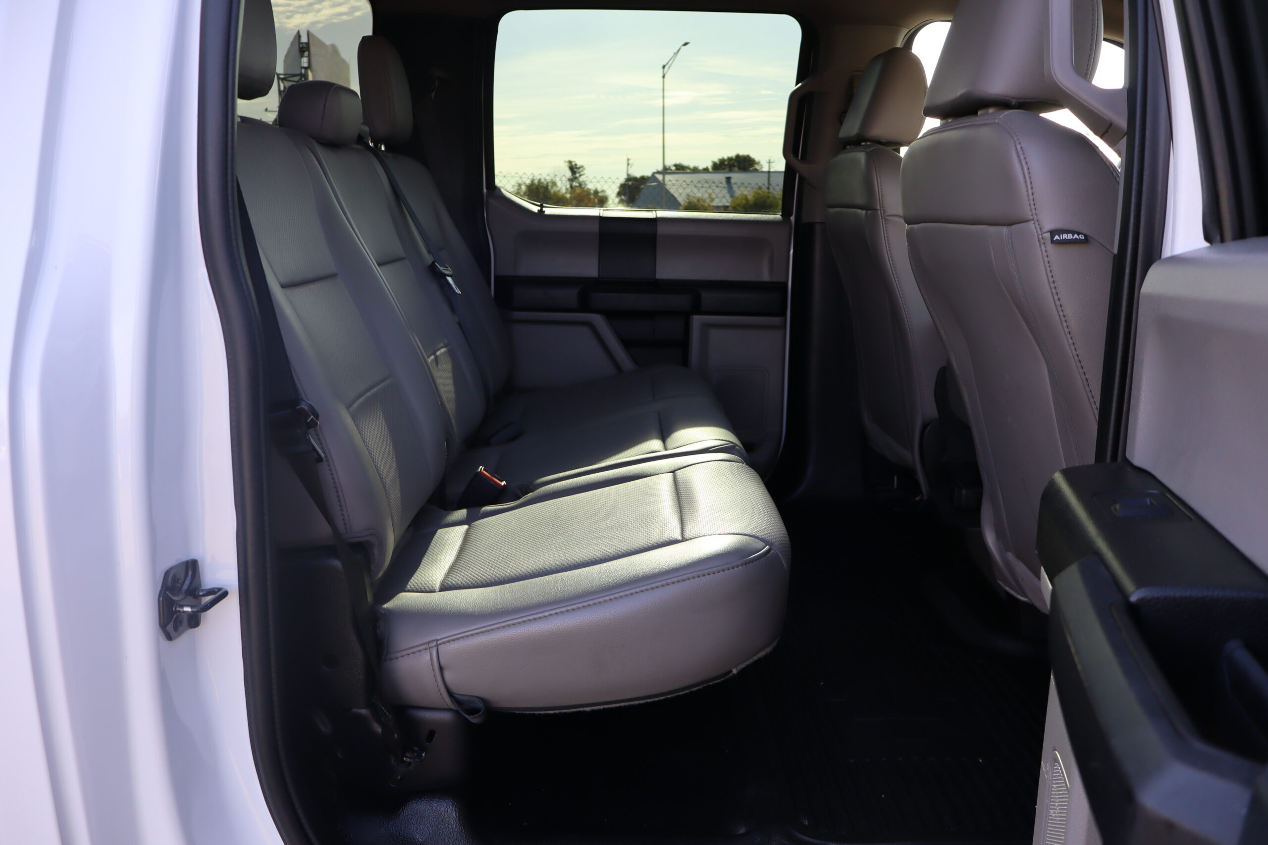Exterior is Oxford White, Interior is Medium Earth Gray heavy duty vinyl, 40/20/40 seats in front with center console with storage compartments, 60/40 rear folding bench, power windows and power door locks, tilt and telescoping wheel, cruise control, air conditioning, AM/FM stereo, Bluetooth, dual glove boxes, driver’s information center, Ford Pass Connect, multi-function steering wheel controls, compass/temperature/mileage display in dash, day/night rear view mirror, locking tailgate, side air bags, power/heated manual telescoping and folding tow mirrors with turn signals, dark tinted windows, 10,000# GVW package, tow package, trailer wiring, multi 12v power point, black platform and trailer sway control.