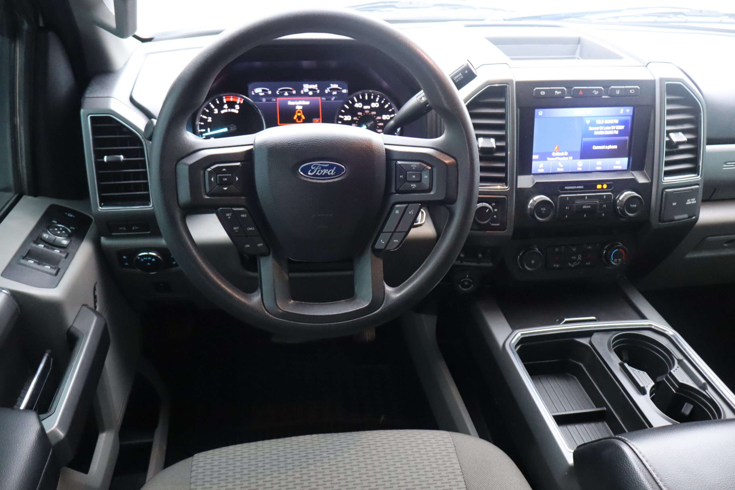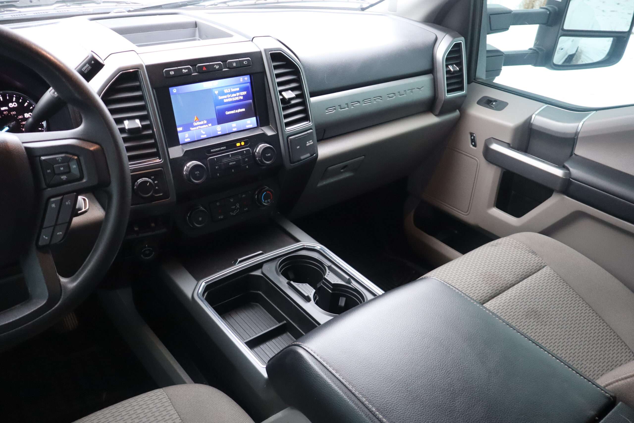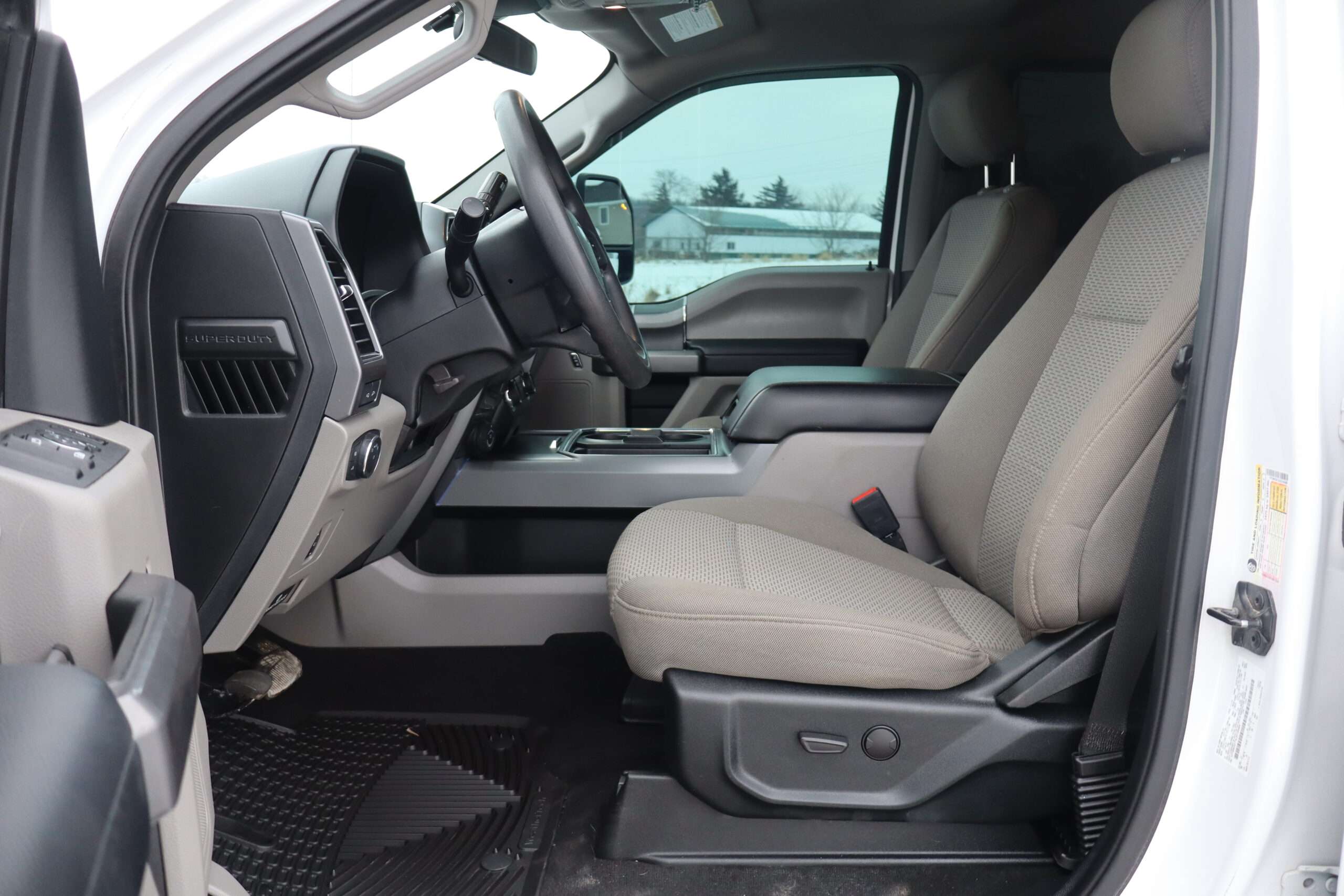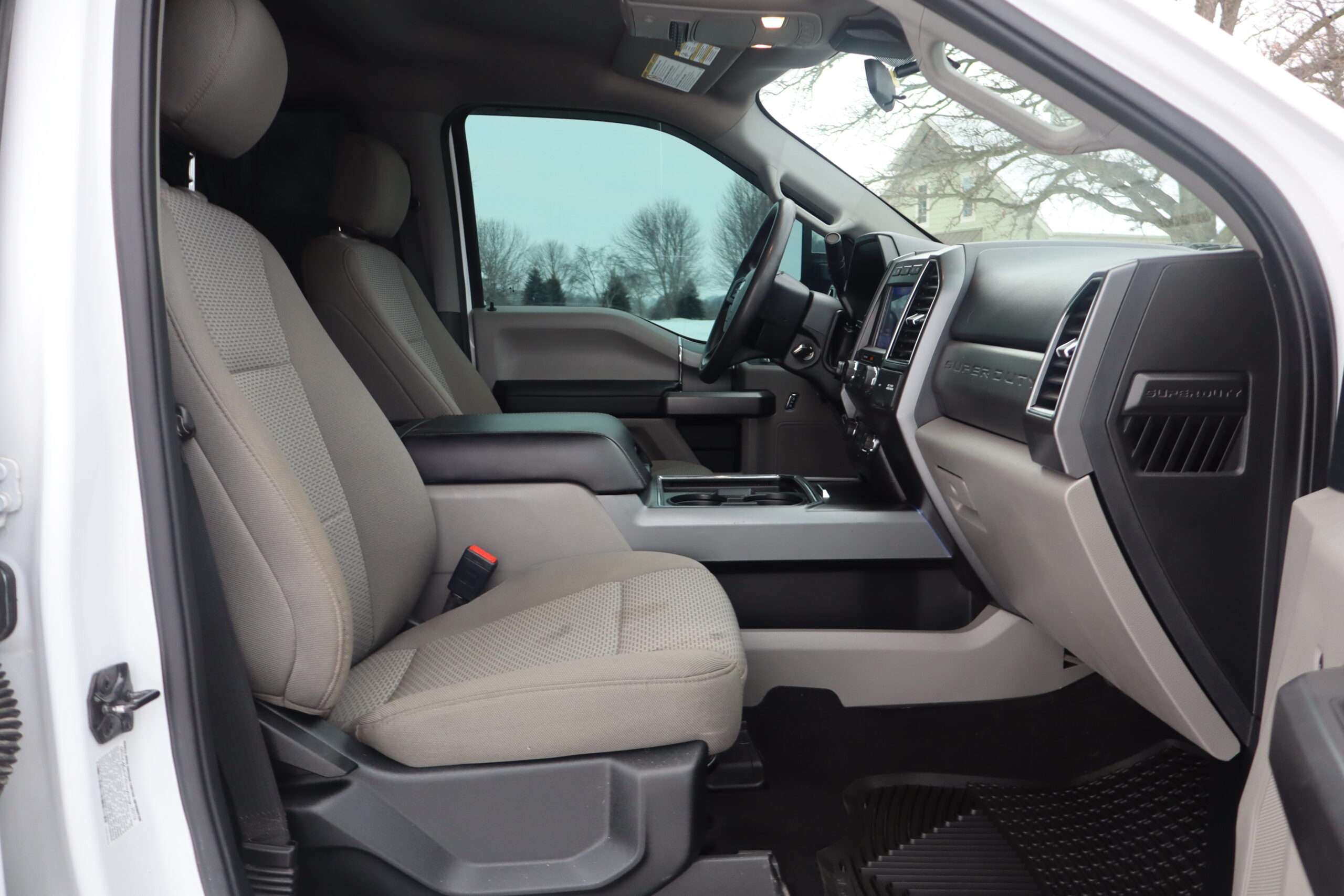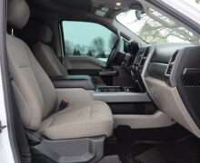 Exterior is Oxford White, Interior is Medium Earth Gray cloth, heated bucket seating in front with center console, 6-way power driver’s seat with power lumbar, 60/40 rear folding bench with under seat storage, traction control, hill start assist, electric rear glass defrost, power windows and power door locks, tilt and telescoping wheel, power adjustable pedals, cruise control, air conditioning, 8″ touch screen with navigation, AM/FM stereo, Sirius satellite radio ready, Android Auto, Apple Car Play, multi-plug 12v power point, 110v outlet, 115v bed outlet, driver’s information center, Bluetooth capabilities, SYNC III, multi-function steering wheel controls, compass/temperature/mileage display in dash, day/night rear view mirror, remote entry, side air bags, door code entry, chrome power/heated extendable folding tow mirrors with LED lighting, cab clearance lights, camper package, pro trailer back up assist, 5th wheel prep, 6″ chrome step boards, towing package with receiver, trailer wiring, factory electronic brake controller, tailgate step and up-fitter switches.