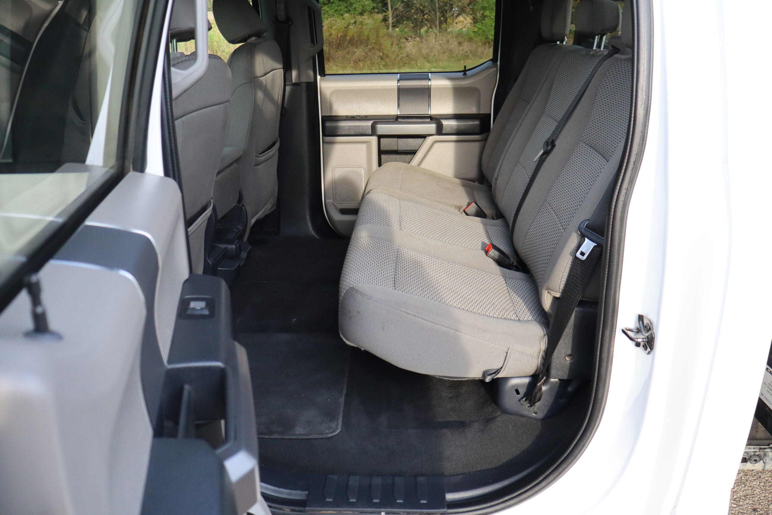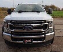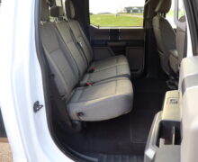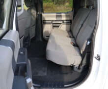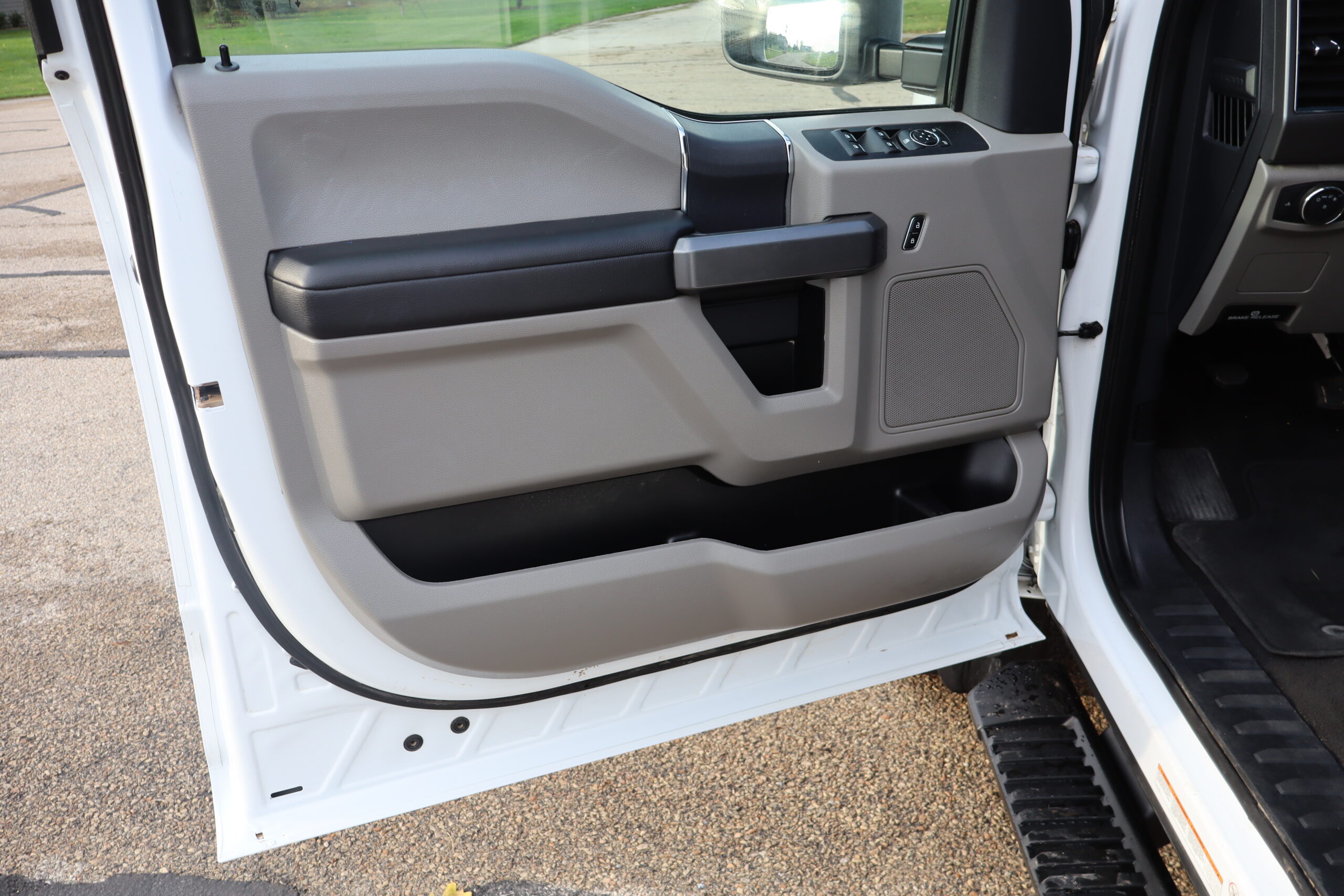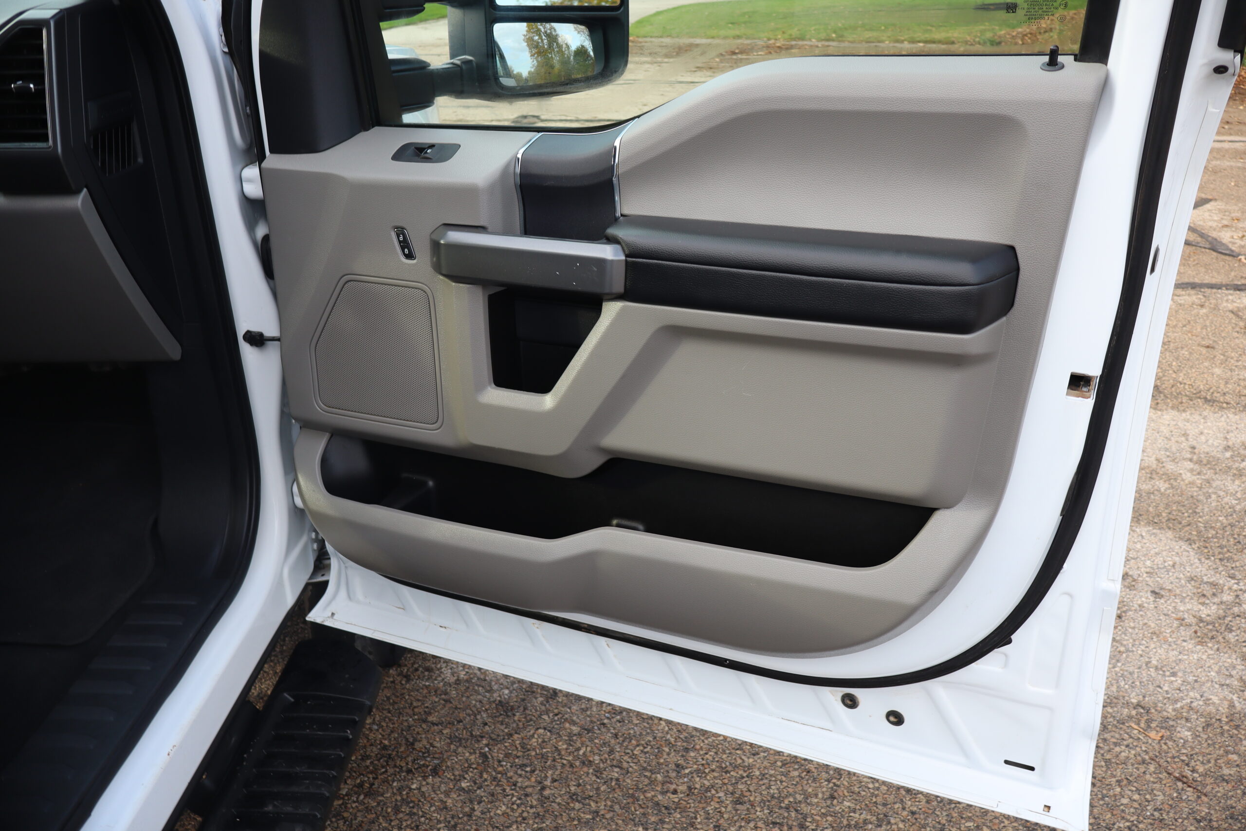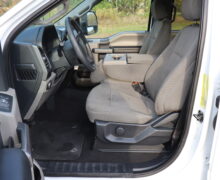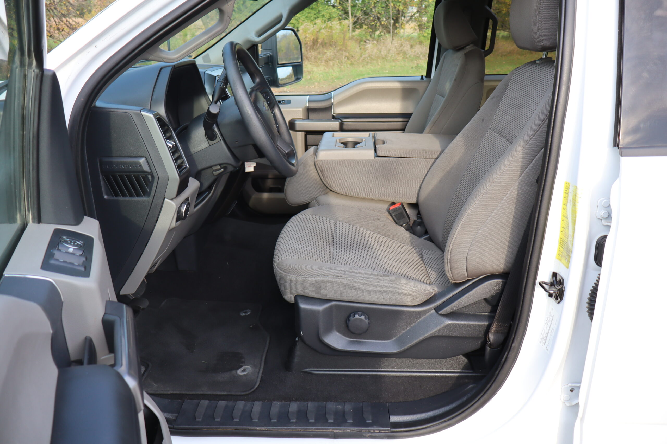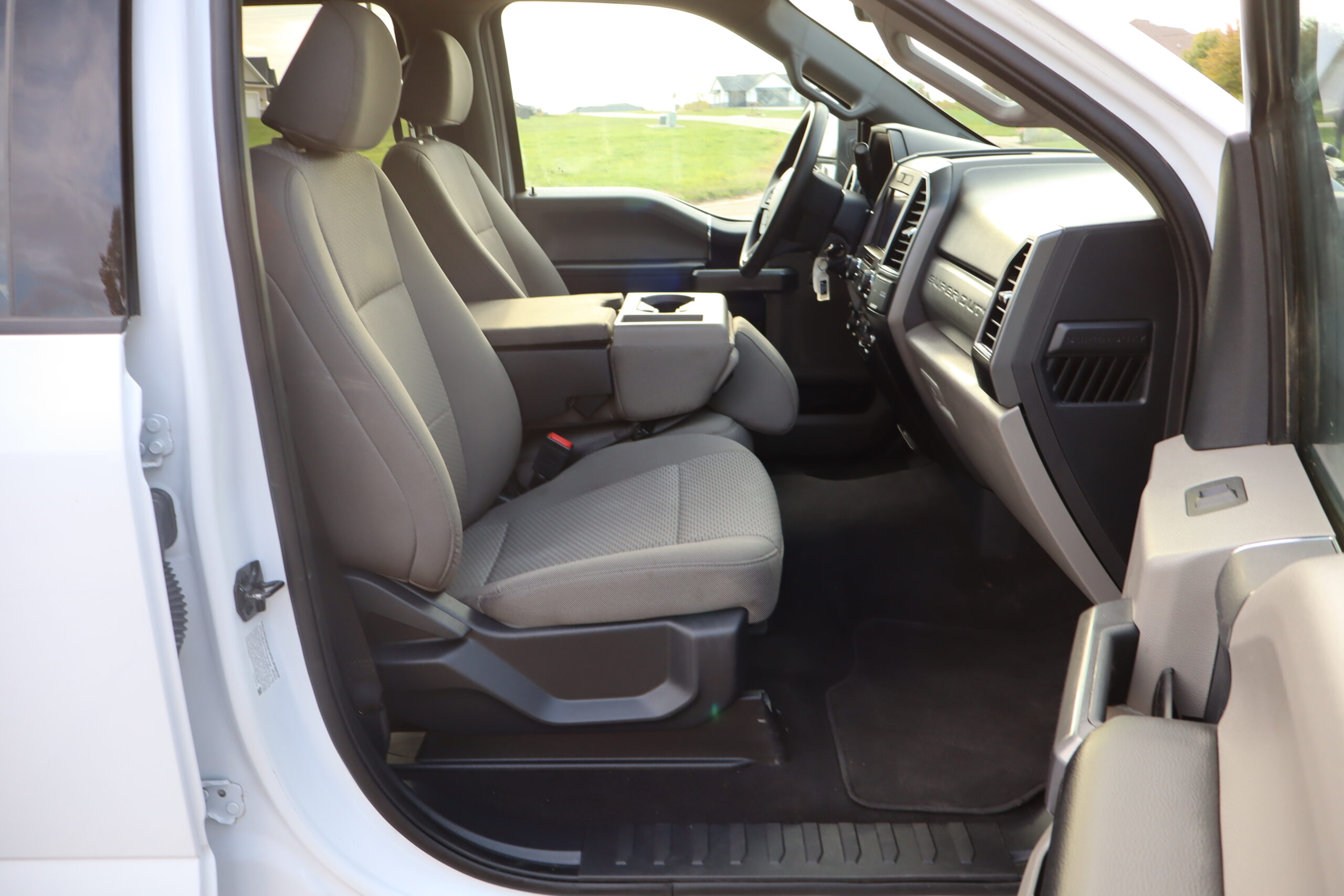 Exterior is Oxford White, Interior is Steel Gray cloth, 40/20/40 seats with folding center console and storage compartments, 60/40 rear folding bench, tilt and telescoping wheel, power windows and power door locks, air conditioning, rear defrost, SYNC III with 8″ touch screen, AM/FM stereo, Apple Link, driver’s information center, temperature/mileage in dash, traction control, hill start assist, up-fitter switches, side air bags, power/heated tow mirrors with manual telescoping and marker lights, dual power point, 110v outlet, automatic headlights, cab clearance lights, day/night rear view mirror, black platform step boards, payload plus package upgrade, back up alarm, tow package with receiver and trailer wiring and factory electronic brake controller.