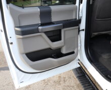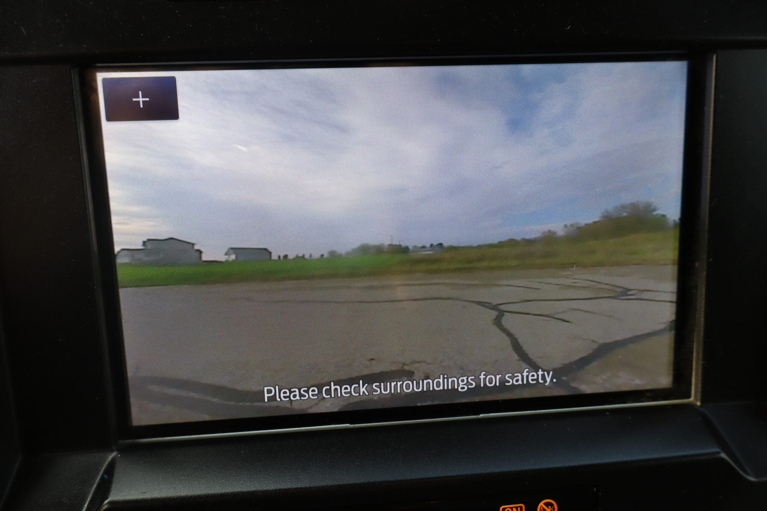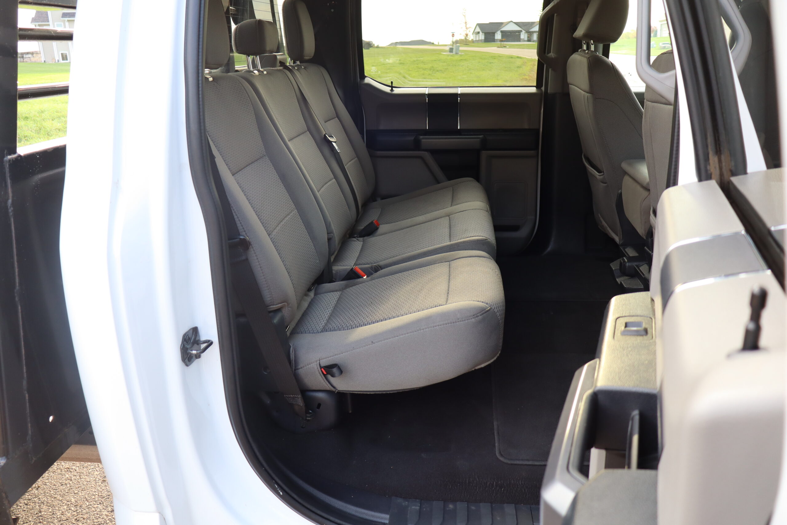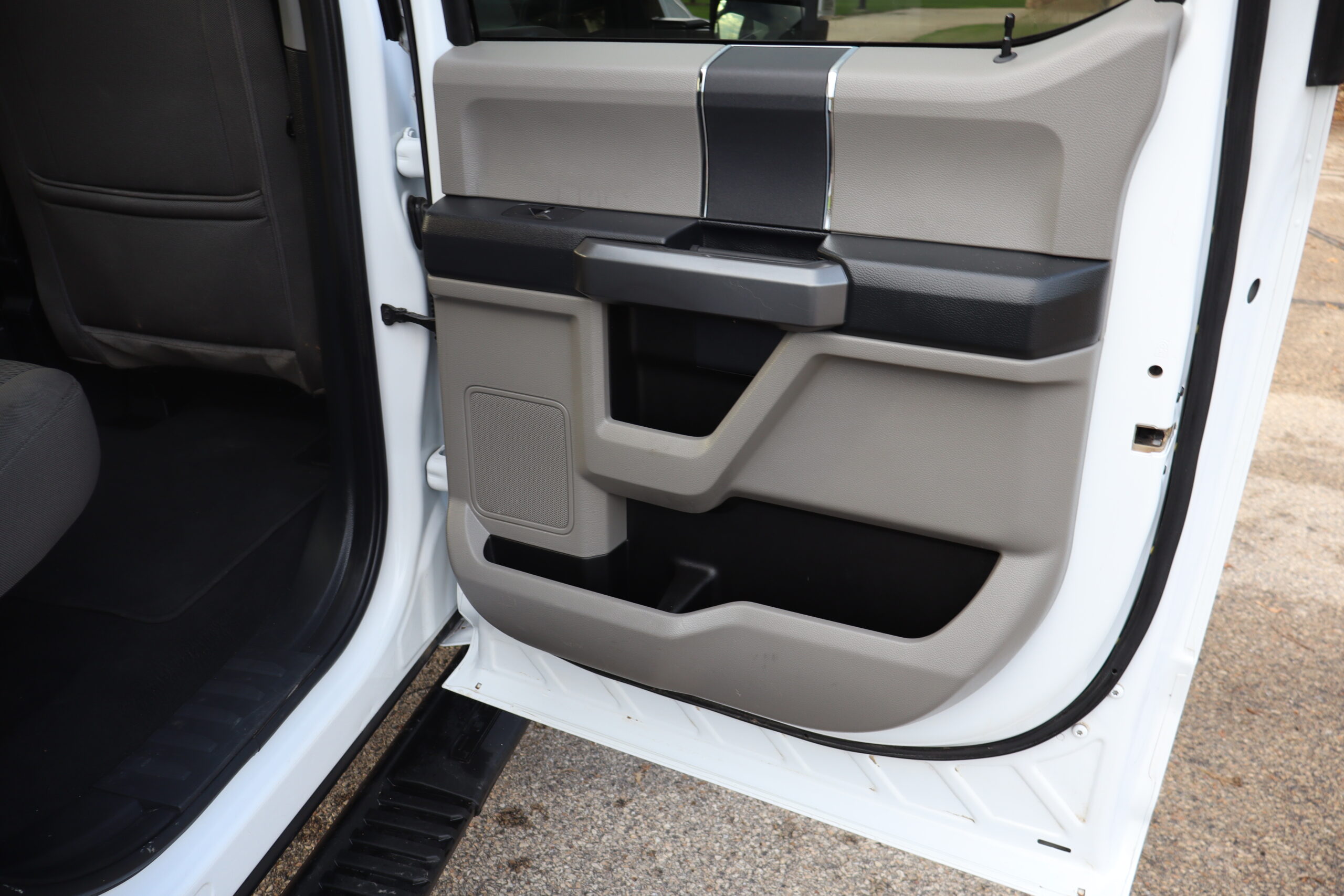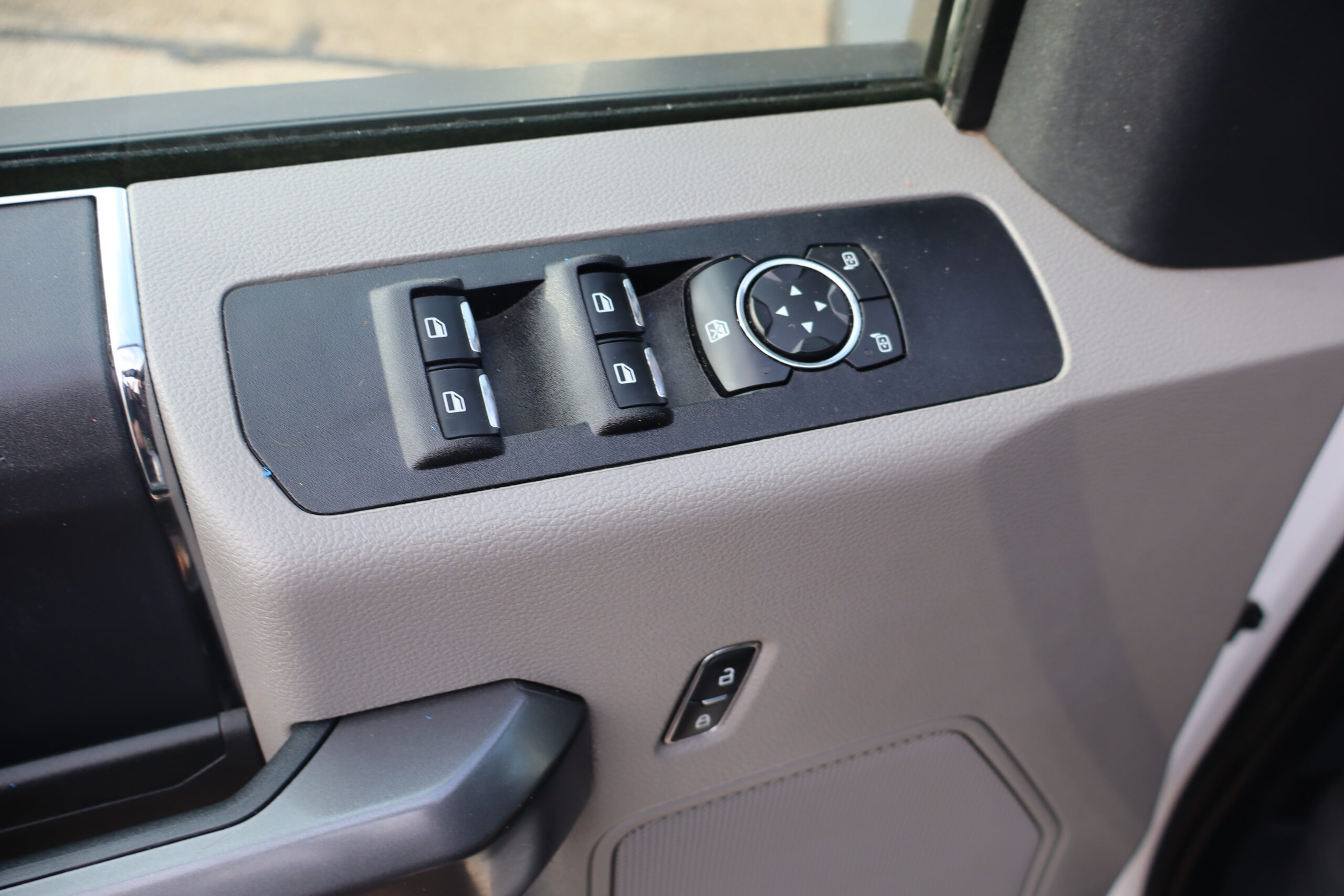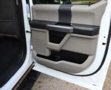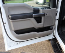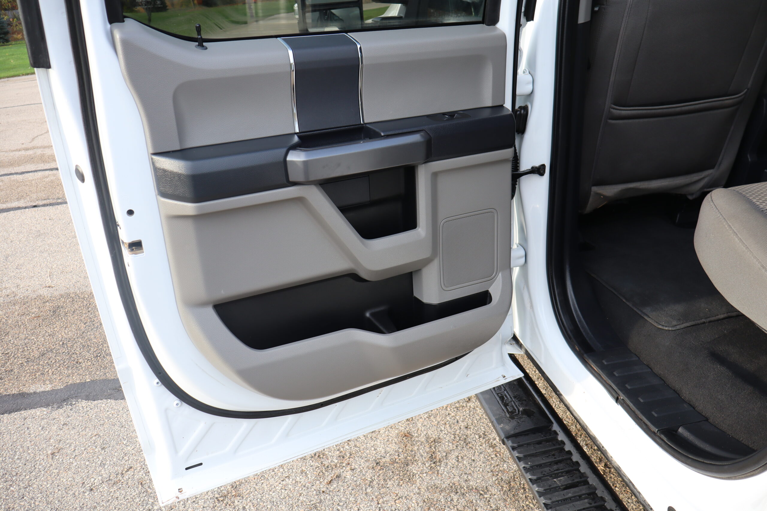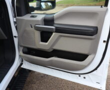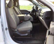 Exterior is Oxford White, Interior is Steel Gray cloth, 40/20/40 seats with folding center console and storage compartments, 60/40 rear folding bench, tilt and telescoping wheel, power windows and power door locks, air conditioning, rear defrost, SYNC III with 8″ touch screen, AM/FM stereo, Apple Link, driver’s information center, temperature/mileage in dash, traction control, hill start assist, up-fitter switches, side air bags, power/heated tow mirrors with manual telescoping and marker lights, dual power point, 110v outlet, automatic headlights, cab clearance lights, day/night rear view mirror, black platform step boards, payload plus package upgrade, back up alarm, tow package with receiver and trailer wiring and factory electronic brake controller.