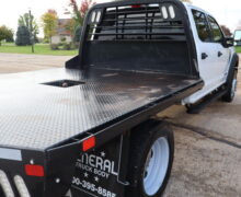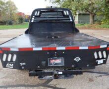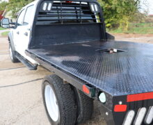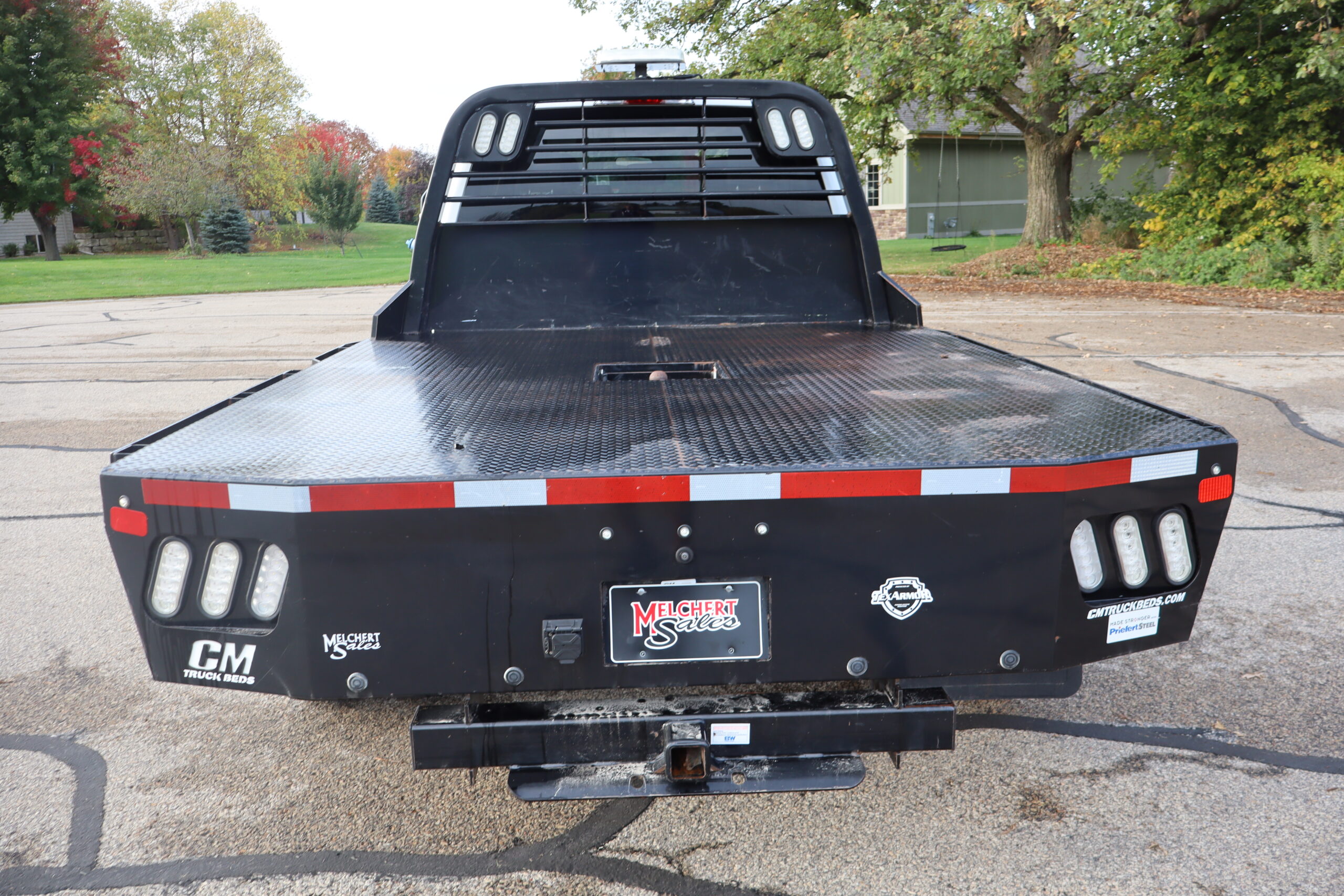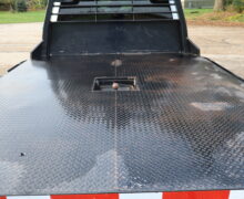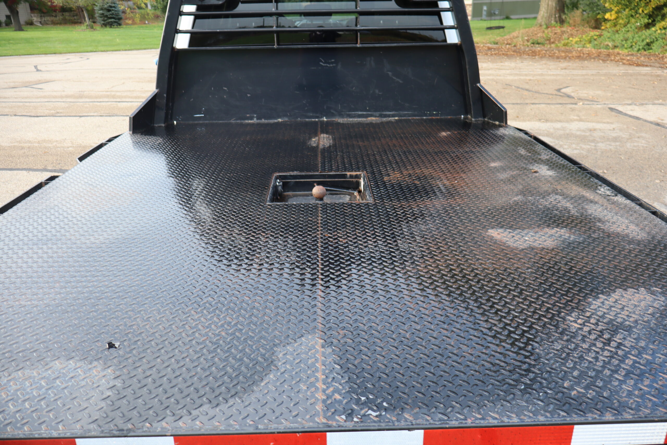 EXTRAS: 9’4″x8’2″ C&M Diamond plat steel flat bed with hidden goose neck ball with heavy duty hitch, strobe lights and rear park assist.