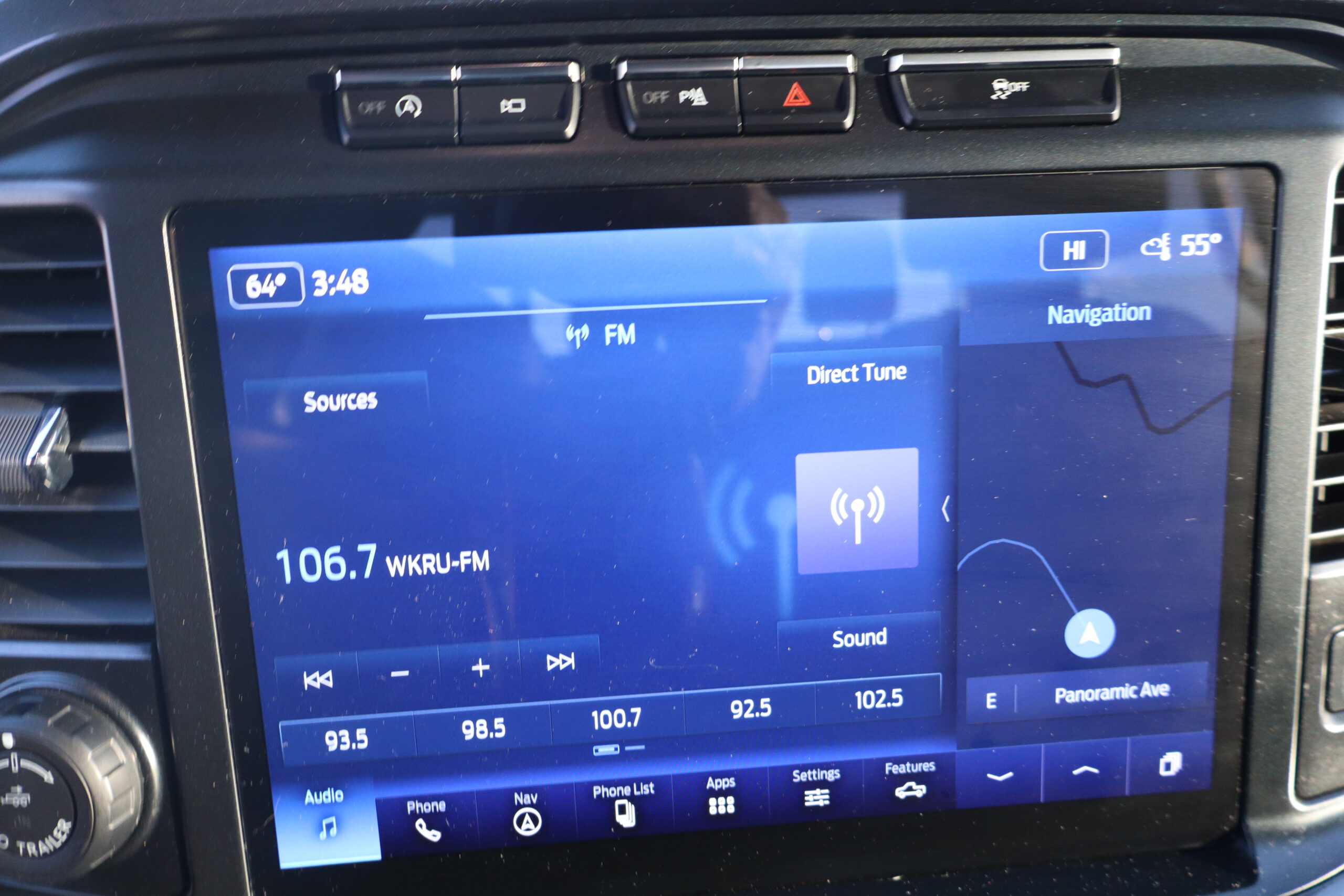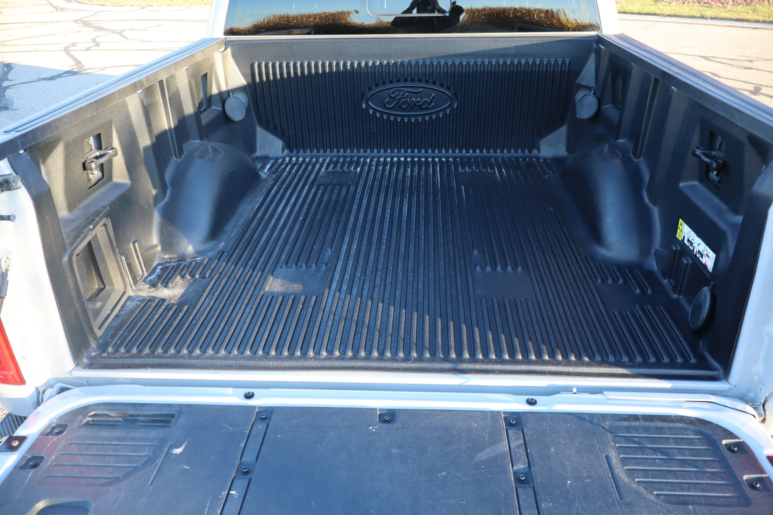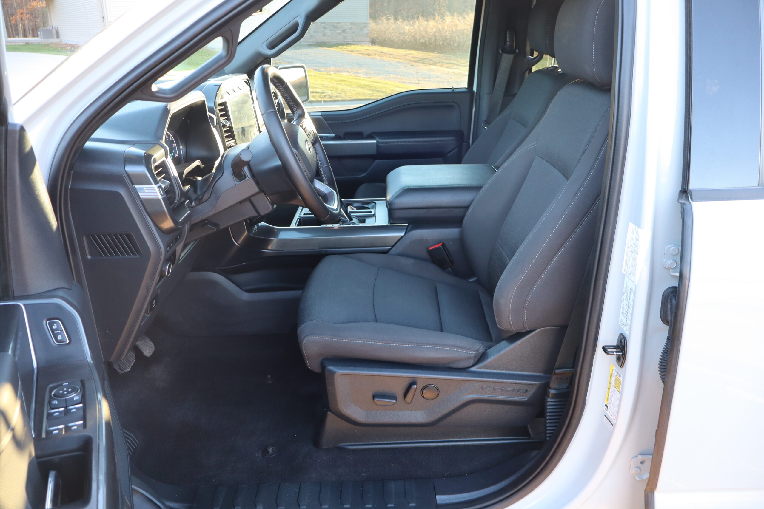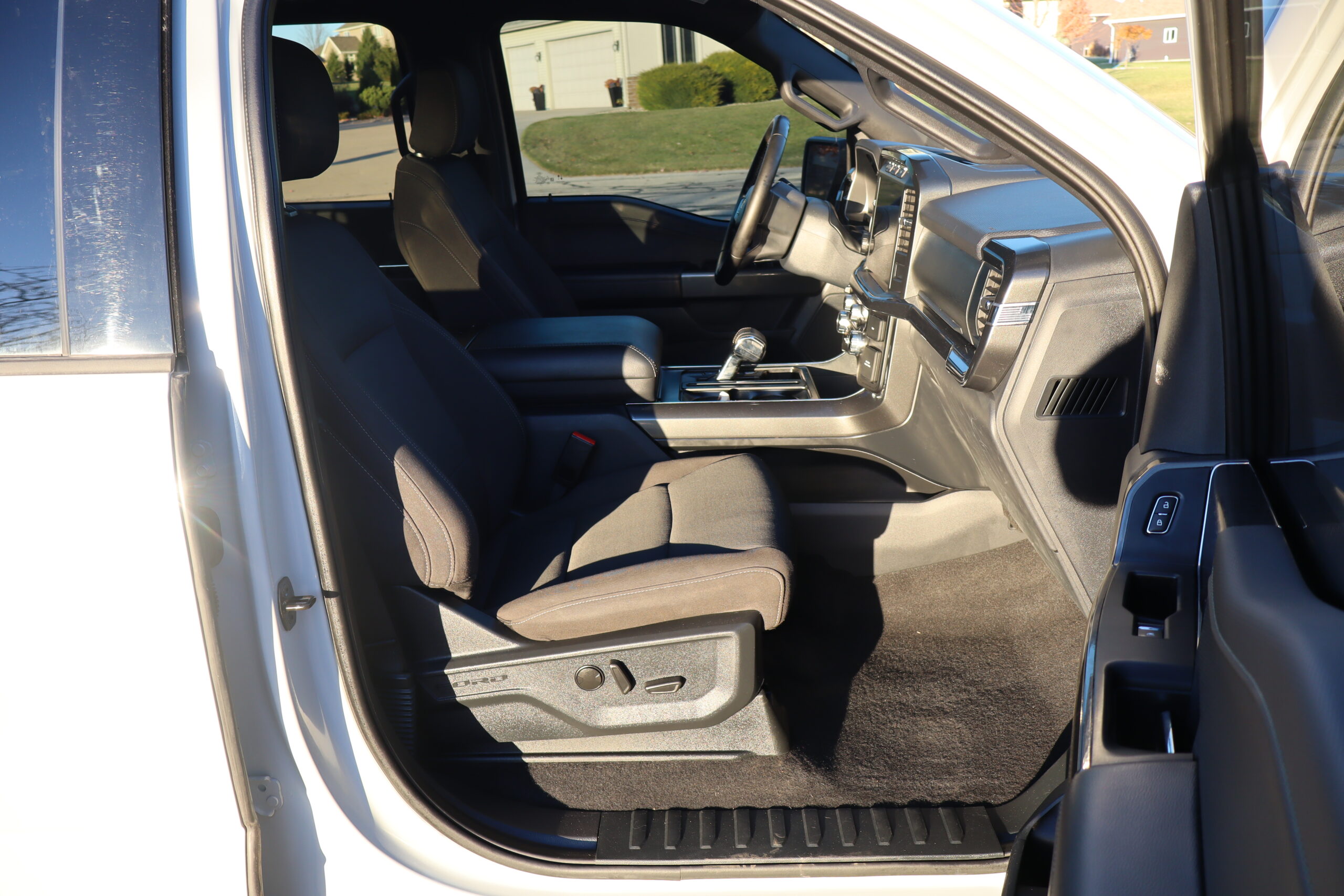 Exterior is Avalanche, Interior is Black sport cloth, heated way power bucket seats in front with hard center console, 8-way power driver’s and 6-way power passenger seat with power lumbar, 60/40 rear folding bench with under seat storage, power windows and power door locks, tilt and telescoping wheel, cruise control, air conditioning, electric rear window defrost, climate control, 12″ touch screen, navigation, AM/FM stereo, Android Auto, Apple Car Play, Sirius satellite radio ready, dual glove boxes, driver’s information center, Bluetooth capabilities, SYNC 4, multi-function steering wheel controls, compass/temperature/mileage display in dash, 360 view back up camera, back up assist, remote entry, door code entry, remote start, traction control, hill start assist, auto dimming rear view mirror, 120v converter, 400w bed outlet, power tailgate with remote, LED head lights, tail lights and fog lights, side air bags, power/heated folding mirrors with turn signals, sliding rear window, dark tinted glass, LED box lighting, Pro trailer back up assist, tow package with receiver and trailer wiring, factory electronic brake controller and slip in bed liner.