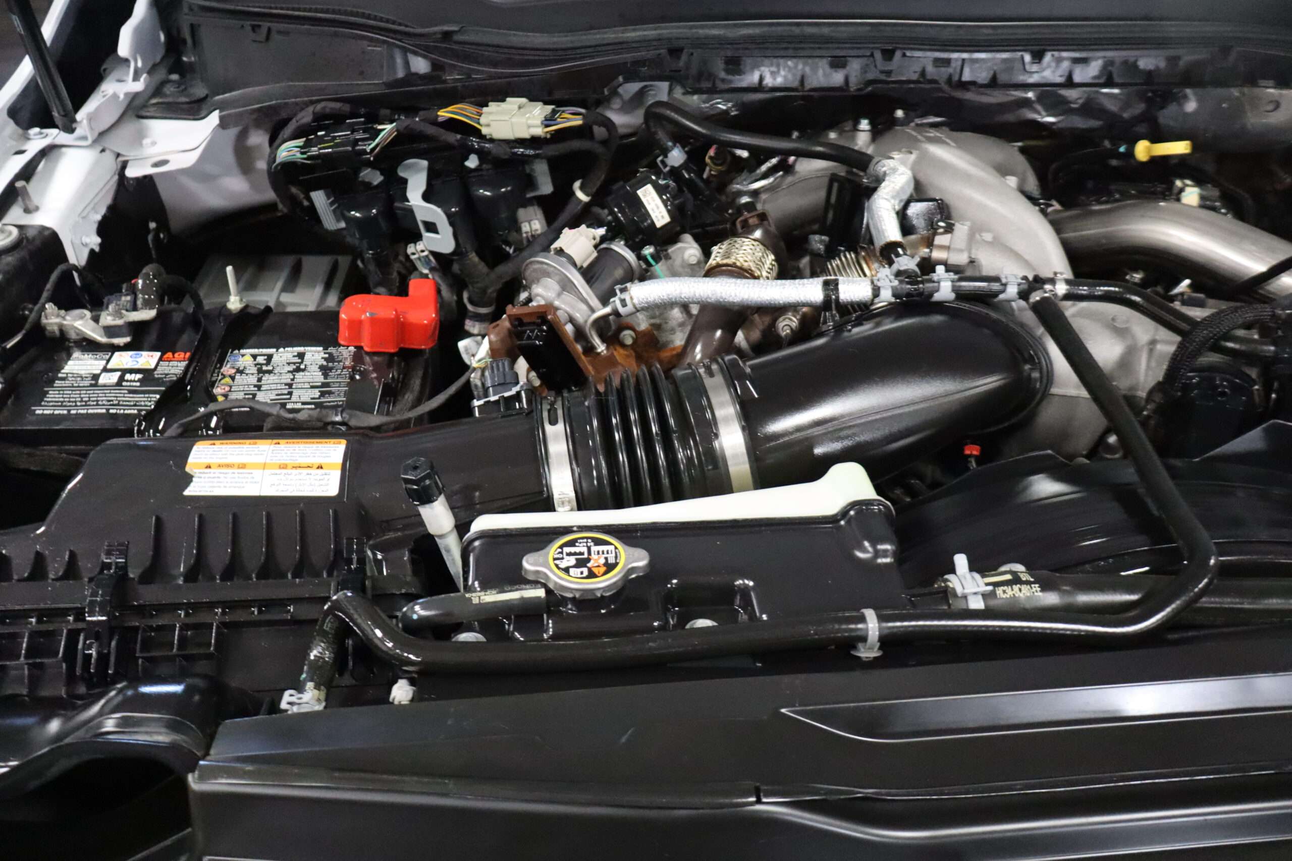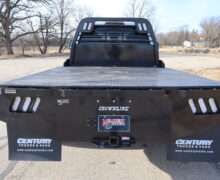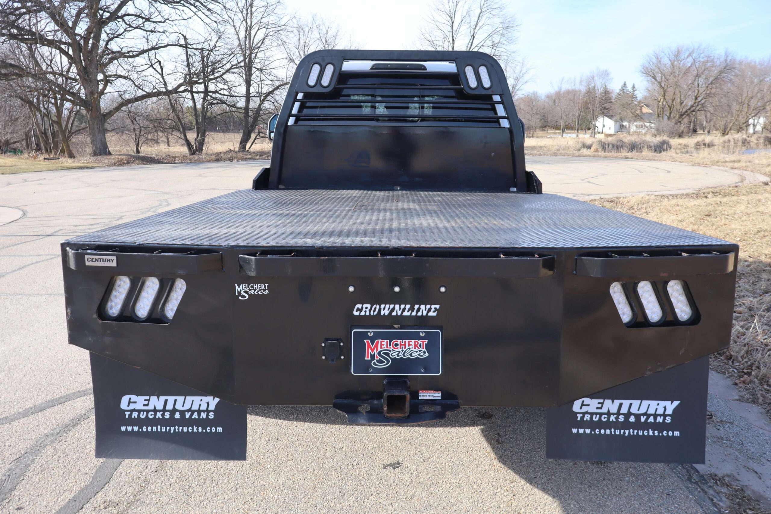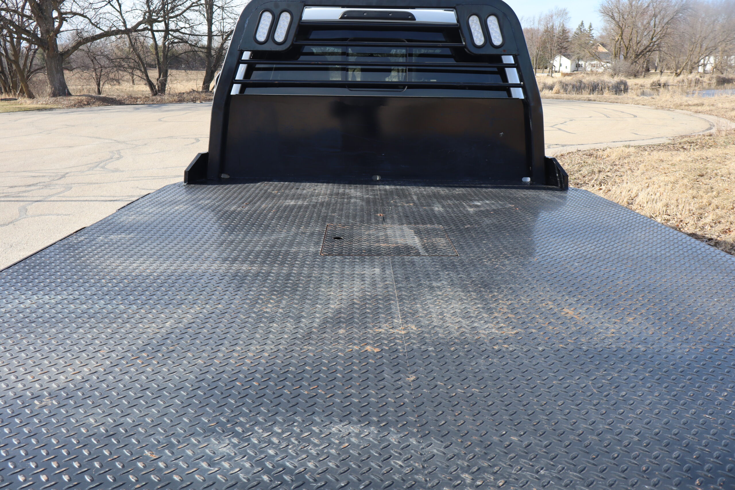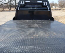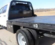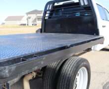 EXTRAS: 9′-9″x8′ Centry Diamond Plate Steel flat bed with hidden goose neck ball and heavy duty hitch and Husky floor liners.