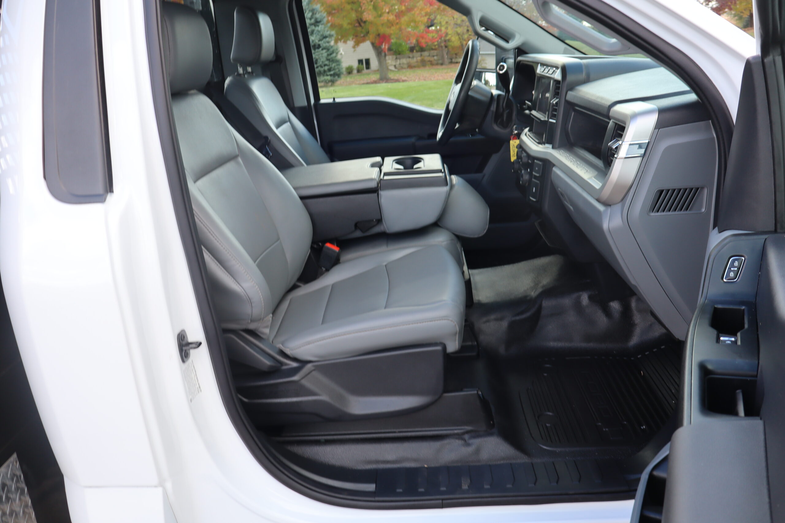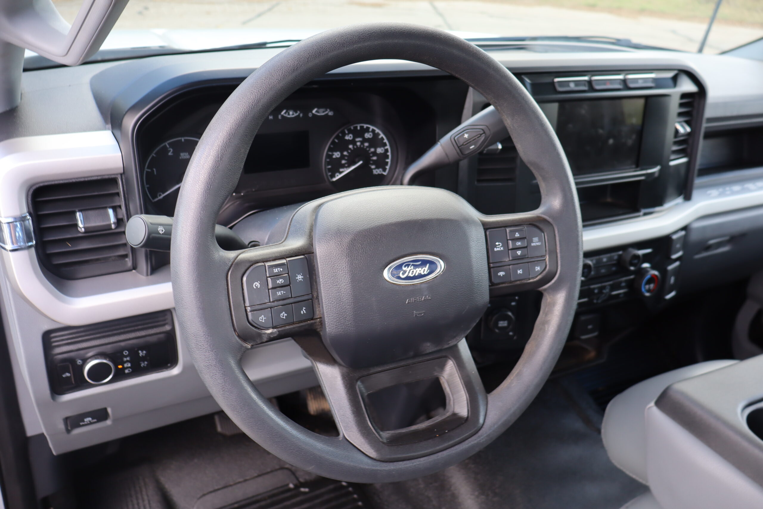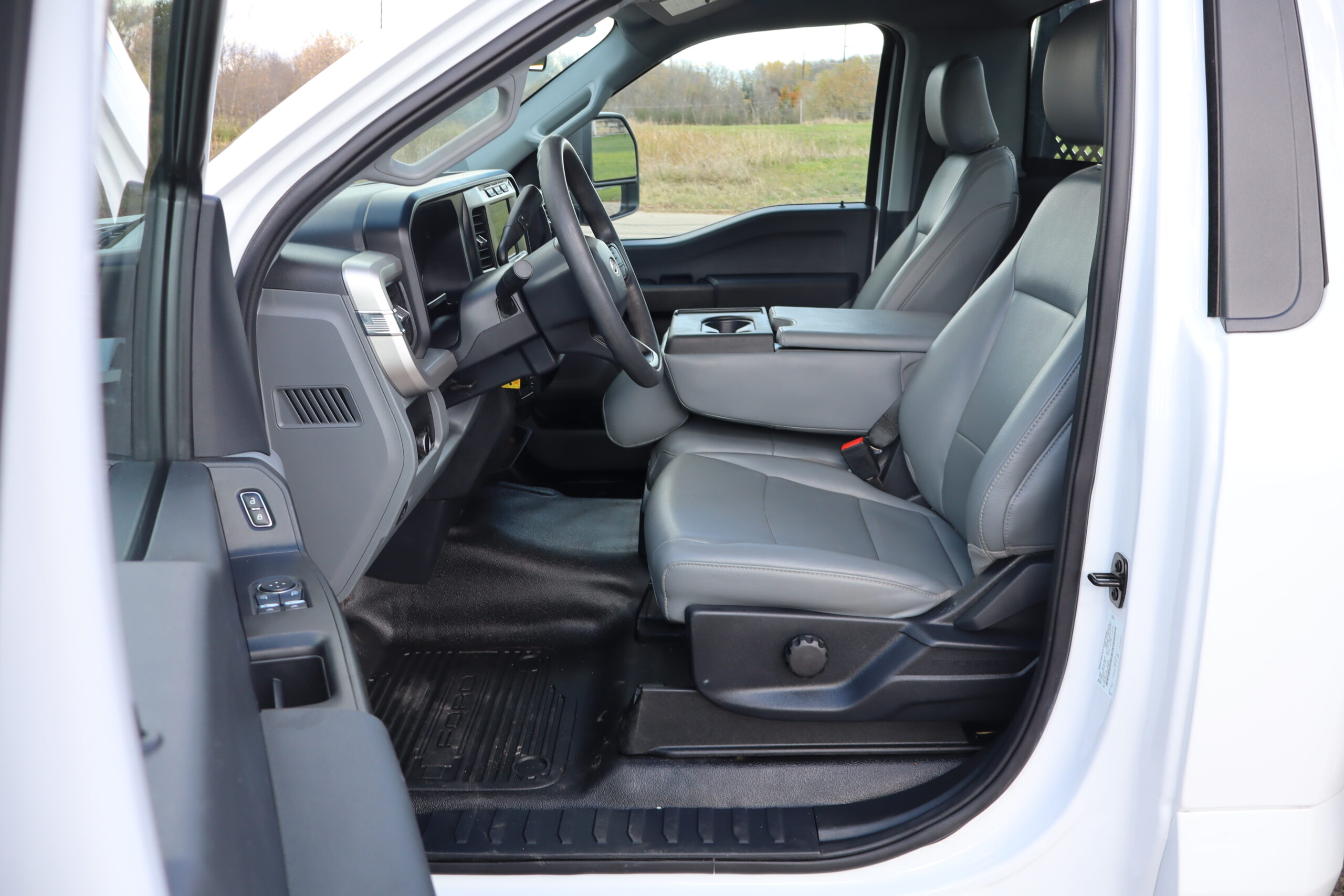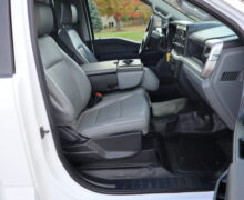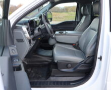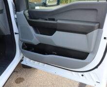 Exterior is Oxford White, Interior is Medium Earth Gray heavy duty vinyl, 40/20/40 seating in front with folding arm rest with dual built in storage compartments, traction control, power windows and power door locks, tilt and telescoping wheel, cruise control, air conditioning, Bluetooth, multi-plug power point, SYNC 4 with 8″ touch screen, multi-function steering wheel controls, compass/temperature/mileage display in dash, day/night rear view mirror, remote entry, side air bags, power/heated expandable tow mirrors, cab clearance lights, tow package with receiver and wiring, up-fitter switches and trailer wiring.