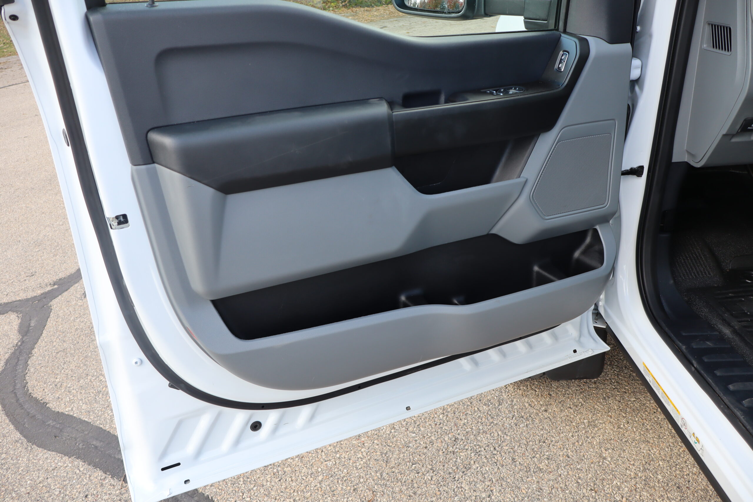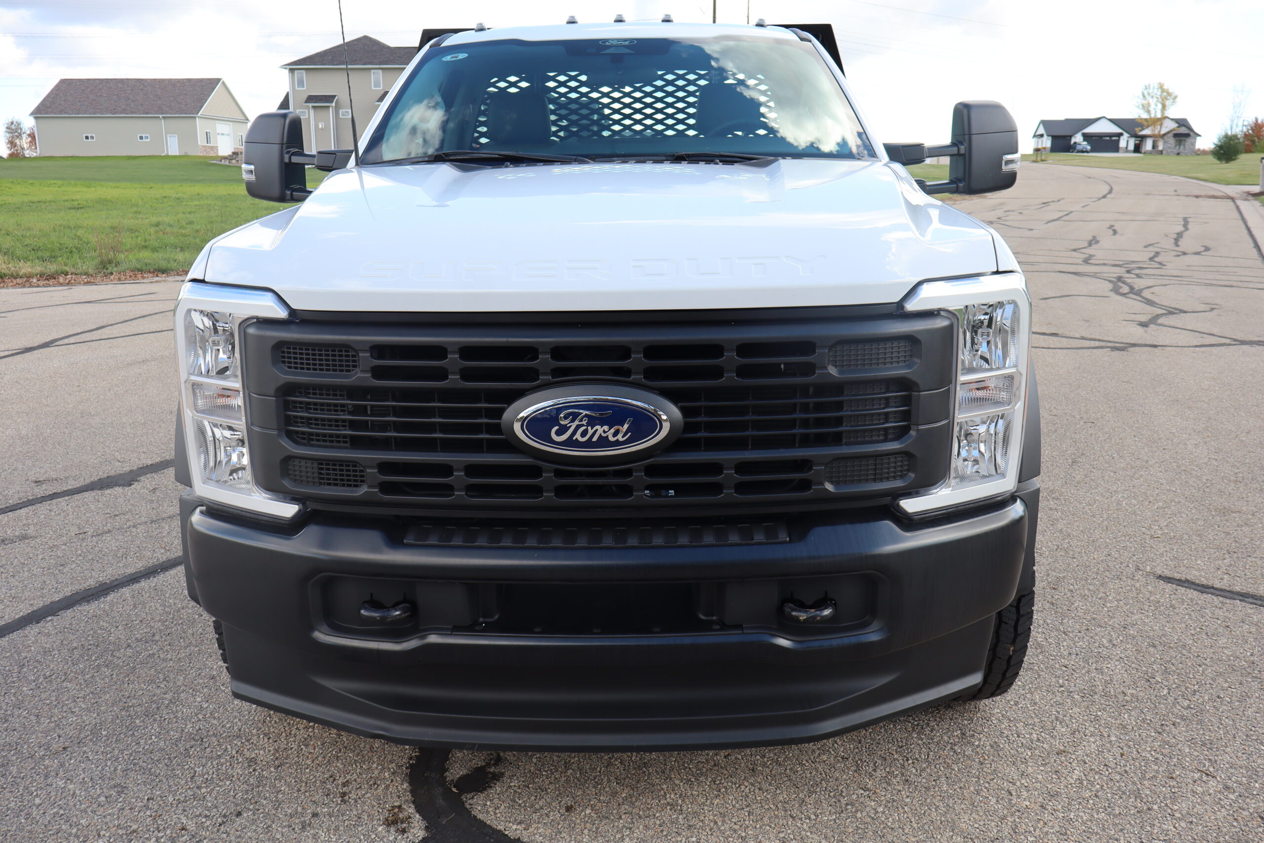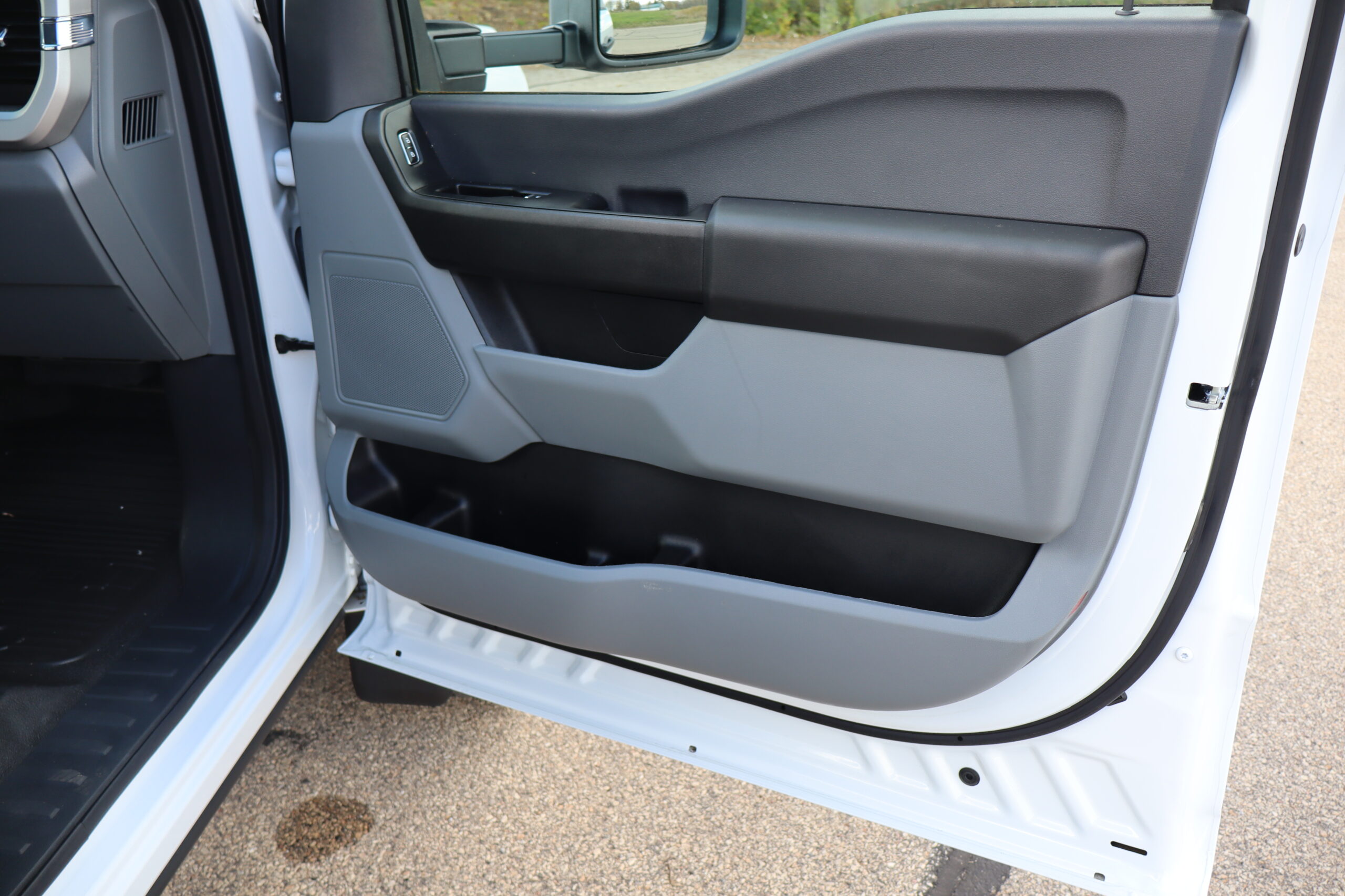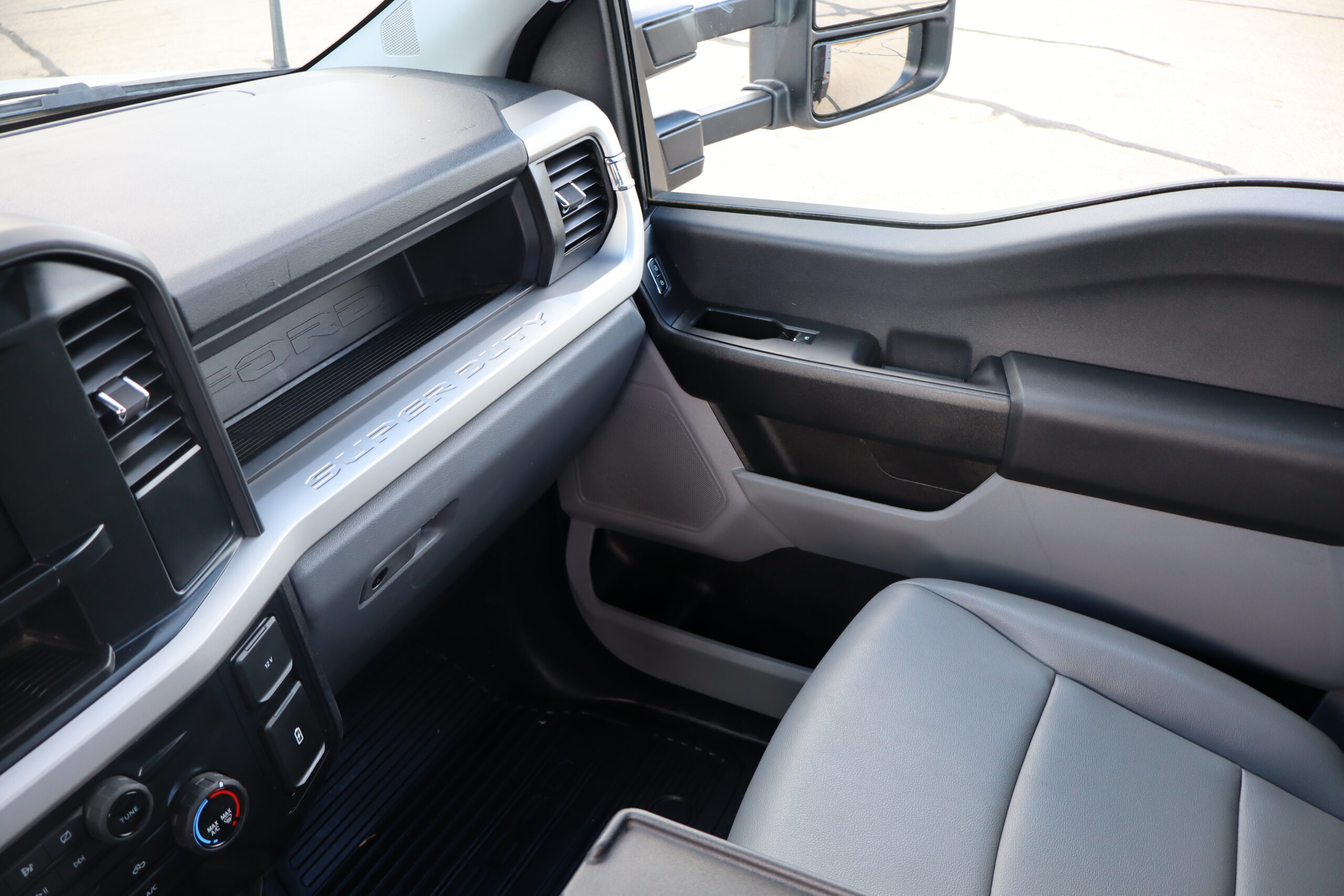 Exterior is Oxford White, Interior is Medium Earth Gray heavy duty vinyl, 40/20/40 seating in front with folding arm rest with dual built in storage compartments, traction control, power windows and power door locks, tilt and telescoping wheel, cruise control, air conditioning, Bluetooth, multi-plug power point, SYNC 4 with 8″ touch screen, multi-function steering wheel controls, compass/temperature/mileage display in dash, day/night rear view mirror, remote entry, side air bags, power/heated expandable tow mirrors, cab clearance lights, tow package with receiver and wiring, up-fitter switches and trailer wiring.