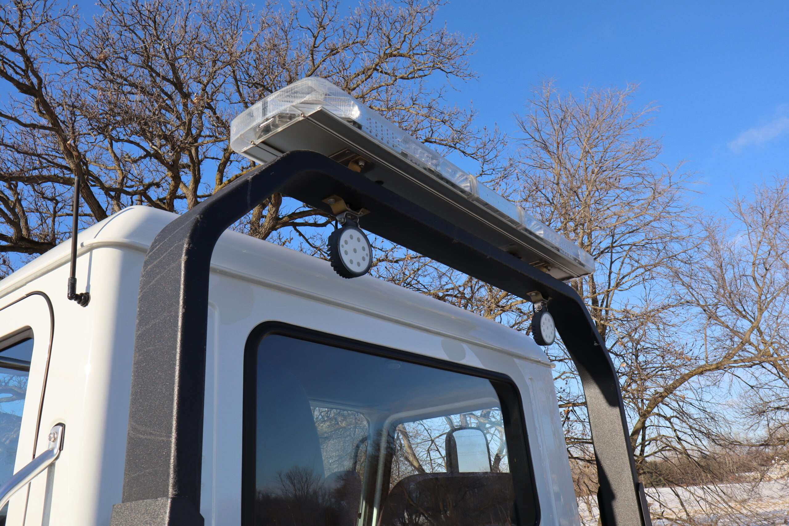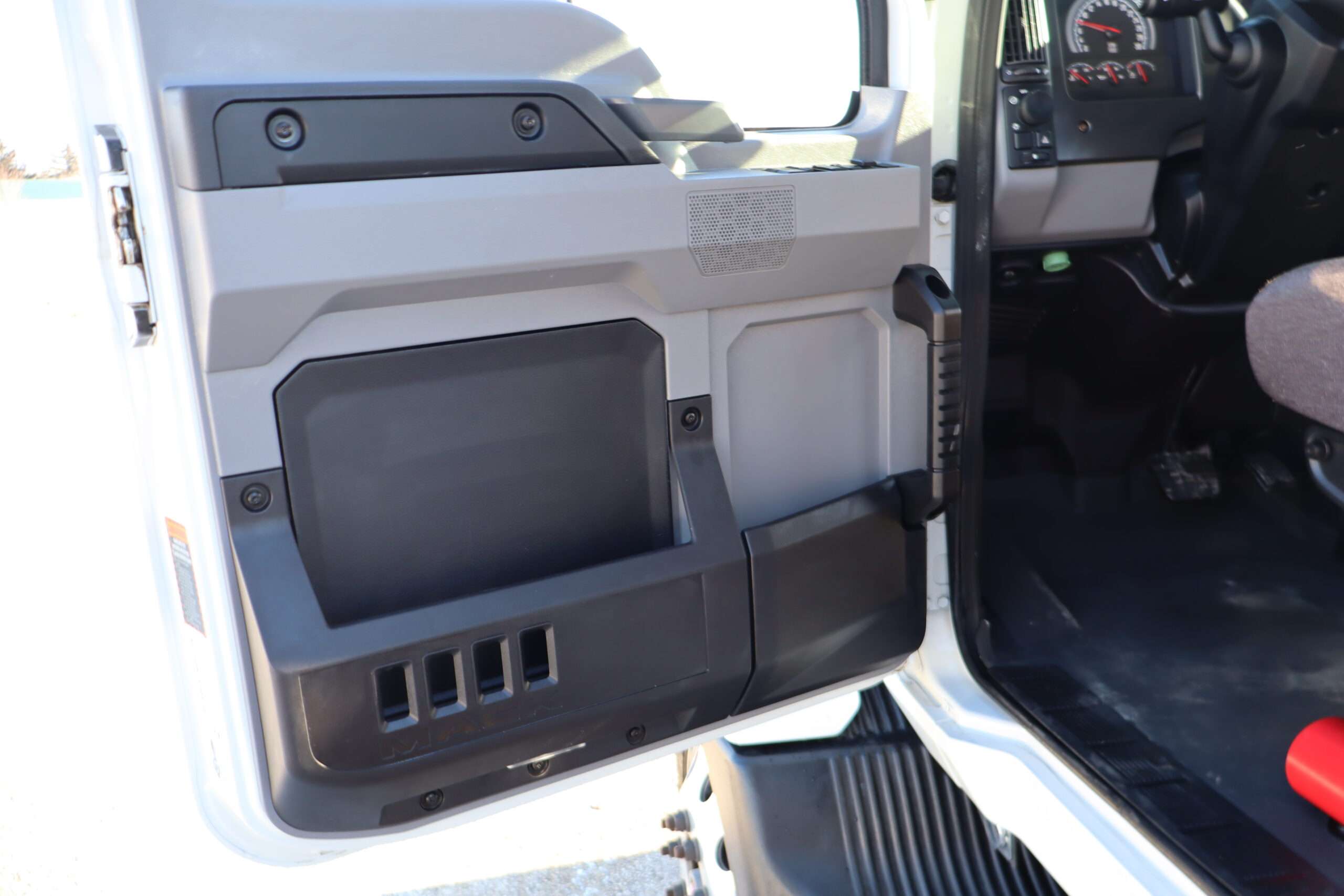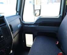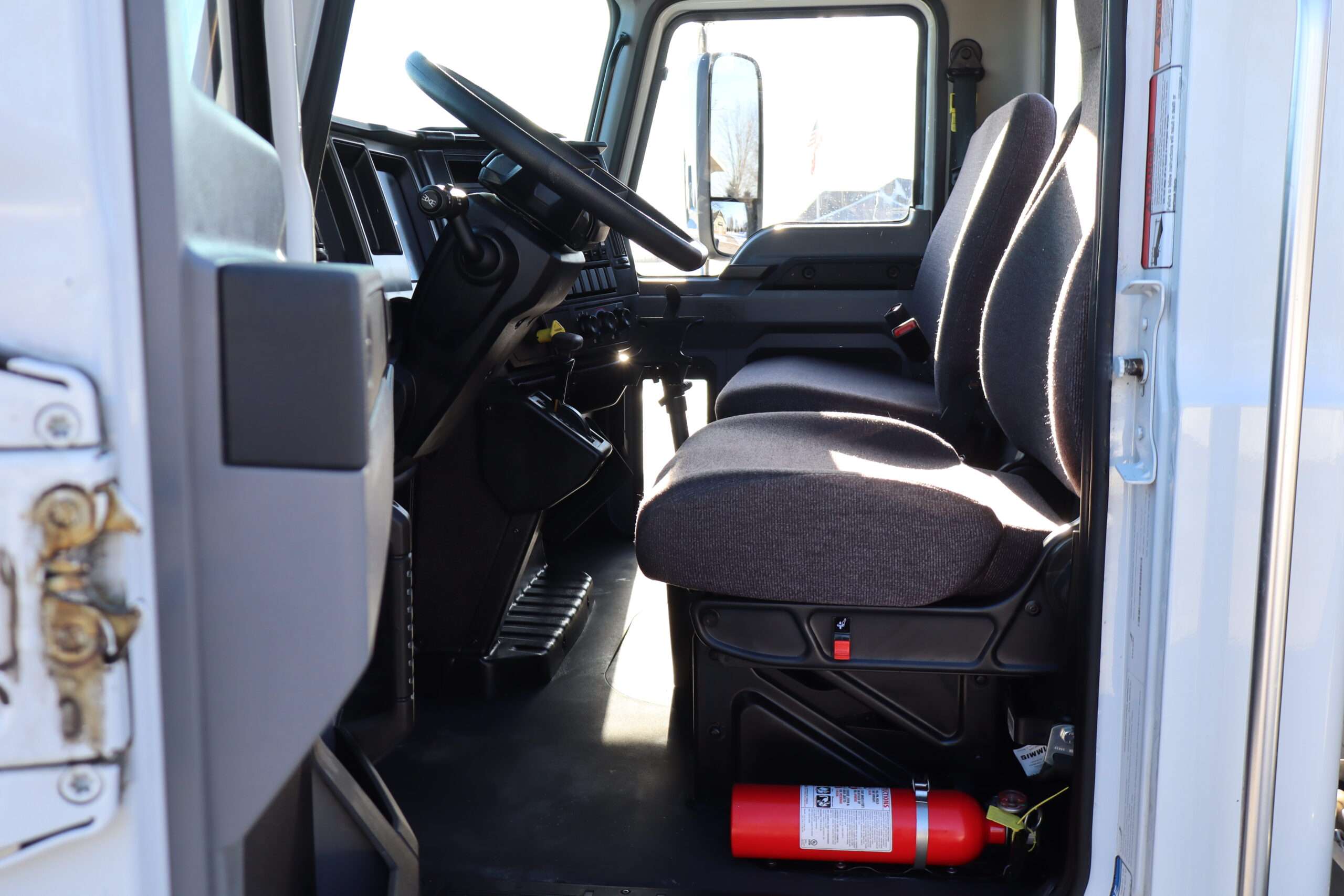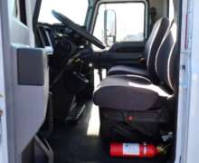 Exterior is White, Interior is Dark Gray cloth, 40/20/40 seats with folding under seat storage compartment, National air ride driver’s seat, power windows and power door locks, tilt steering wheel, cruise control, back up camera, cruise control, air conditioning, AM/FM stereo, Weather Band, Bluetooth, compass/temperature/mileage display in dash, traction control, up-fitter switches, back up camera, glove boxes, power/heated manual folding tow mirrors, cab clearance lights, chrome front bumper and grill, power take off, tow package, dual batteries and 47 gallon aluminum fuel tank.