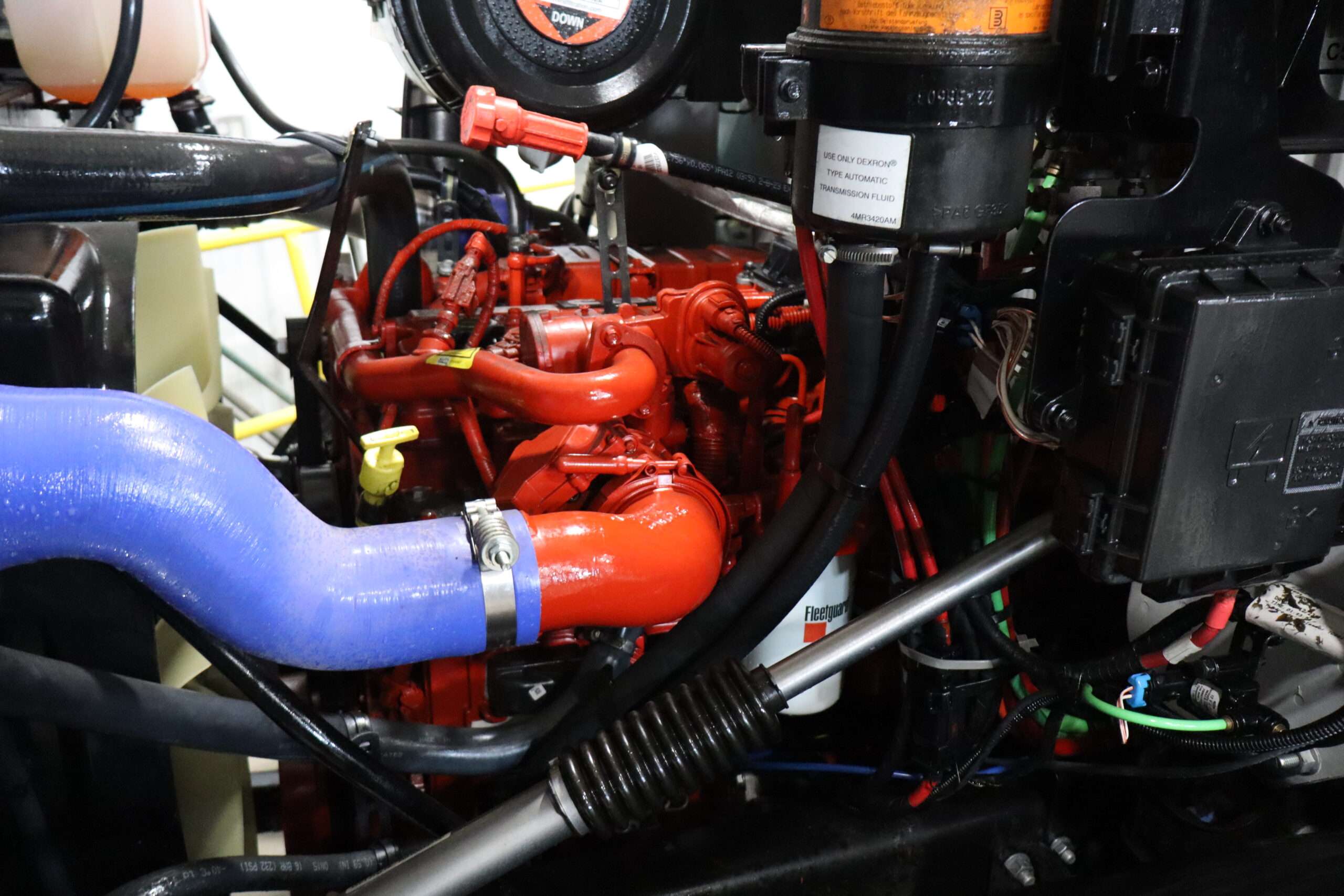 Motor is a 6.7L Cummins Turbo Diesel, 300HP, Allison 5-speed automatic transmission with optional tap shift, RWD, exhaust brake, locking rear axle, 4.88 axle ratio, 122″ wheel base, air ride suspension, 22.5″ Accuride polished Alloys, New 255/70R22.5 Bridgestone Load Range H tires.