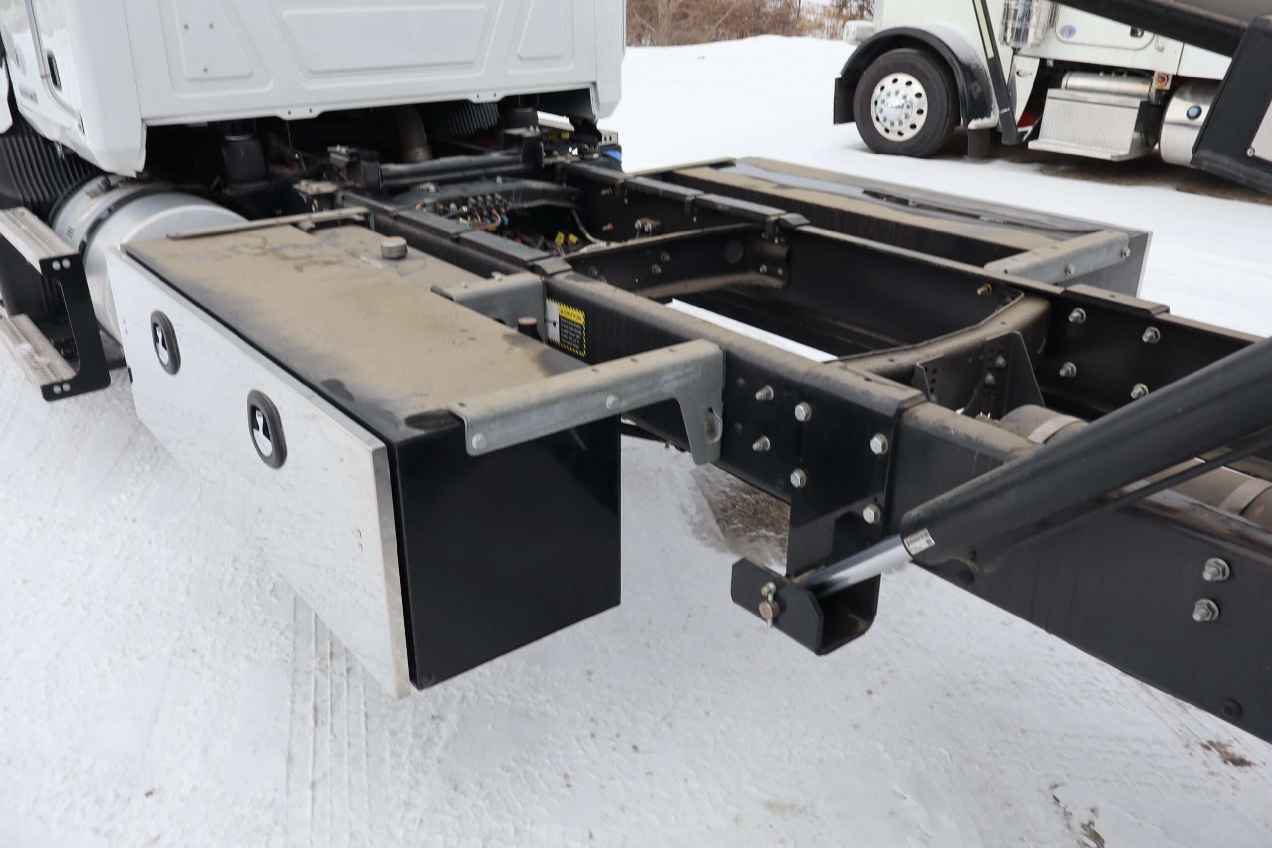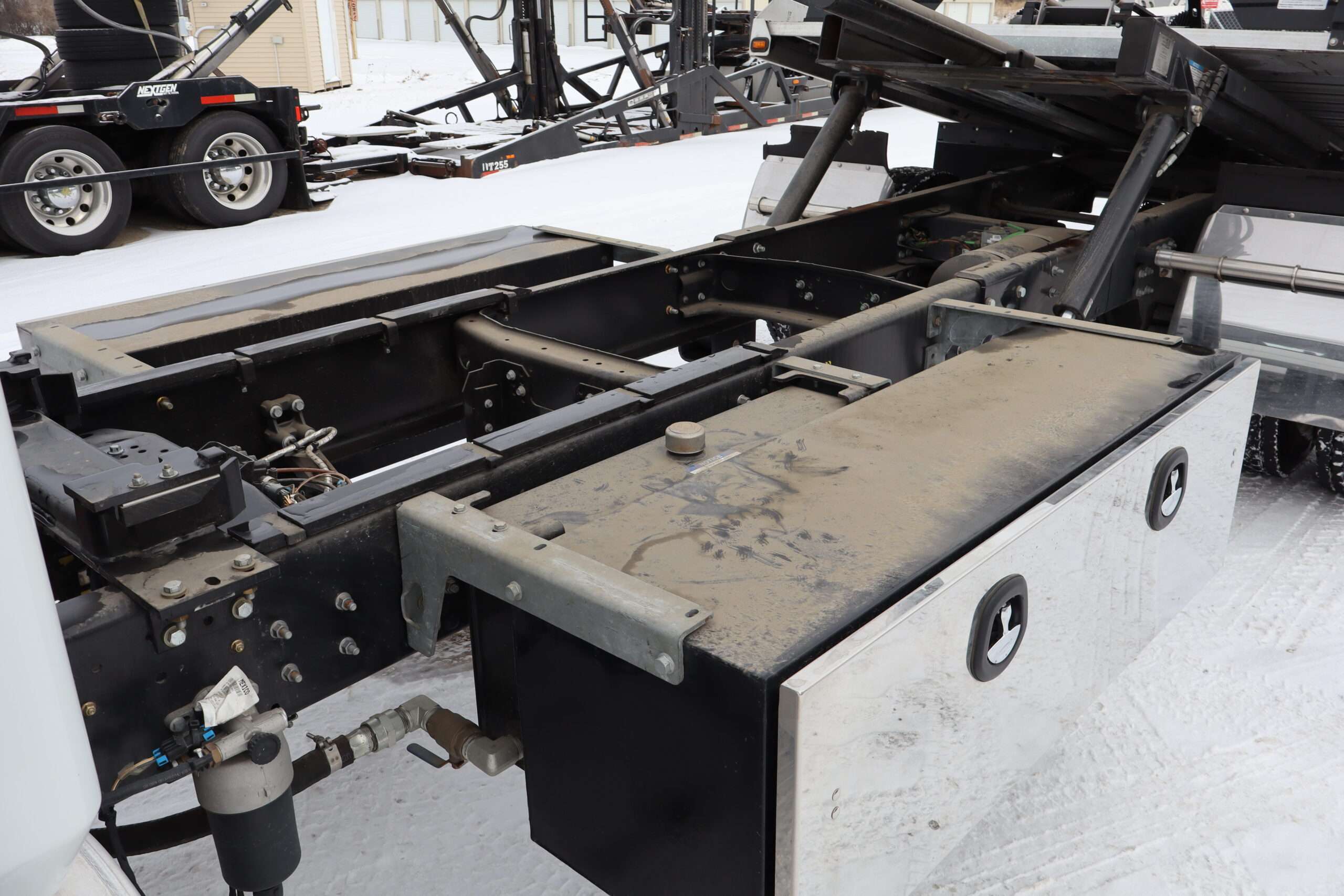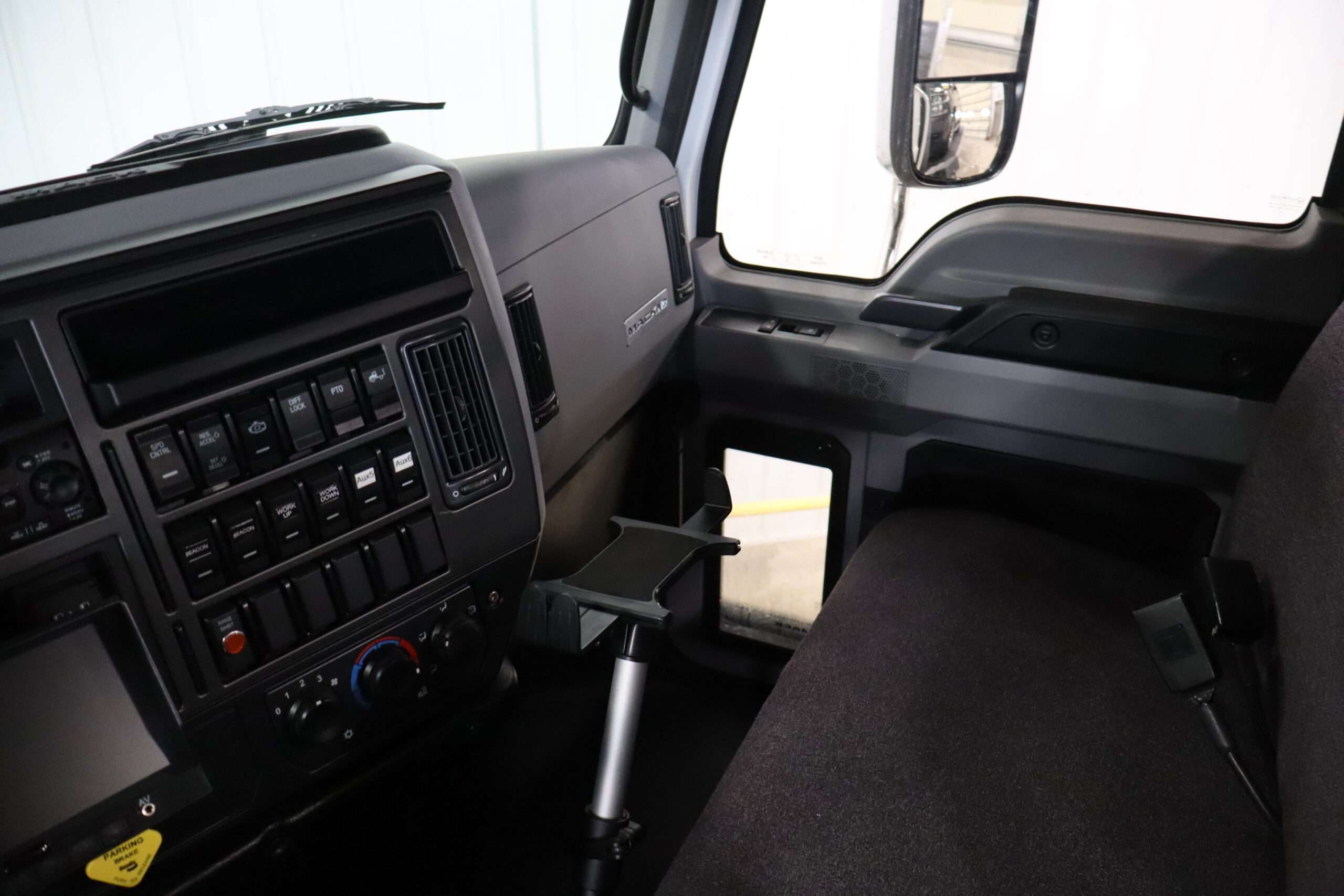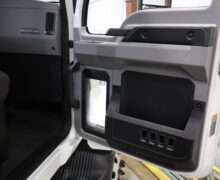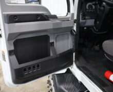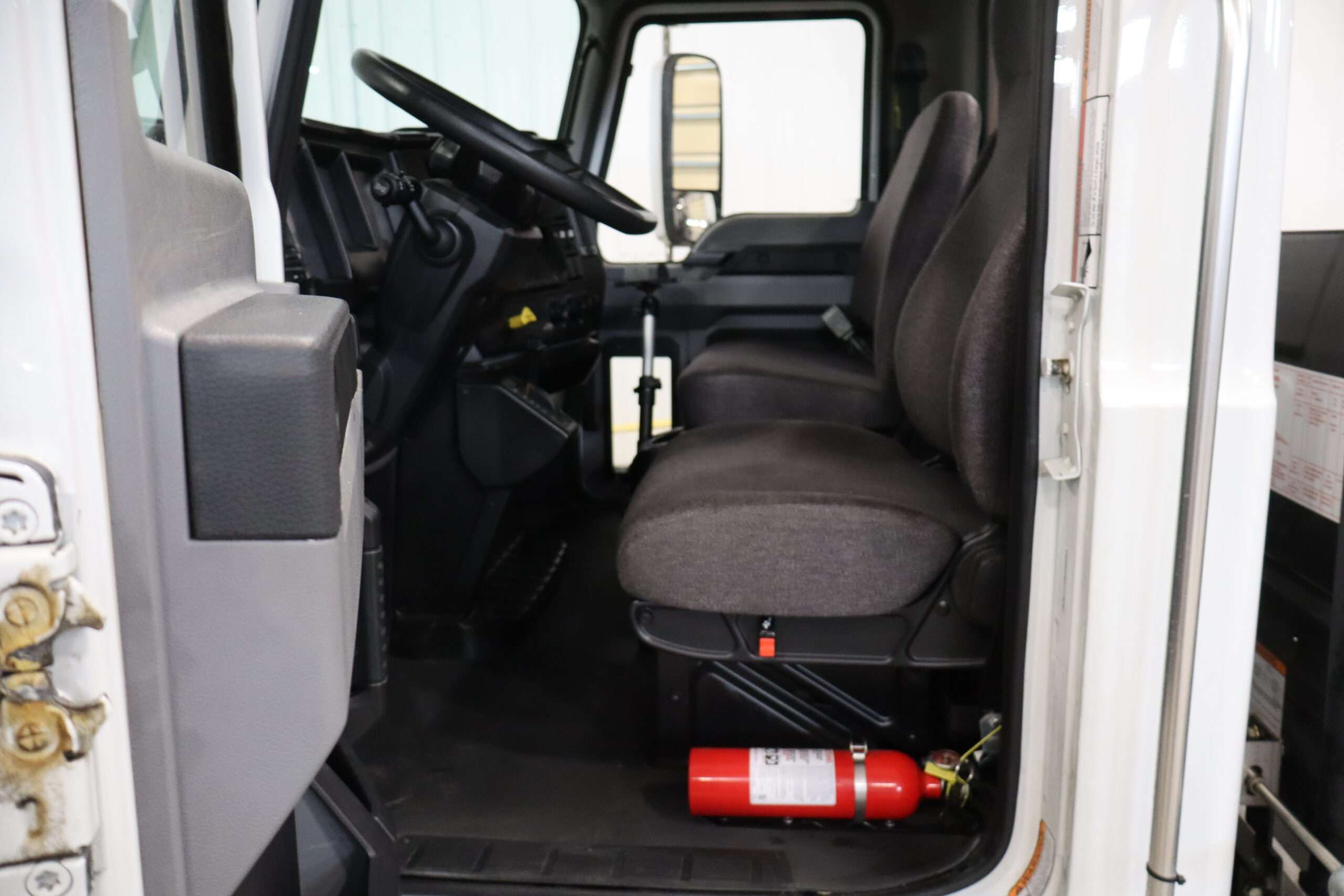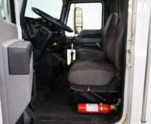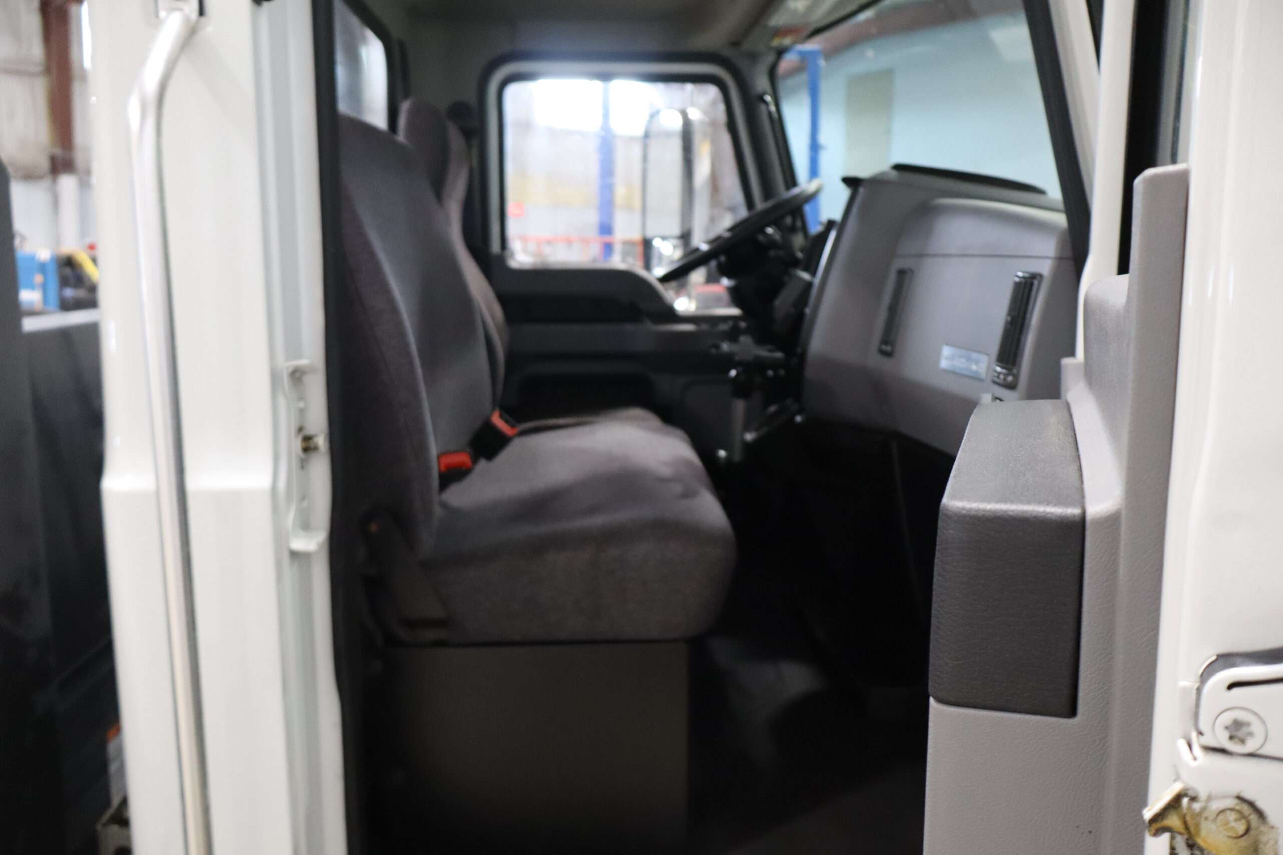 Exterior is White, Interior is Dark Gray cloth, 40/20/40 seats with folding under seat storage compartment, National air ride driver’s seat, power windows and power door locks, tilt steering wheel, cruise control, back up camera, cruise control, air conditioning, AM/FM stereo, Weather Band, Bluetooth, compass/temperature/mileage display in dash, traction control, up-fitter switches, back up camera, glove boxes, power/heated manual folding tow mirrors, cab clearance lights, chrome front bumper and grill, power take off, tow package, dual batteries and 47 gallon aluminum fuel tank.