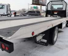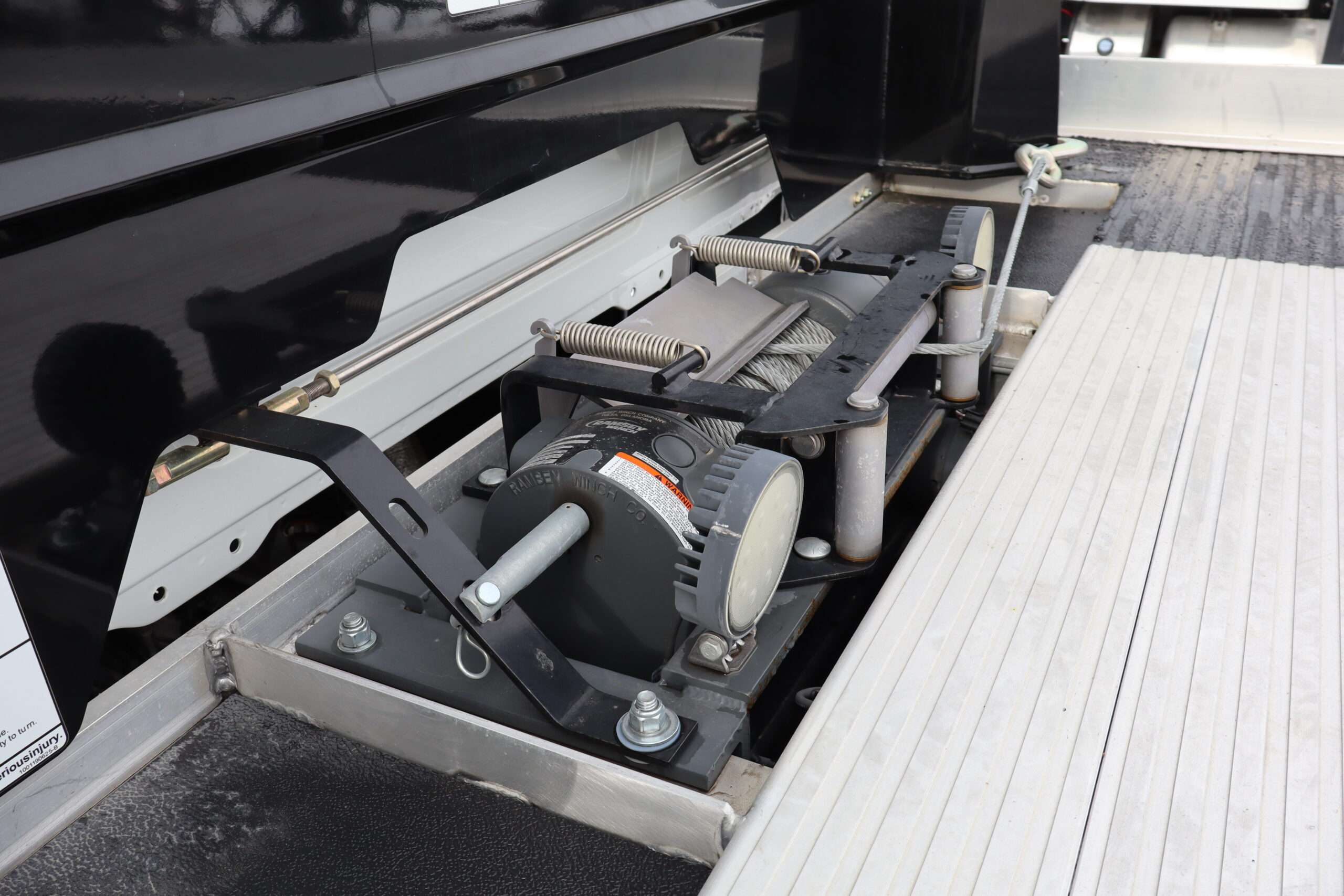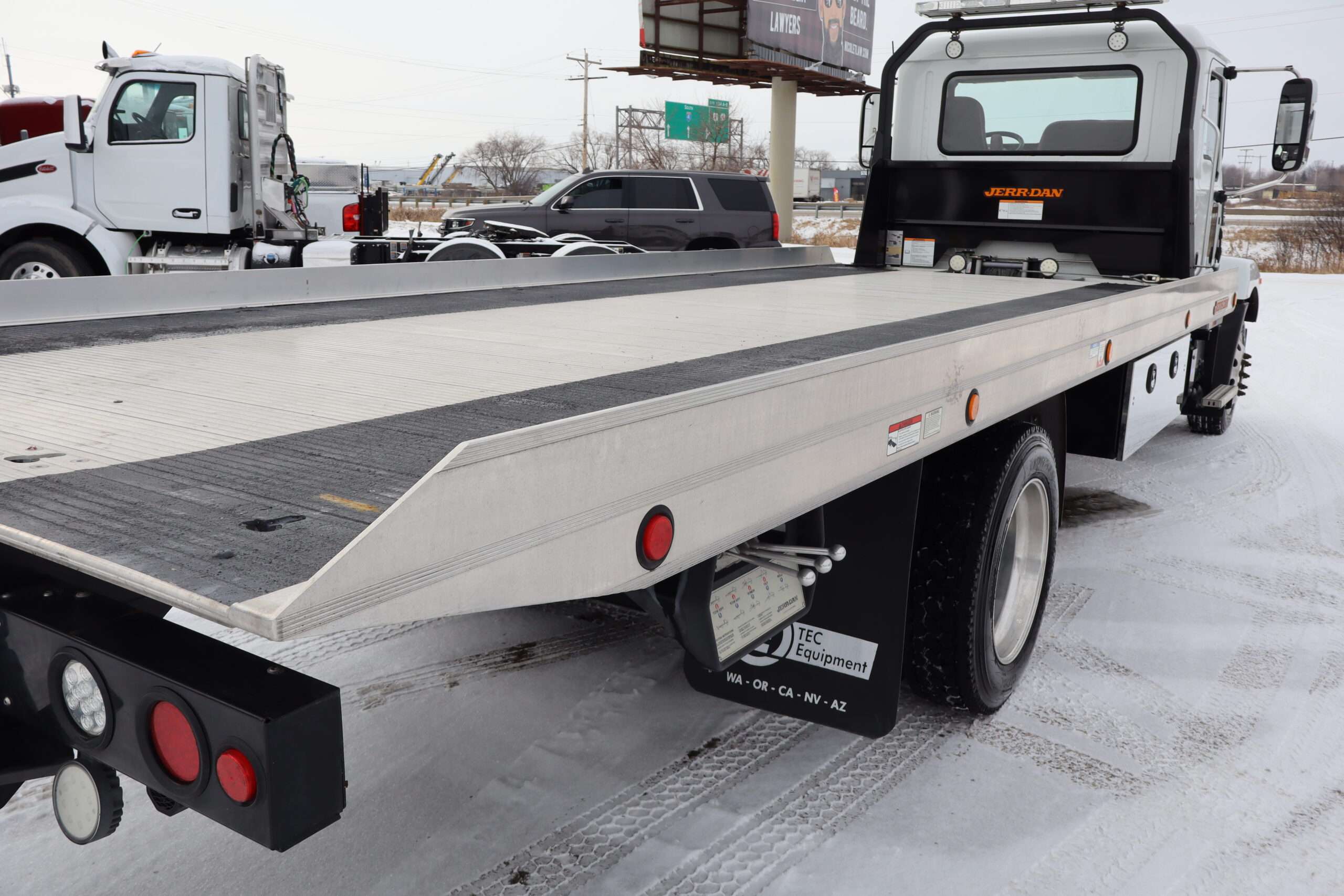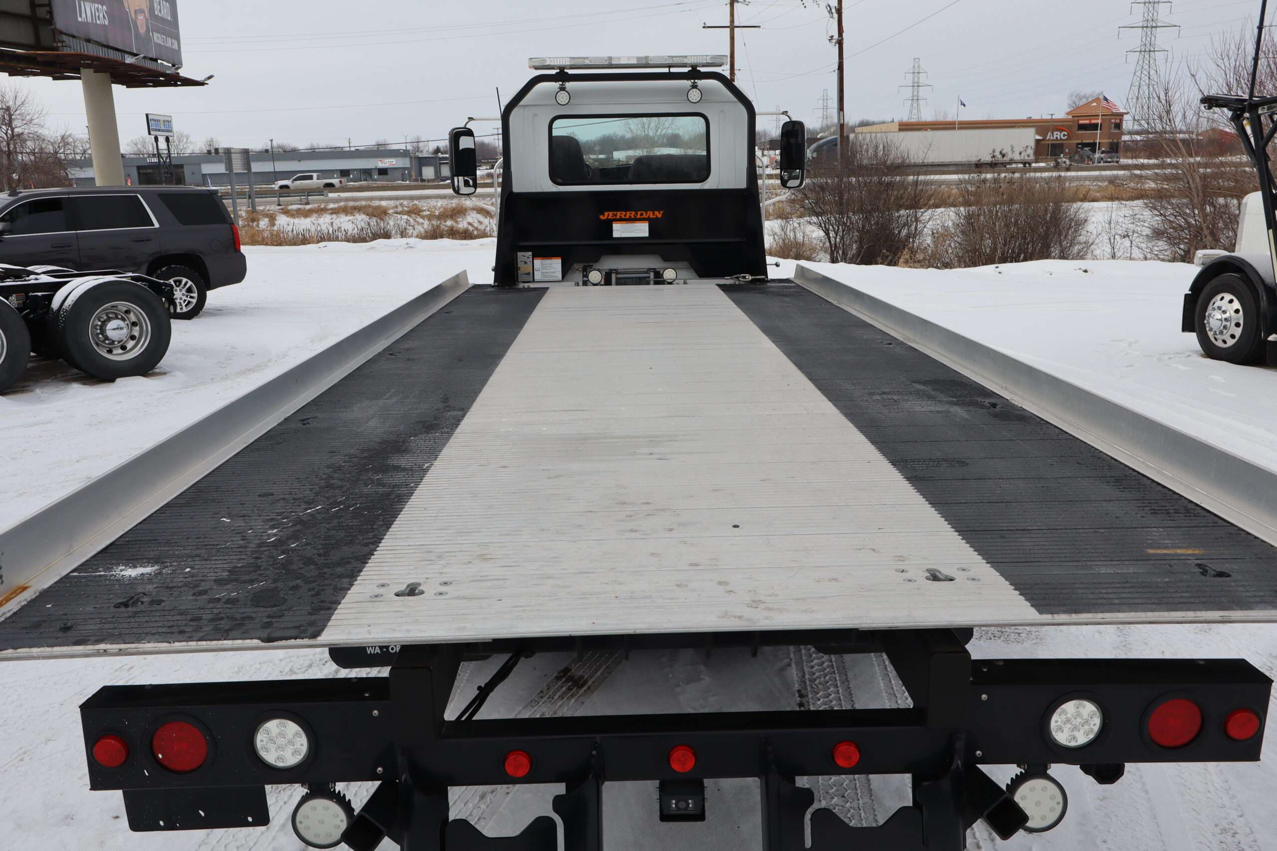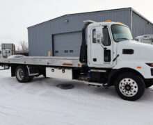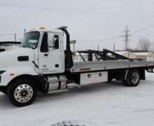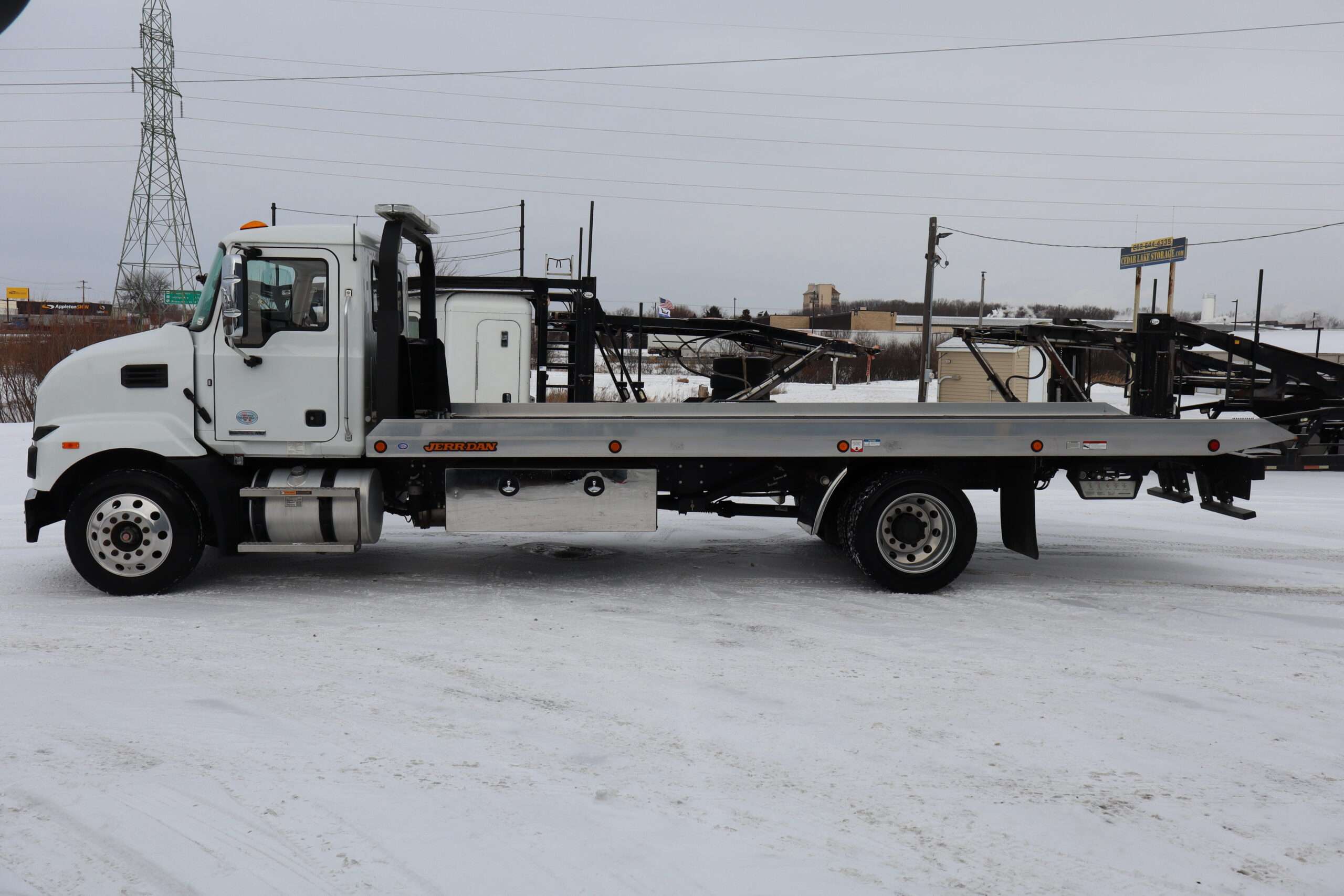 EXTRAS: 22′ Jerr-Dan aluminum bed with Ramsey hydraulic winch, 2 under body tool boxes with polished stainless doors, 5’x18″x18″ Led work lights and light bar.