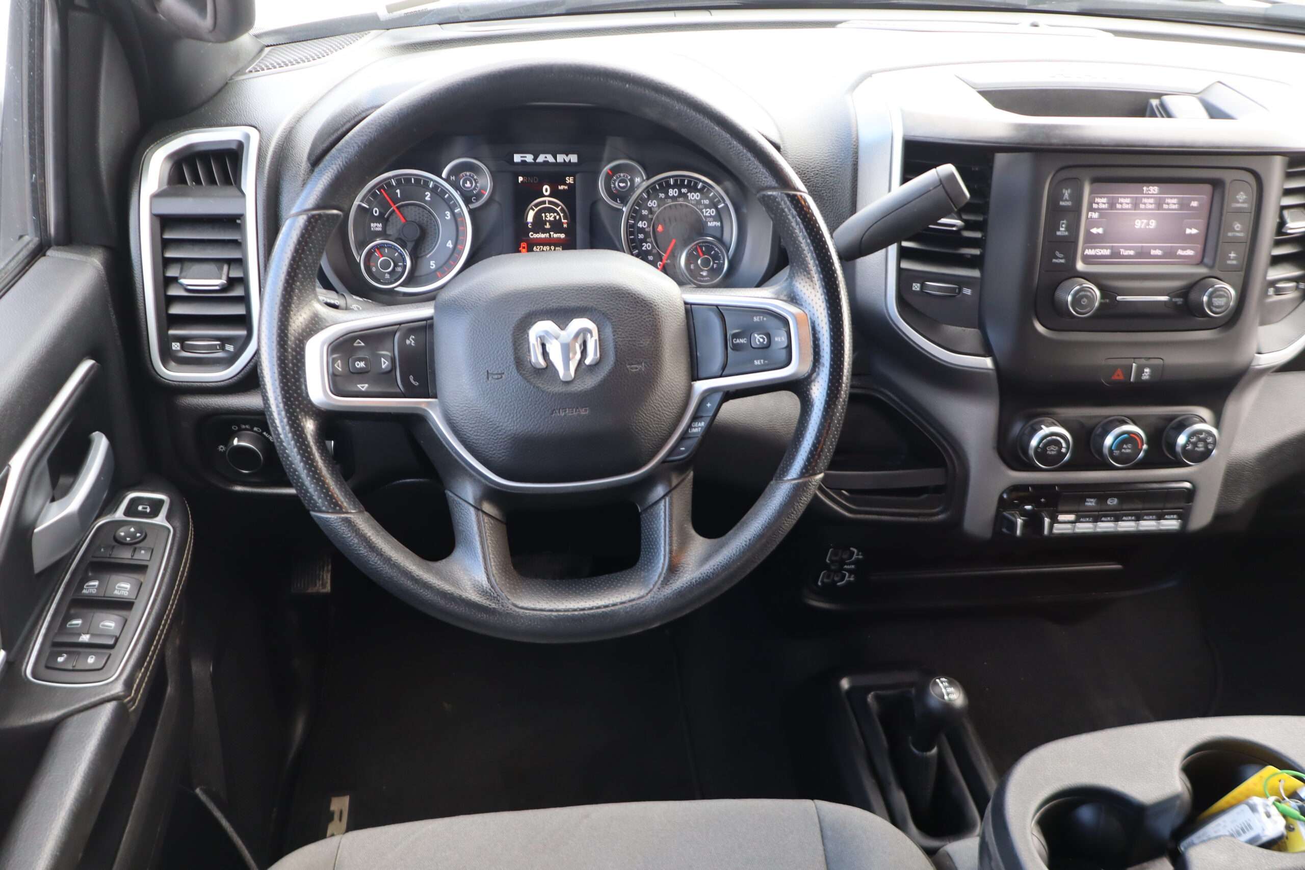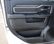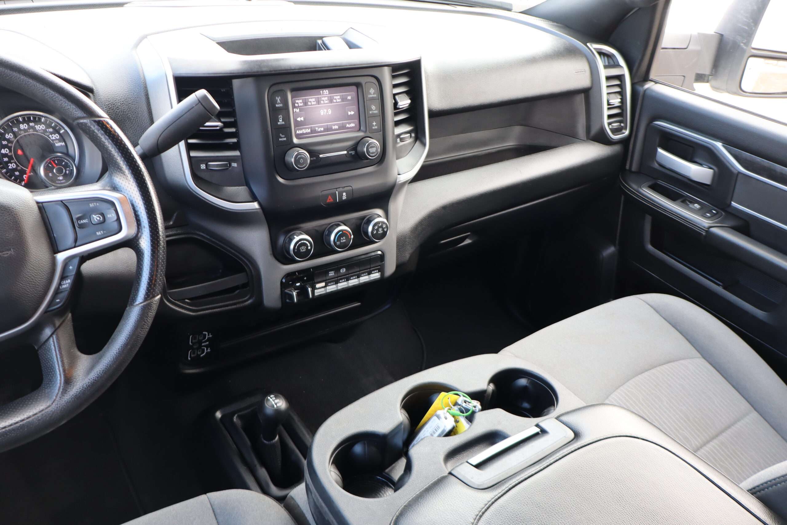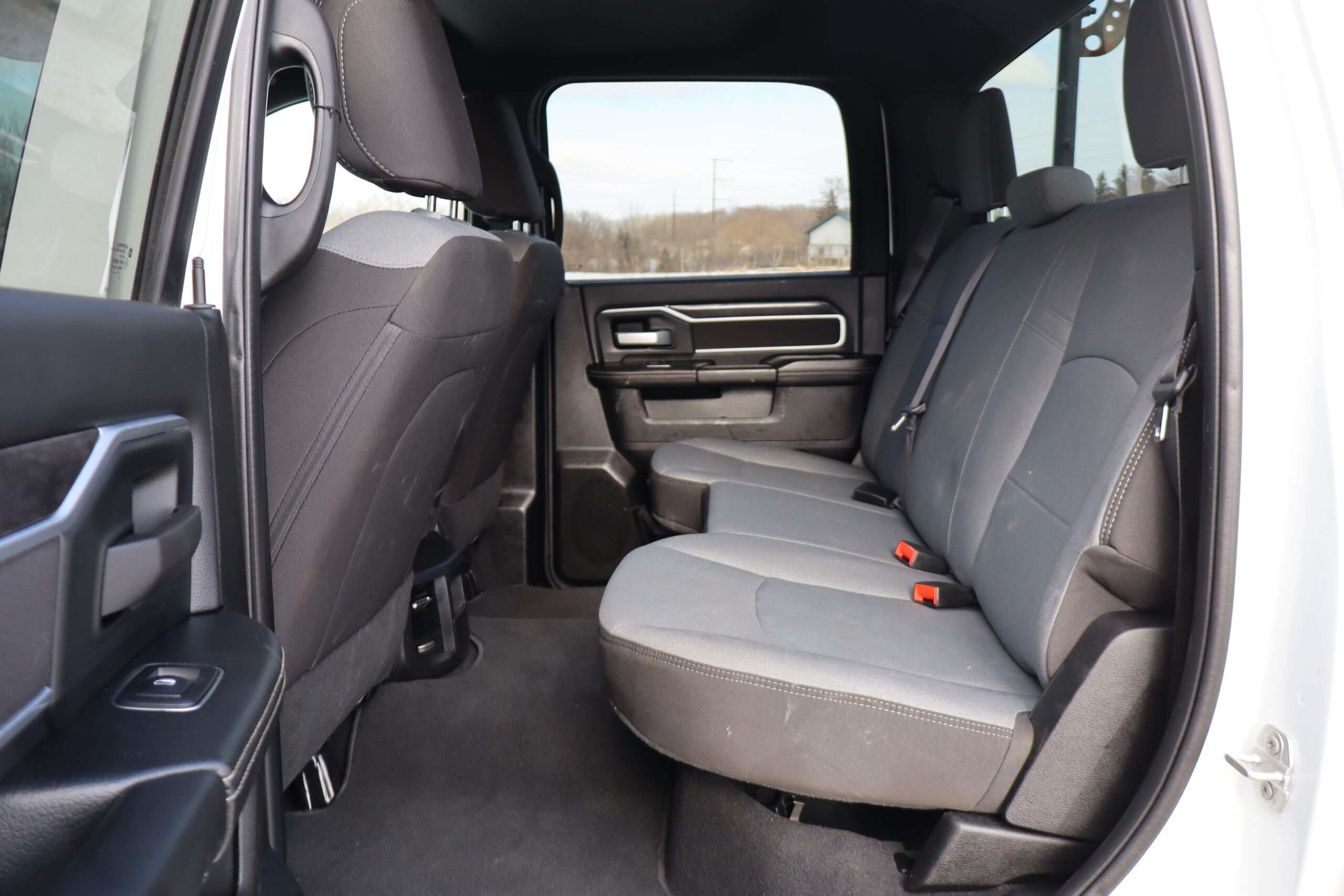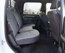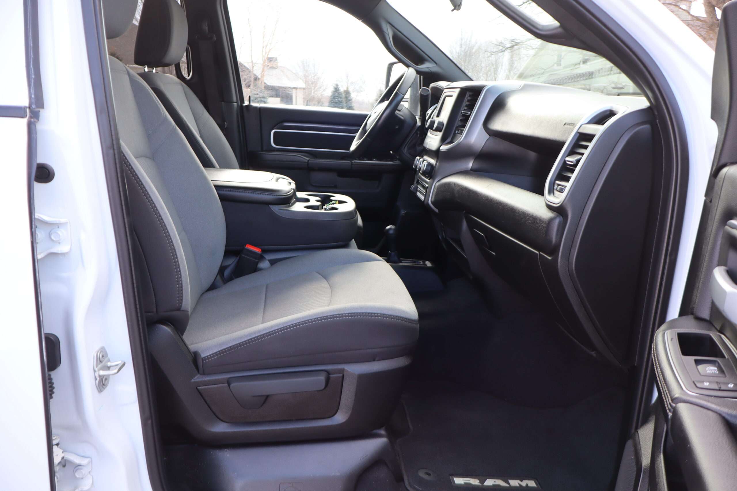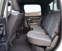 Exterior is Bright White, Interior is Black and Diesel Gray cloth, 40/20/40 front seating with folding arm rest with built in storage compartment, folding bench in rear with under storage compartment, power windows and power power door locks, U-connect 3 with 5″ touch screen, Apple Car Play, Android Auto, AM/FM stereo, XM satellite radio capabilities, AUX jack, USB jack, keyless entry GO, steering wheel controls, tilt, cruise control, air conditioning, side curtain air bags, compass and outside temperature display in dash, dark rear tinted glass, automatic headlights, cab clearance lights, day/night rear view mirror, AUX switches, power/heated folding tow mirrors with puddle lights, All Weather floor mats, chrome front bumper and grille, 5″ black tubular side steps, tow package with integrated brake controller.