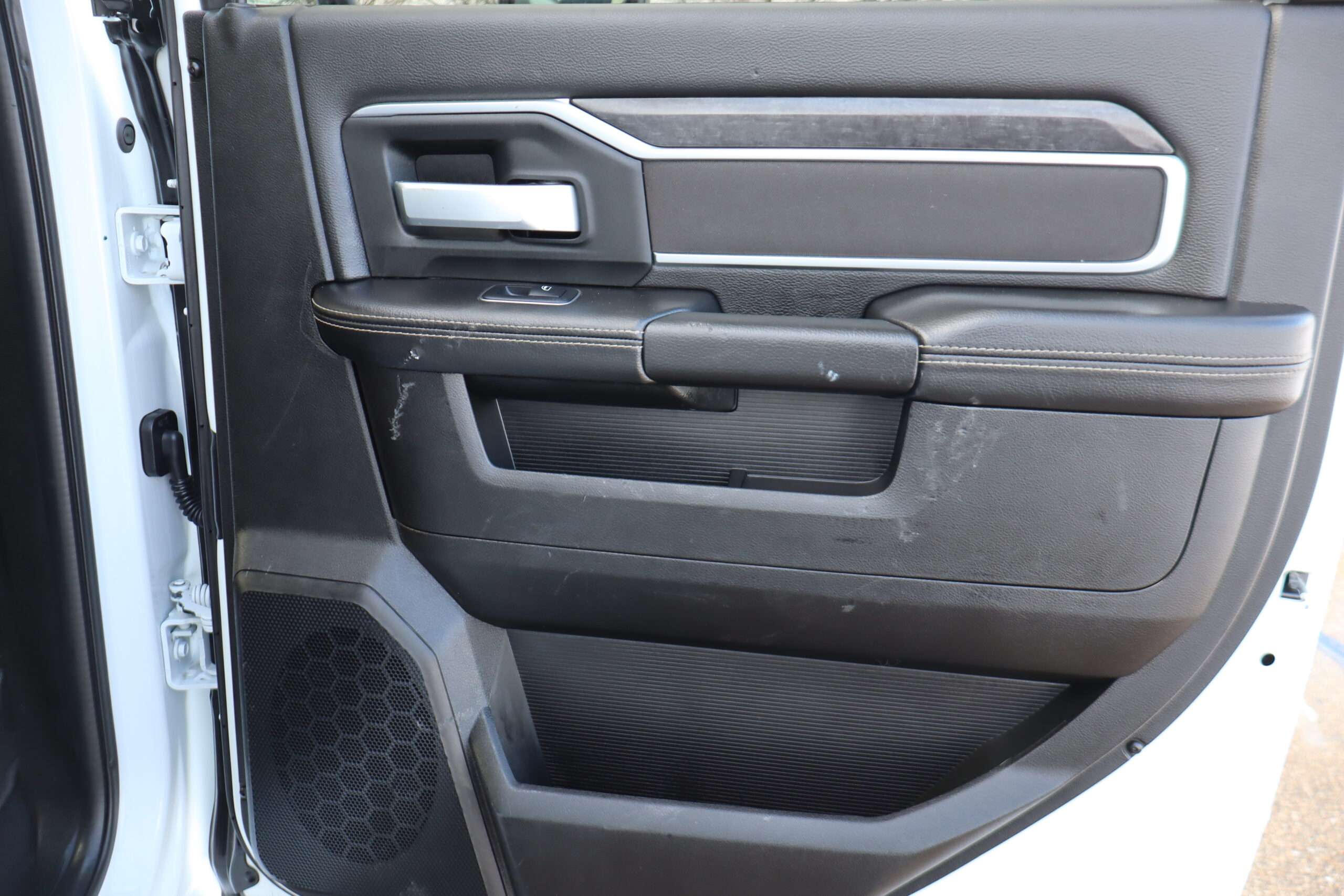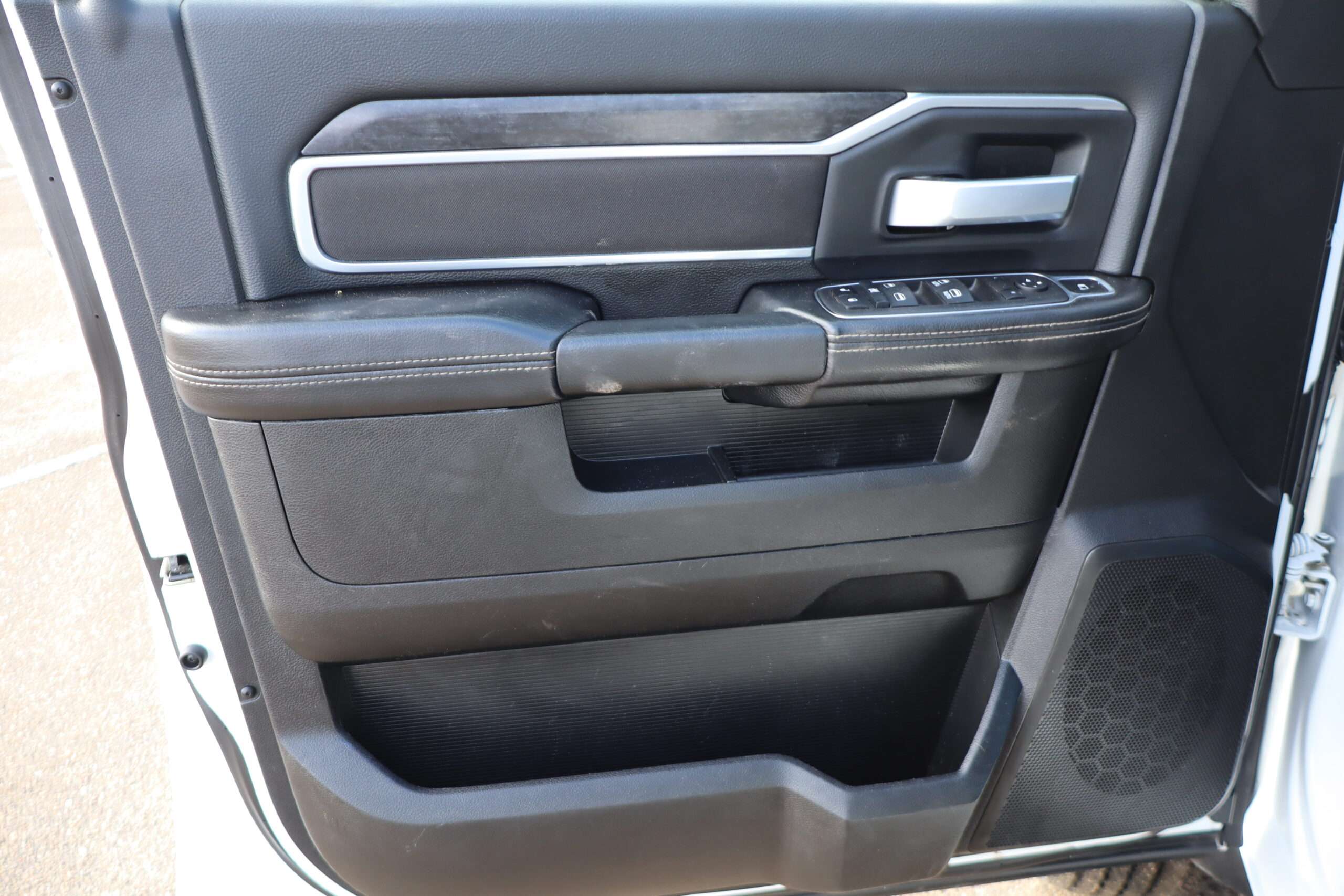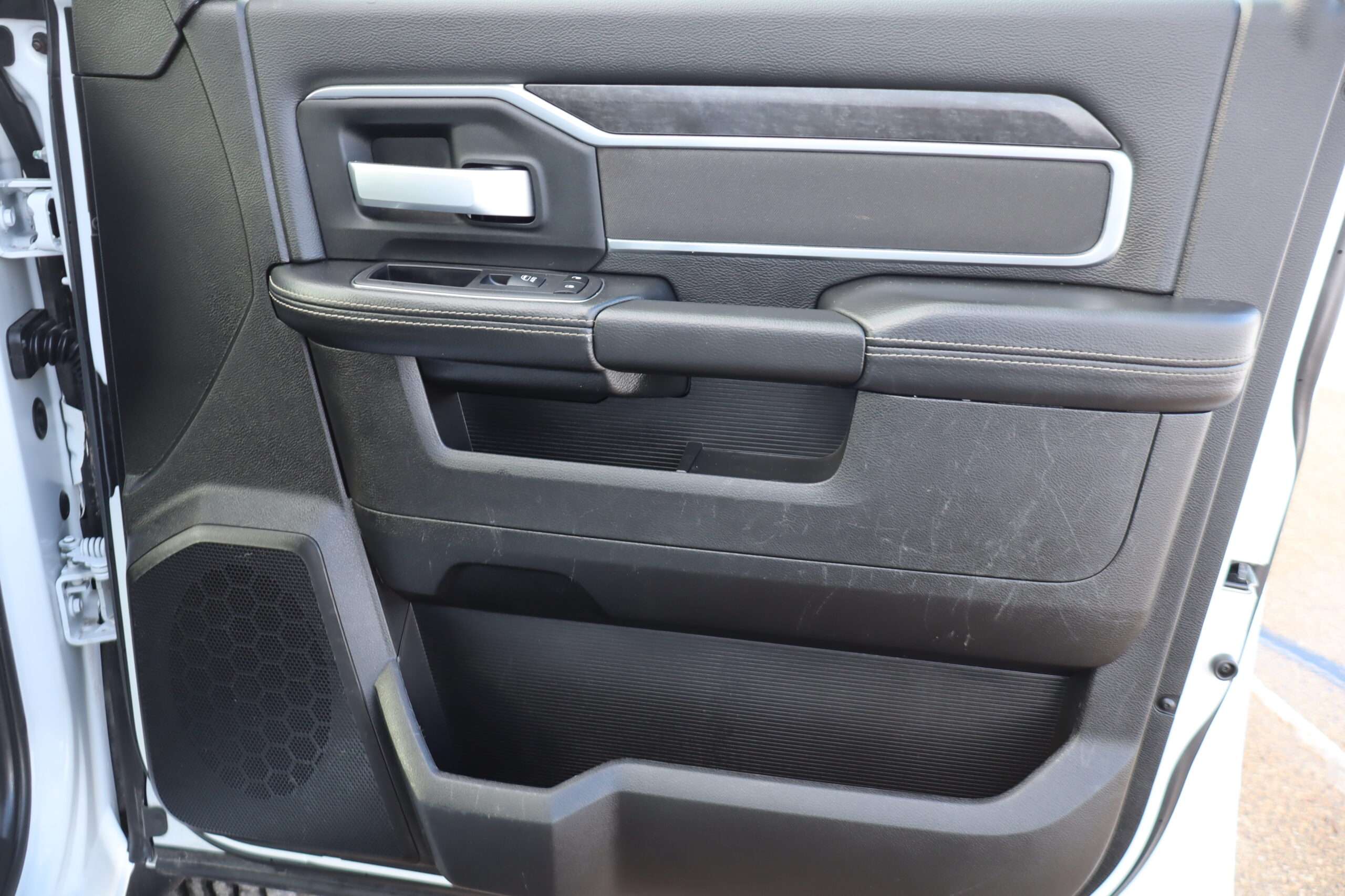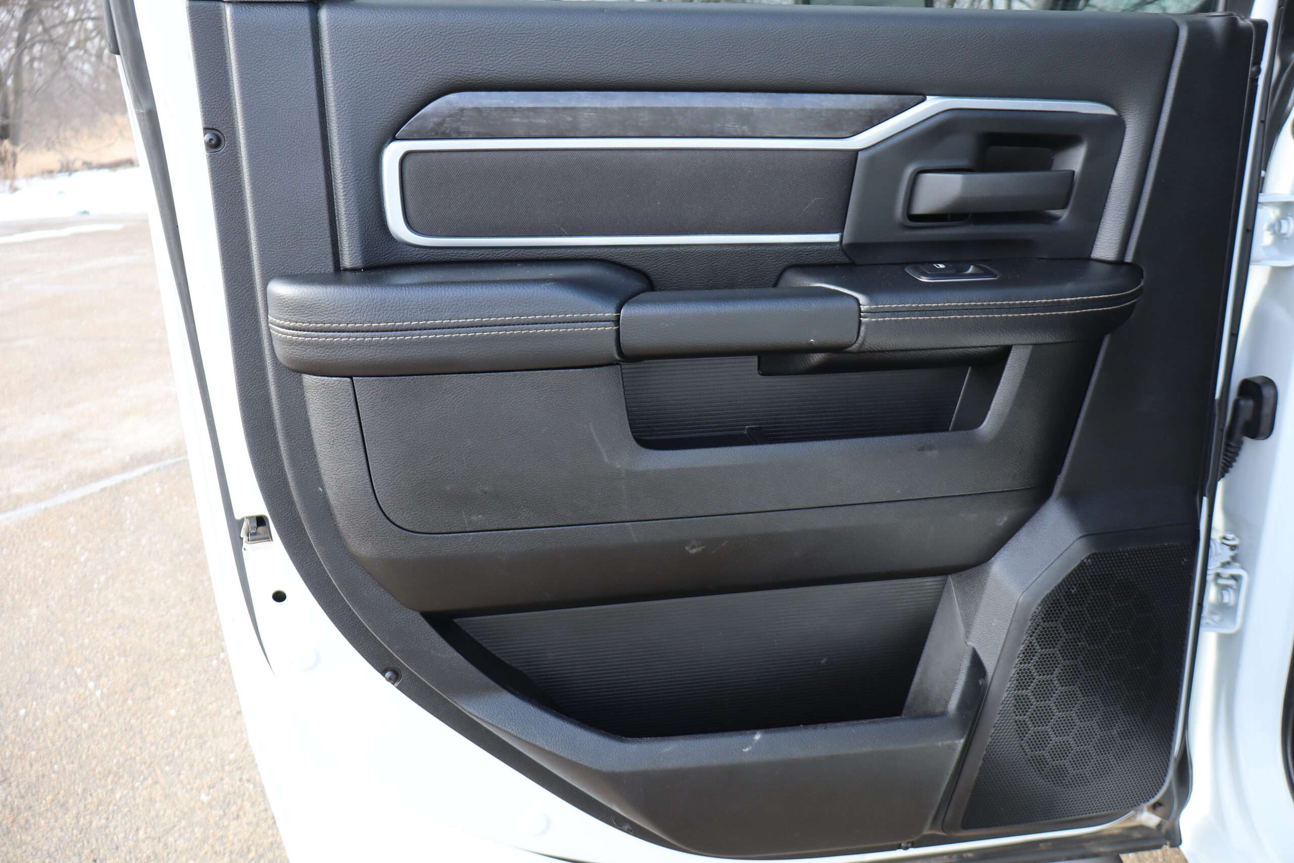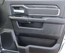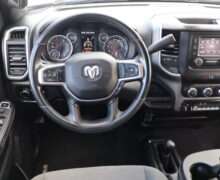 Exterior is Bright White, Interior is Black and Diesel Gray cloth, 40/20/40 front seating with folding arm rest with built in storage compartment, folding bench in rear with under storage compartment, power windows and power power door locks, U-connect 3 with 5″ touch screen, Apple Car Play, Android Auto, AM/FM stereo, XM satellite radio capabilities, AUX jack, USB jack, keyless entry GO, steering wheel controls, tilt, cruise control, air conditioning, side curtain air bags, compass and outside temperature display in dash, dark rear tinted glass, automatic headlights, cab clearance lights, day/night rear view mirror, AUX switches, power/heated folding tow mirrors with puddle lights, All Weather floor mats, chrome front bumper and grille, 5″ black tubular side steps, tow package with integrated brake controller.